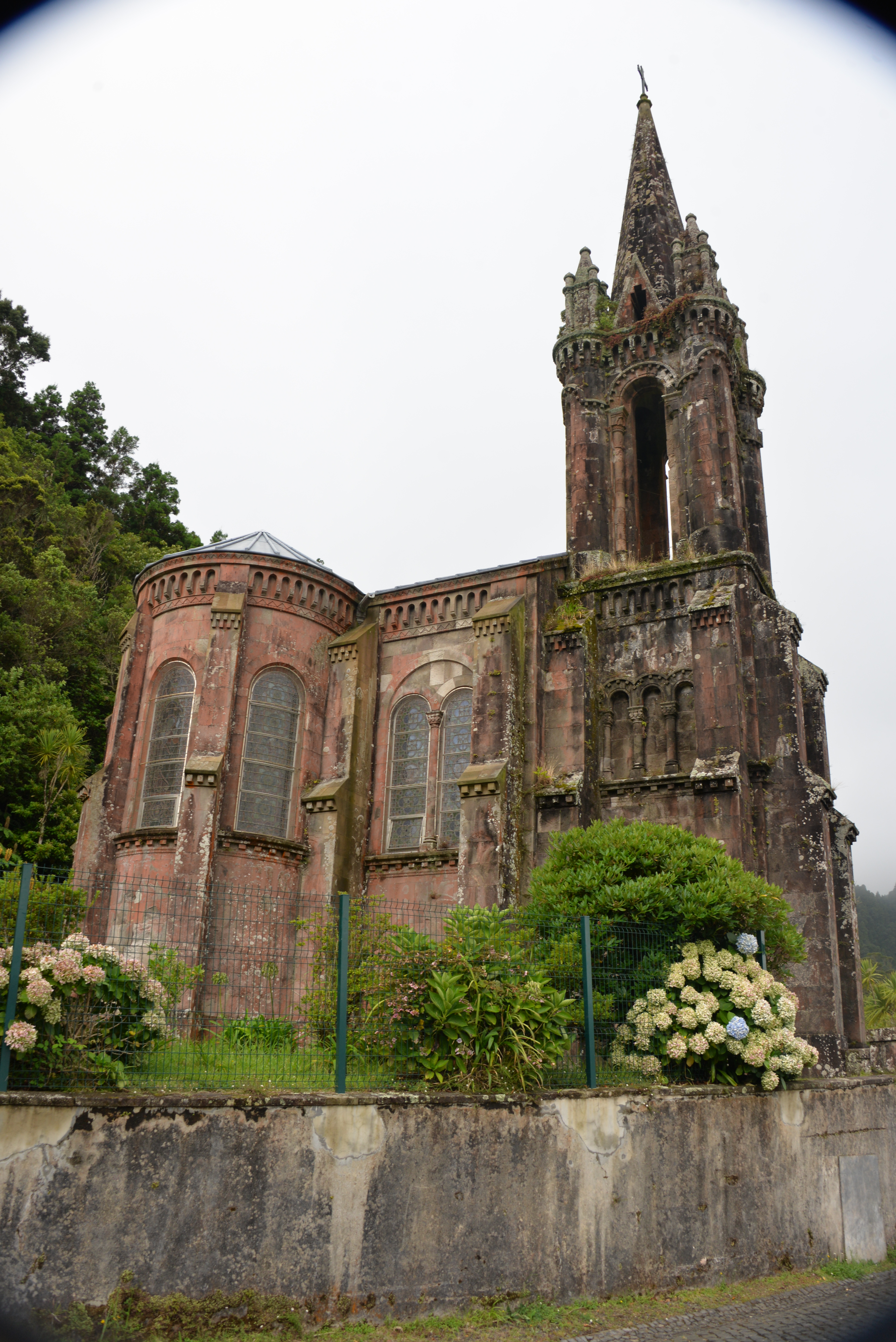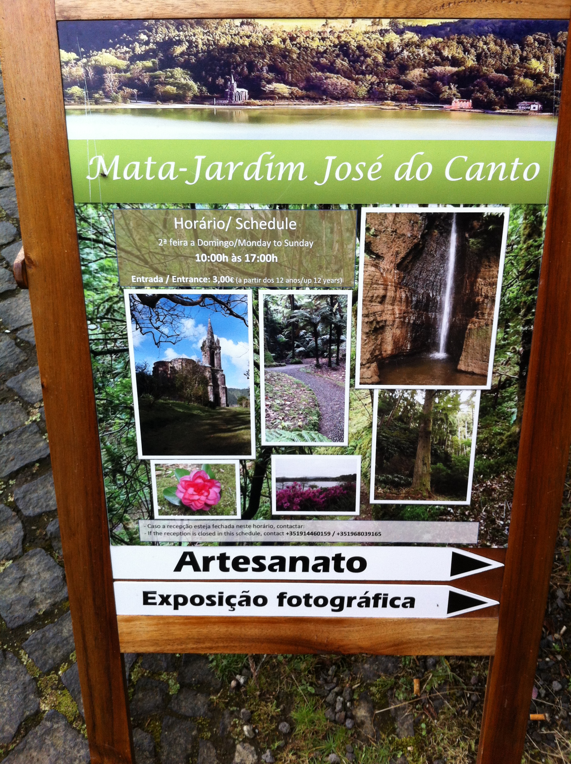 We start at the parking lot. A bit further you pass a small church, the chapel of Nossa Senhora das Vitoria. A short walk further you can enter the Jardim José do Canto, a forest garden with one of the largest collections of ancient camelias ( which are not in bloom in August) , and you can make a walk to to the natural waterfall of Salto do Rosal. On the way you pass a large Oak and many beautiful trees, ferns and flowers. At the entrance they are willing to give you an explanation on the different plants of the garden.