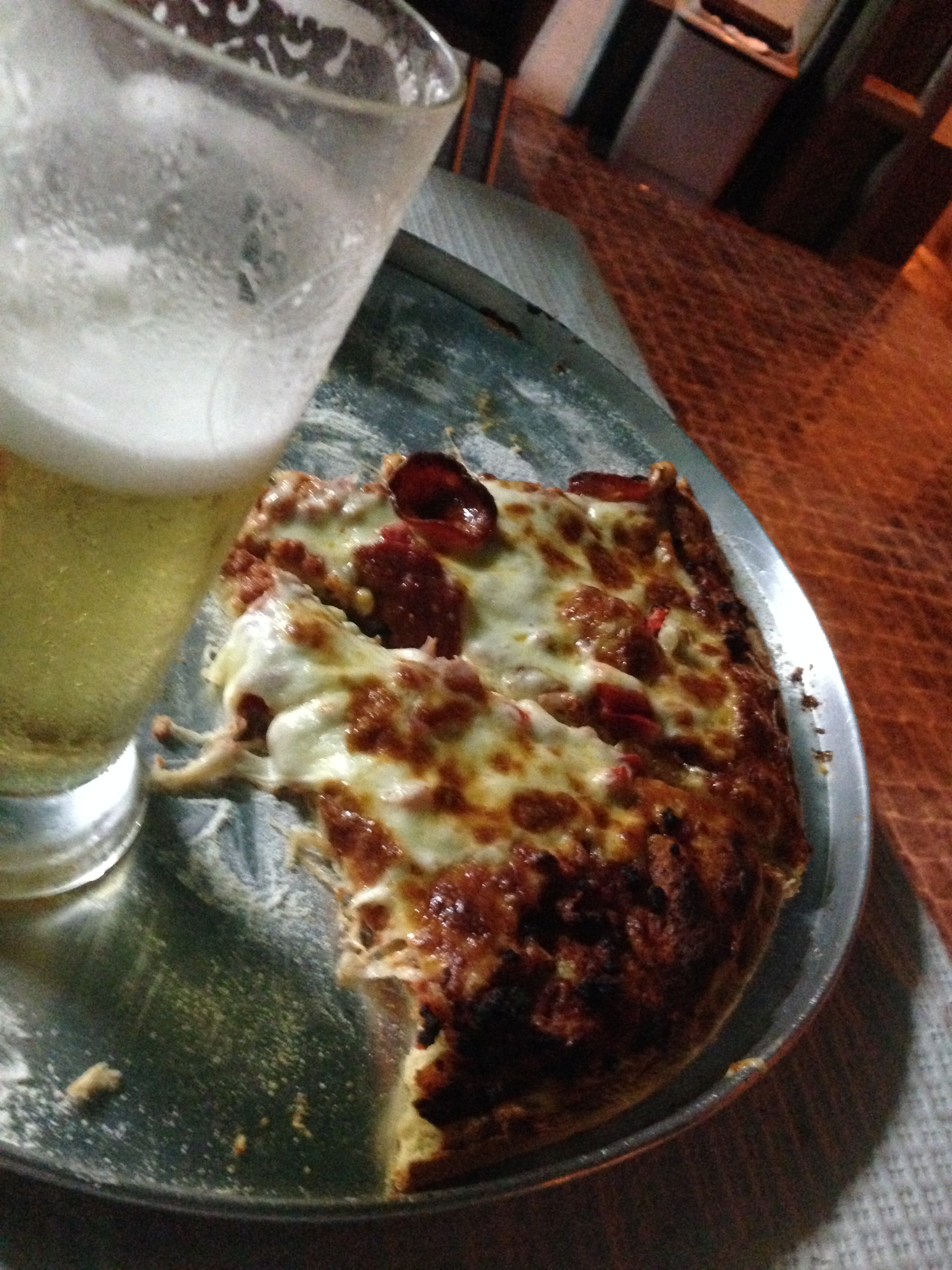 It is now raining quite hard, and unfortunately the restaurant is completely full when we arrive. The restaurant has a nice covered outside terrace. A bit lost, and with the bad weather, we head for the first place we see, a small cafe with an adjacent tent where locals are eating. We see a guy coming out with a pizza box, and order one pizza for two with a beer. It takes quite a while before the pizza is served, but it is worth the wait. It is a freshly made pizza topped with minced meat and azorean cheese. It tastes great, and although the pizza is actually too much for the two of us we finish it because it tastes so good, and that for 12 euro!