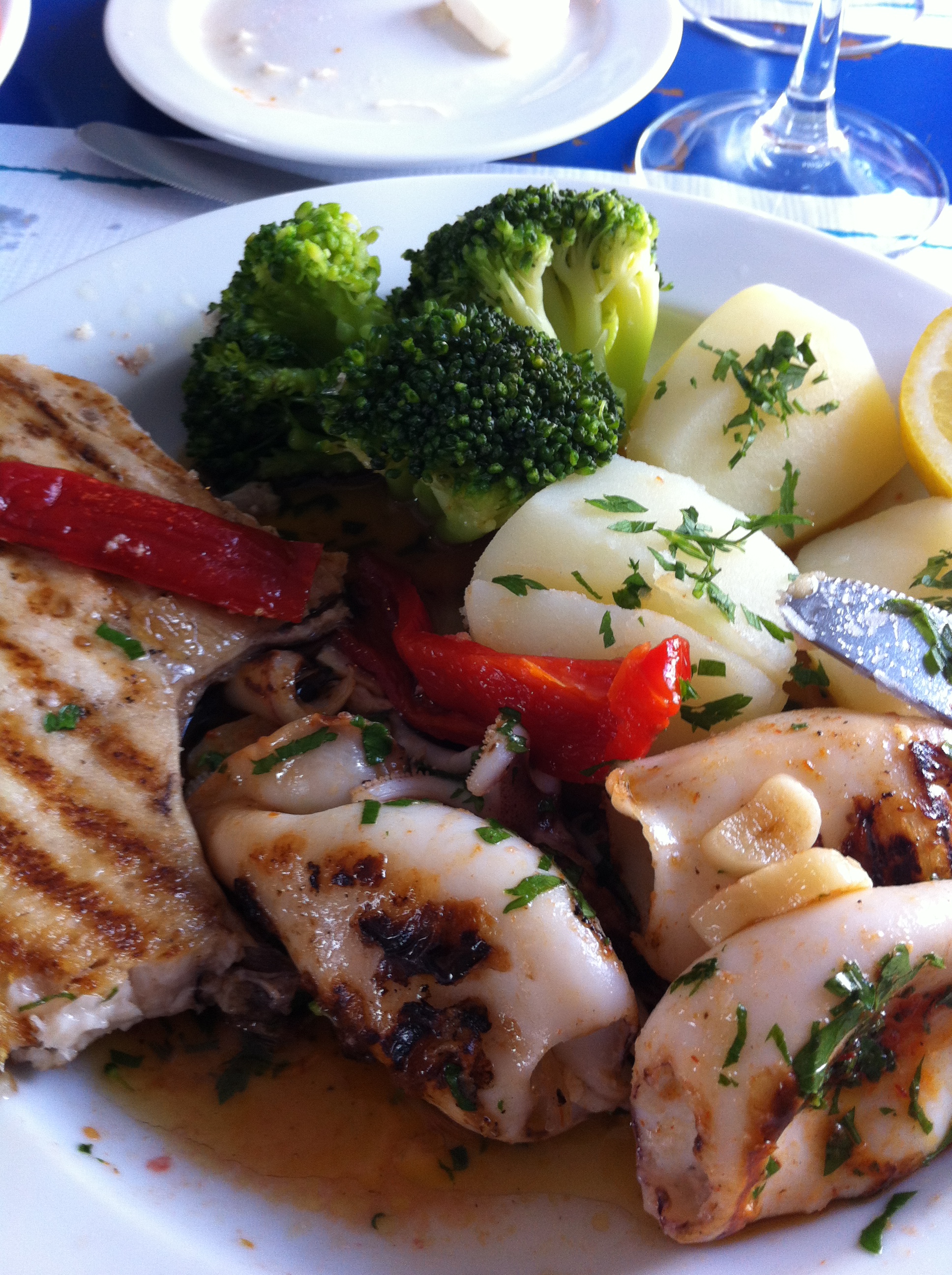 We go for two different fresh fish: swordfish and grilled squid . And we take some fresh azorean cheese as an appetizer. We get a big basket of fresh bread, and a big plate of salad and fresh vegetables with our grilled fish. We take a galao coffee to round it of. The fish tastes very fresh and the wine is as always good.