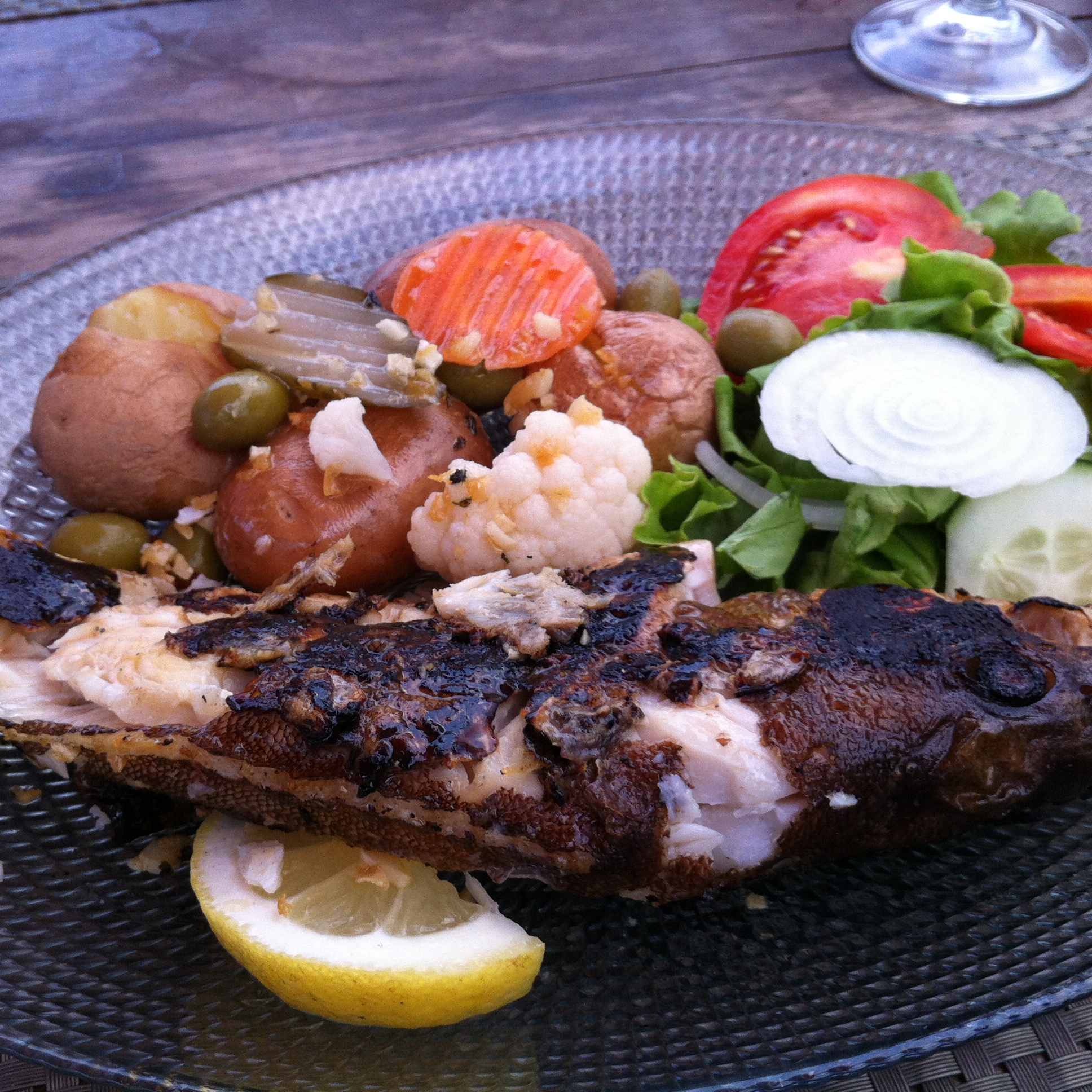 We can have fresh fish, but will have to wait till 8 PM for meat. The weather is still good so we take a table outside, a bottle of white wine (Frei Gigante from Pico island) and some bread and cheese as appetizer. We each take a different grilled fish of the day: one grouper and one parrot fish ( did not know you could eat them!). They are served with salad and potatoes. The fish is really fresh, but I like the grouper better than the parrot fish. We finish our wine with the sun slowly setting behind us.