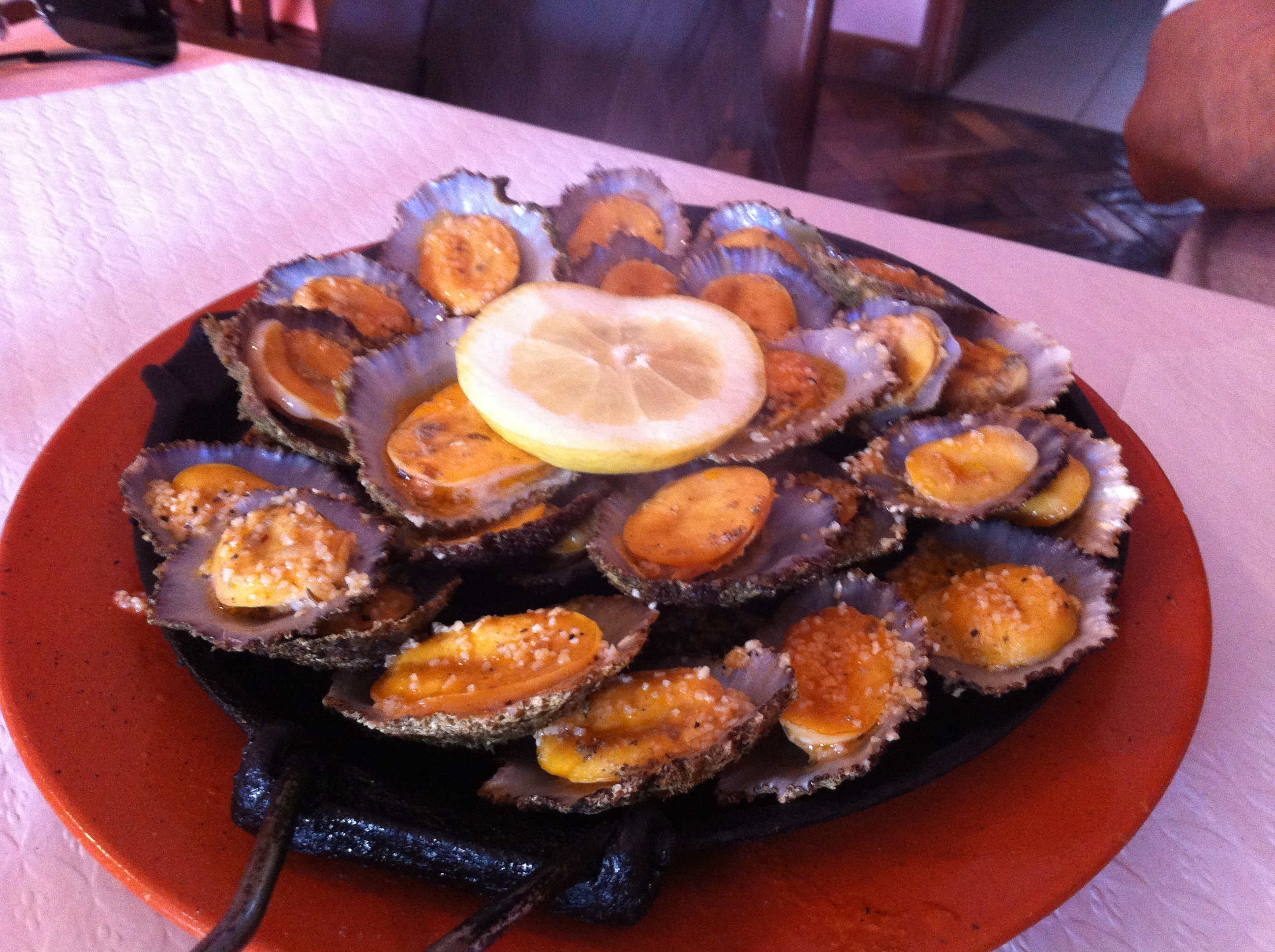 Well this is the Azores also, the weather can change very quickly, and it rains a lot on the islands here in the middle of the Atlantic! We decide to go in search of better weather at the coast and head to Mosteiros, where we take a look at the rocks in front of the city that look like monks in front of their monastery (mosteiro meaning monastery). We stop for lunch at Briso do Mar in Mosteiros. They serve fresh fish and seafood. We decide to try grilled limpets, a local specialty of the Azores, limpets being a kind of seasnail that tastes a bit like mussels but are less soft, and more chewy to eat. We ask bread and salad to go with it.