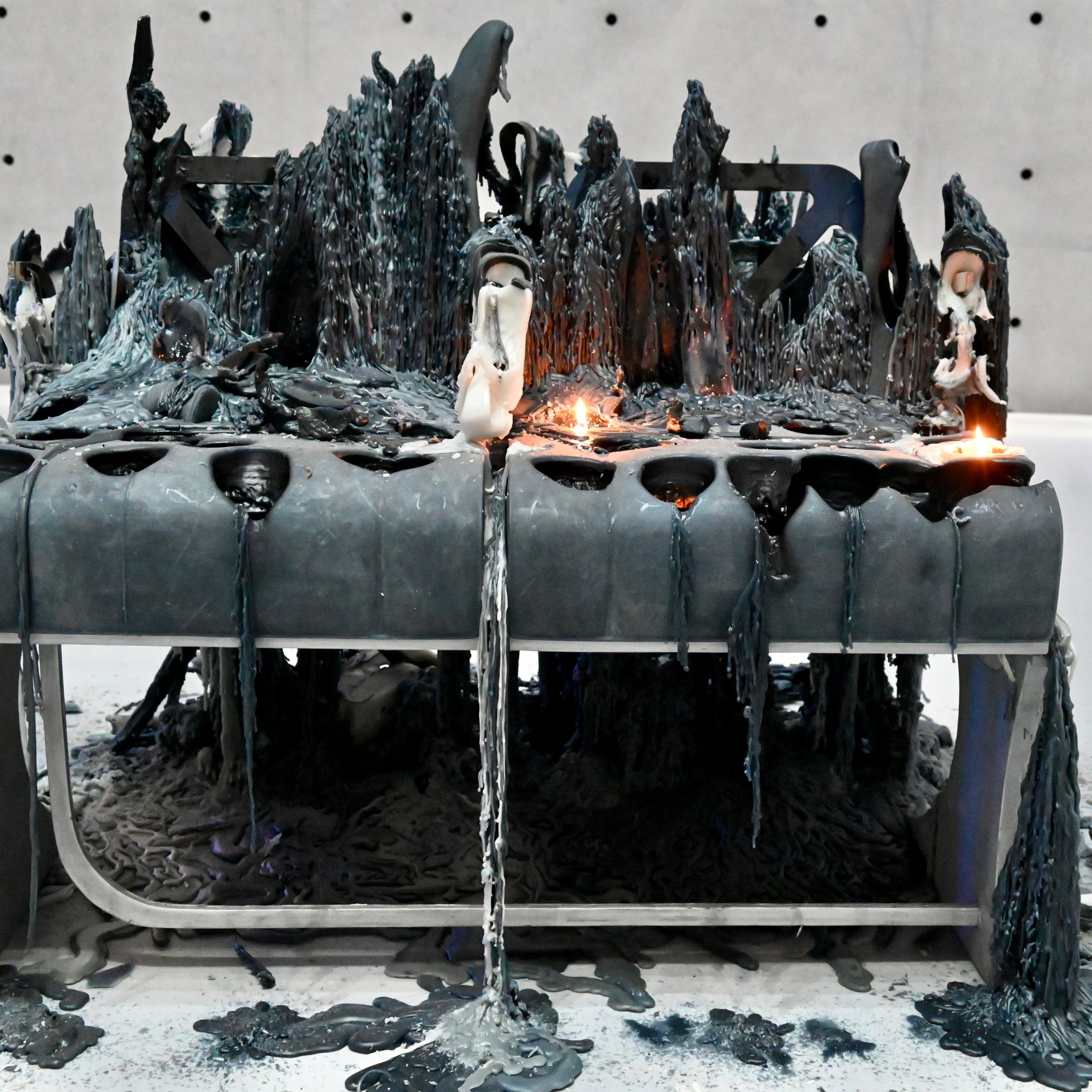 At the center of the museum’s initial exhibition stands a wax replica of the 16th-century Giambologna statue “The Abduction of the Sabine Women,” as a giant candle surrounded by other wax sculptures that are lighted every day and slowly melt away, a work by Urs Fischer. Around the dome in the display cases you find work by Bertrand Lavier criticising consumerism. One large gallery on the ground flour is dedicated to the black American artist David Hammons. Other galleries feature works by Miriam Cahn, Peter Doig, Kerry James Marshall and Martin Kippenberger and our own Belgian artist Tuymans. I really liked the sculptures by Tatiana Trouvé that like guardians are found all along the route.