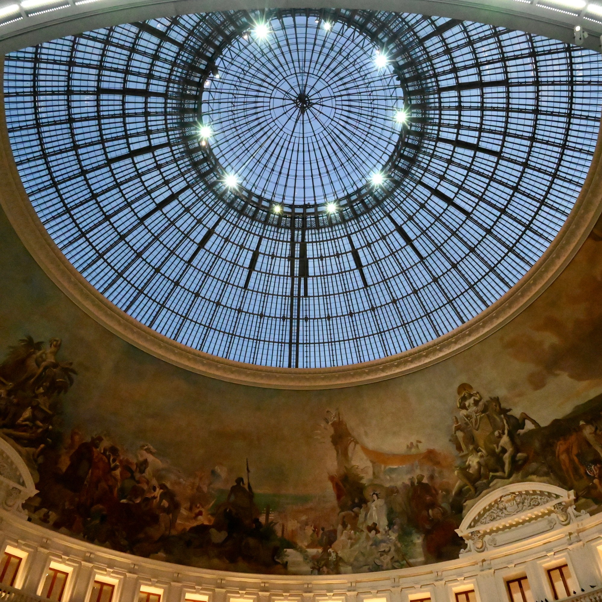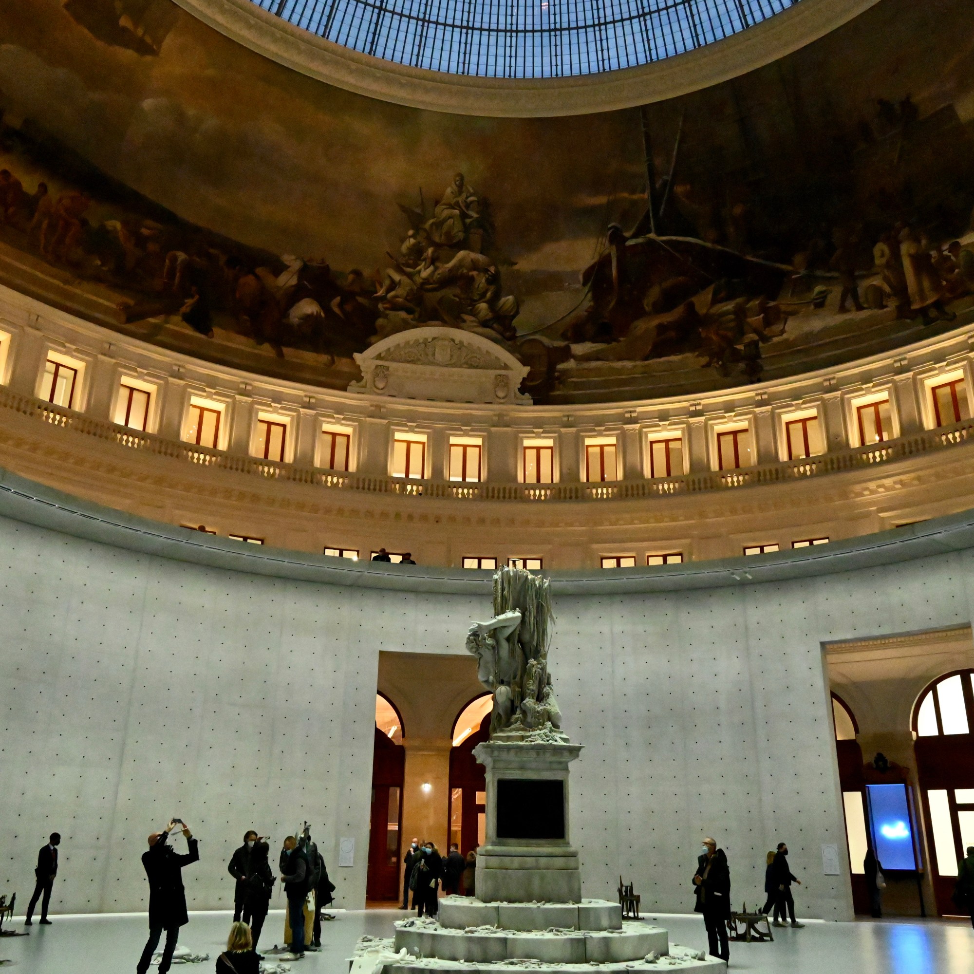 I took the metro back to the hotel to refresh myself, before walking to the newly refurbished Bourse de Commerce that now houses the Pinault Collection of contemporary art. Francois Pinault, a French billionaire asked Japanese architect Tadao Ando to renovate this 18th century grain exchange. Ando installed a 108-foot-diameter concrete cylinder inside the central rotunda, creating a core display area while retaining the framework of the original rotunda. They restored the 19th-century frescoes on the dome. At the entrance you are greeted by Ryan Gander’s in situ stuttering mouse-in-the-wall.
