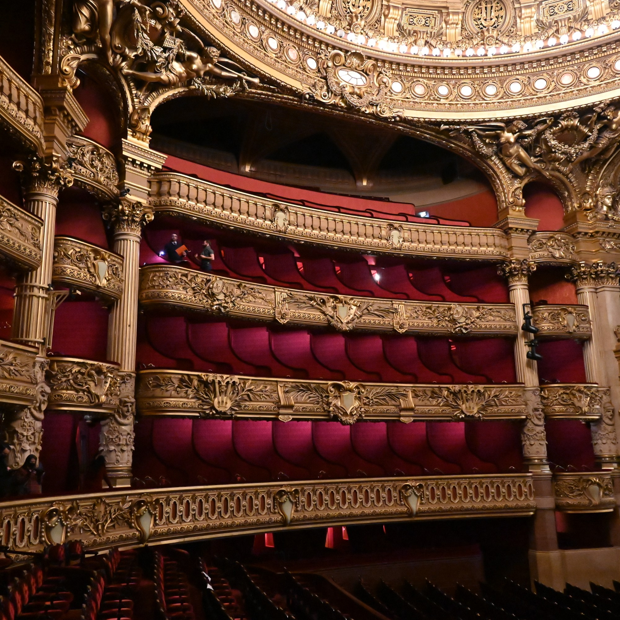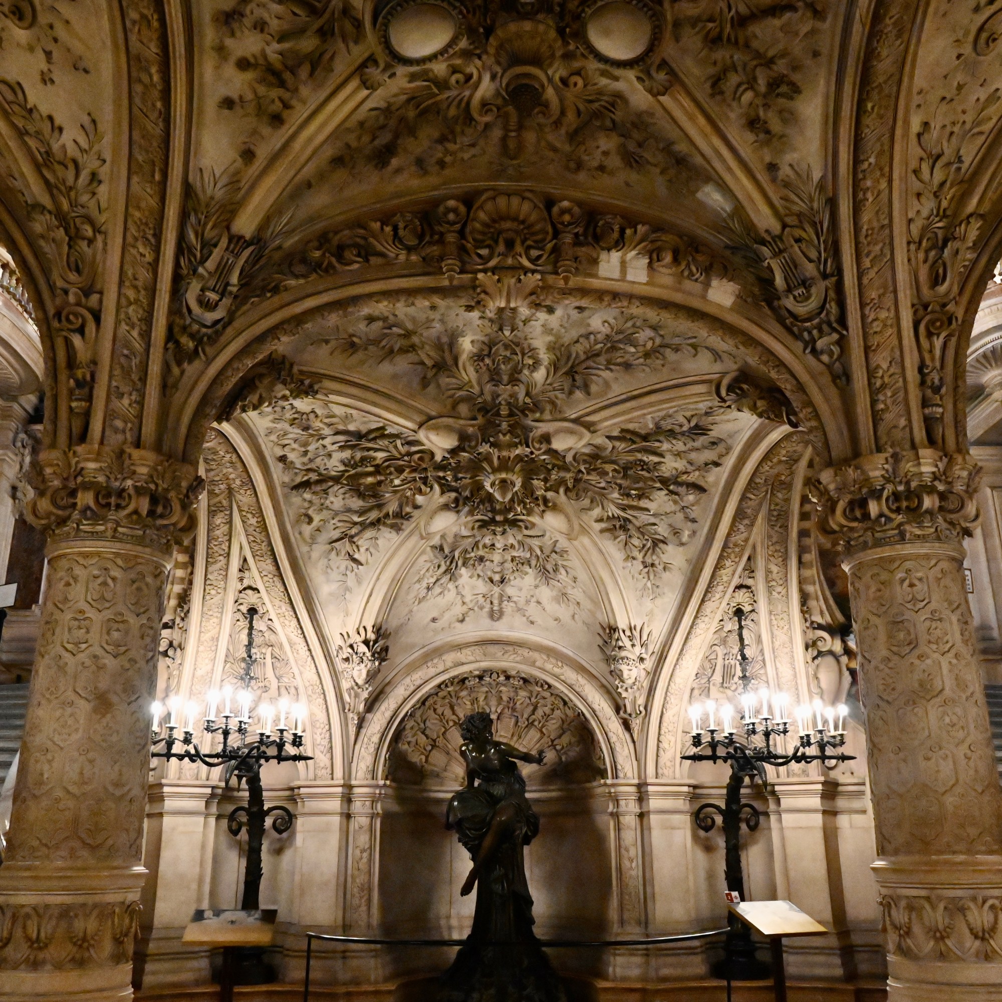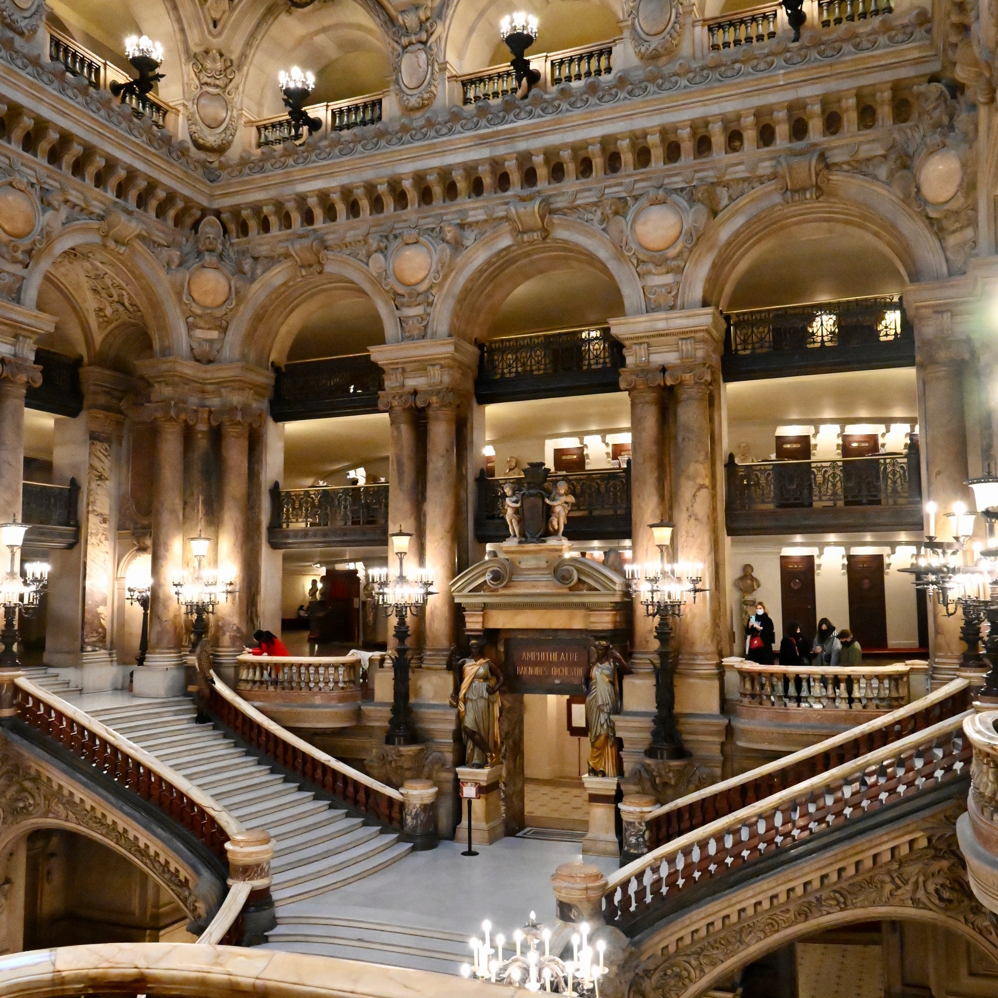 Our last half day was spent visiting the Opera Palais Garnier . Although I have been in Paris several times, I had never visited the inside of the 19th century opera building. It was a real eye opener. It looks impressive on the outside but is really sumptuous on the inside. Upon entering you find yourself at the Grand Escalier with its magnificent thirty-meter-high vault. Built of marble of various colours, it is home to the double staircase leading to the foyers and the various floors of the theatre. In the tradition of Italian theatre, the horseshoe-shaped “French” auditorium was designed for the audience to see and to be seen. The ceiling painted by Marc Chagall and commissioned by the Minister of Culture André Malraux was inaugurated on September 23, 1964 and under it hangs the 8-ton bronze and crystal chandelier with its 340 lights.