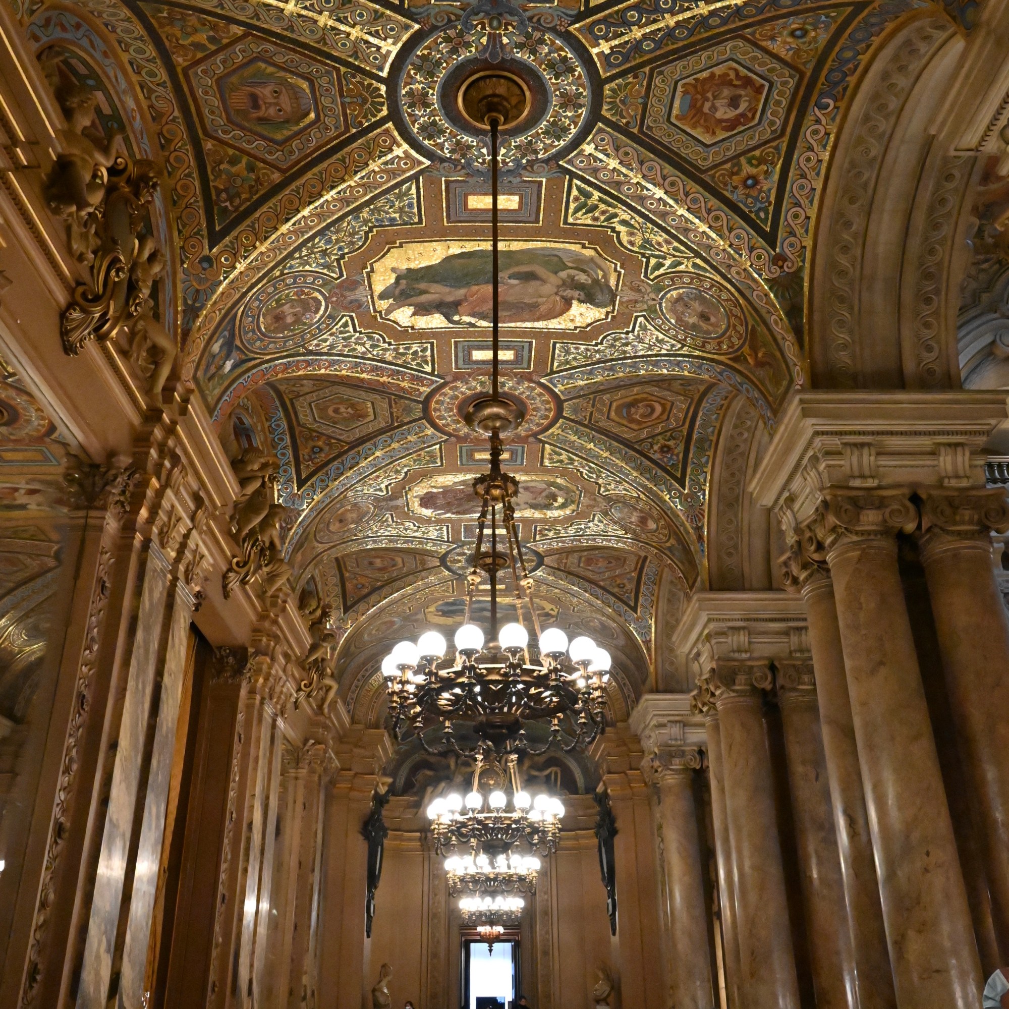 What impressed me most was the Grand Foyer with a ceiling painted by Paul Baudry (1828-1886) featuring themes from the history of music. The vault of the Avant-Foyer is covered with mosaics of shimmering colours on a gold background. The view of the Grand Staircase from here is spectacular. There is also a library and a painting gallery.