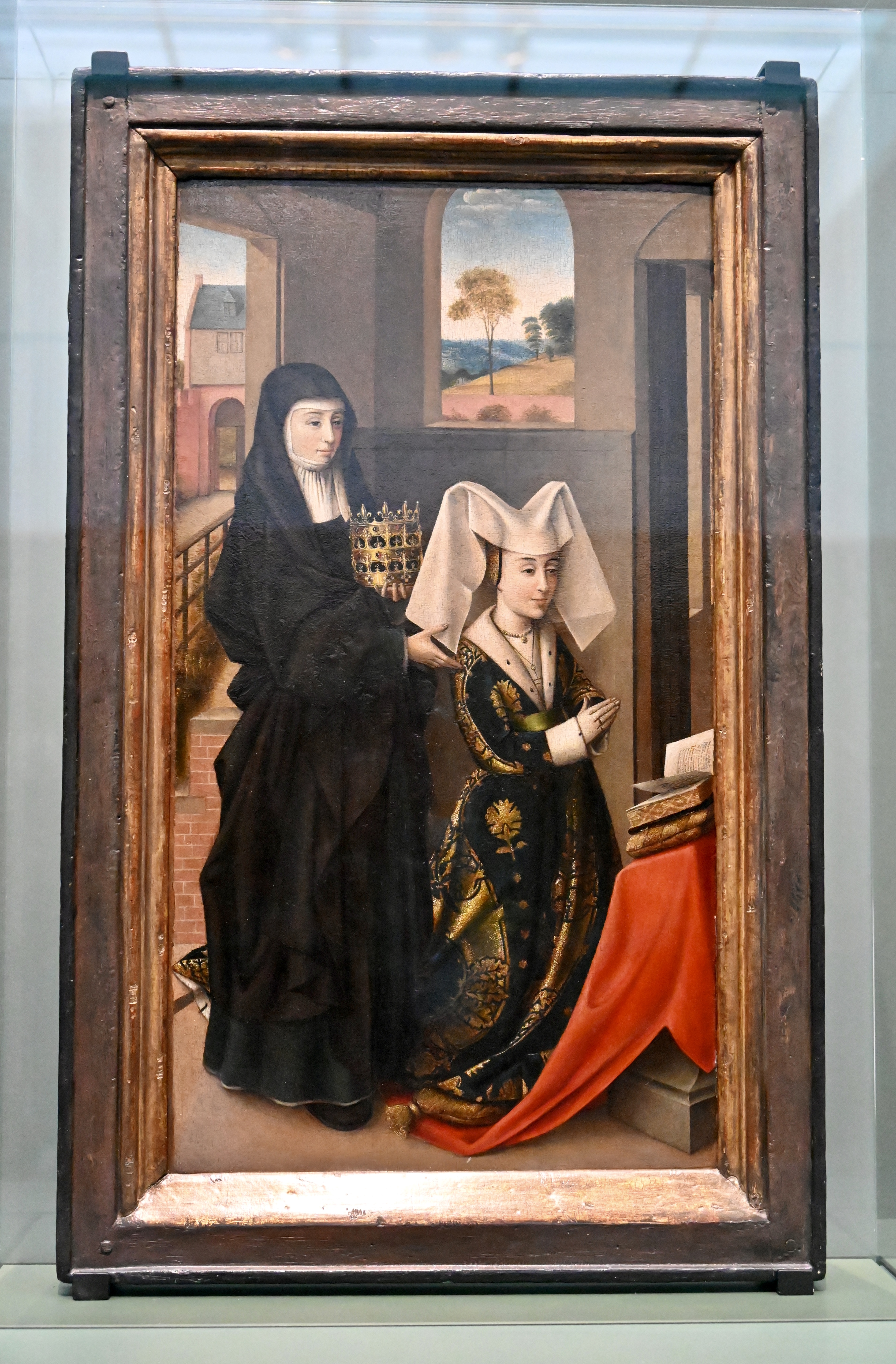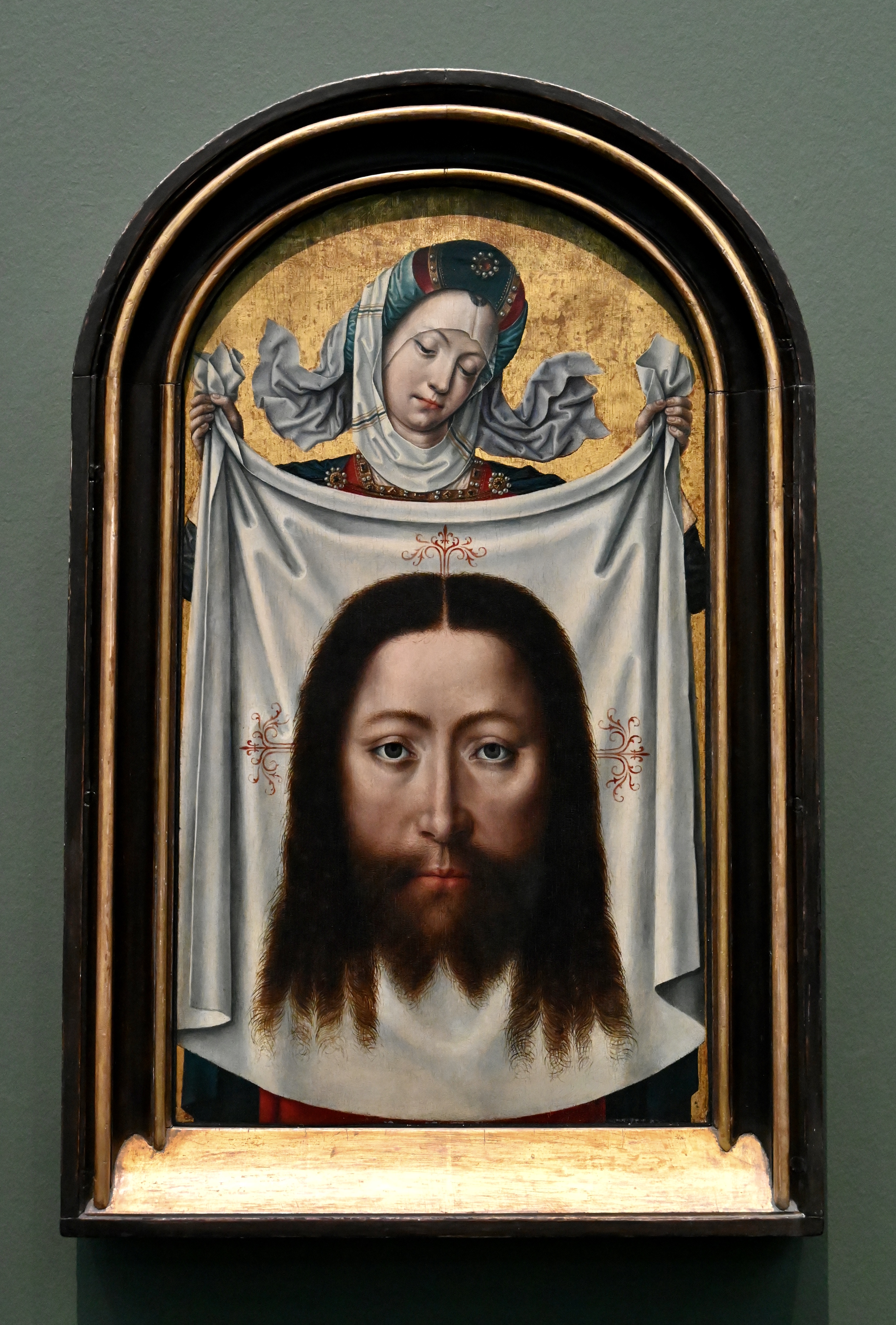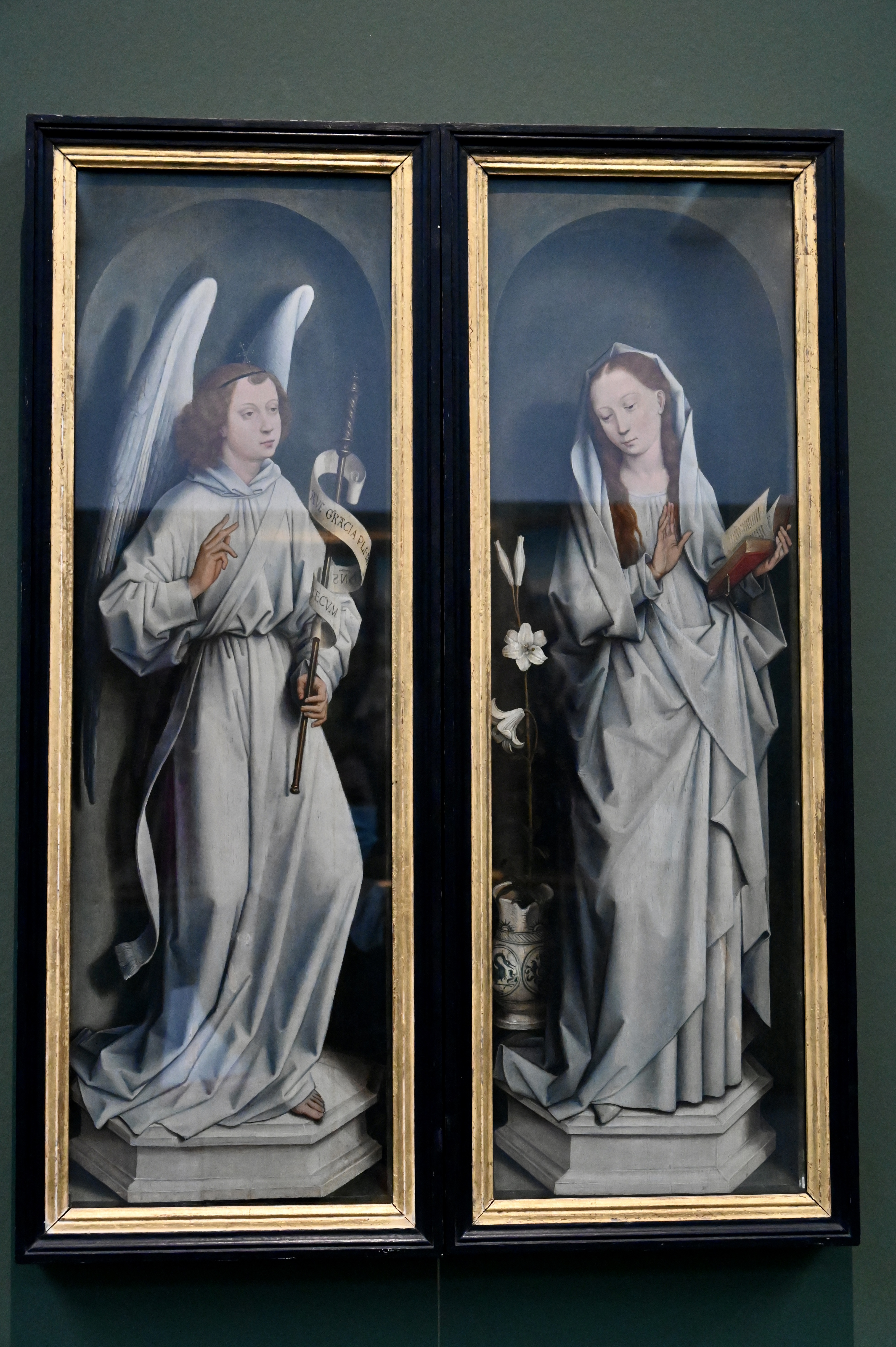 in the second room I am always drawn towards a painting by Petrus Christus ‘ Left wing of a tryptich, Isabel of Portugal with Saint Elisabeth. The devote faces of the two characters contract beautifully with the gold brocate of the dress and the golden crown. In the back, a finely painted landscape adds to the quiet atmosphere. A second painting is Saint Veronica who holds the cloth with which Veronica wiped away the sweat and blood of Christ during his walk up to Golgotha, miraculously preserving his features on the veil. It is painted by the Master of the Legend of Saint Ursula. On one of the walls of the church of our Lady we also find a painted image of Saint Veronica found during the last restoration of the church. A third painting I like is the Annunciation by Hans Memling. I am a bigger fan of Memling than of Van Eyck. I like the frail figures he paints that feel more elegant than those by Jan van Eyck. And I loved the exhibition Memling Now where his work inspired the work of contemporary artists.