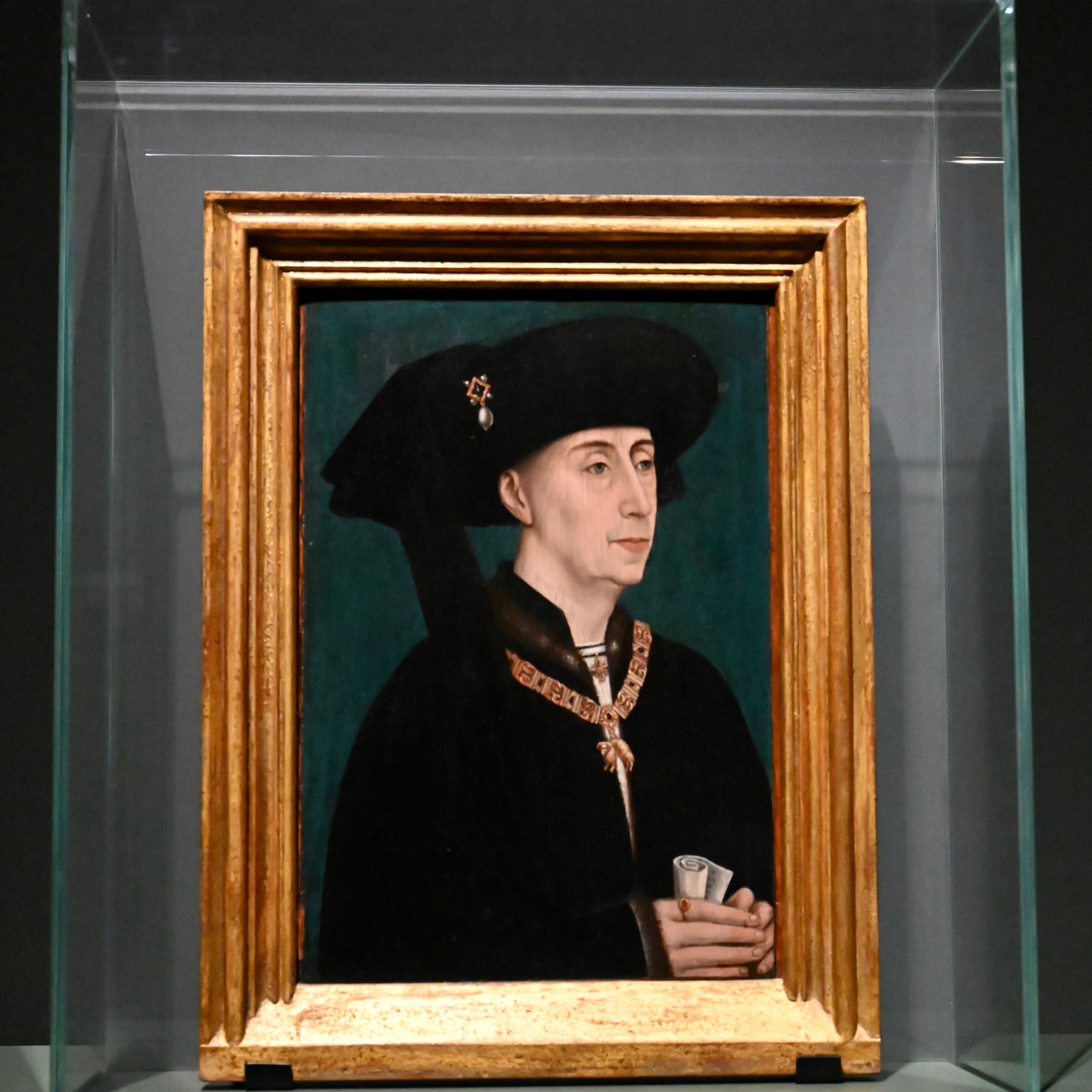 The portrait Margaretha by Jan van Eyck is one of the highlights of the Early Flemish paintings that form the core of the world famous collection of the Groeningemuseum. The intimate portrait of Van Eyck’s wife Margaretha is probably painted for personal use. Her head seems unusually big in comparison to her upper body and arms. But it is the soft gaze in her eyes that seems to draw everyone towards the painting. The museum does not own a painting by Rogier van der Weyden but owns two copies, one is a beautiful version of Saint Luke drawing the Virgin’s portrait. The second painting is a portrait of Philip the Good which is also believed to be a copy after Rogier van der Weyden. This painting feels like it really belongs in Bruges and shows in its execution a lot of resemblance with the portrait of Louis of Gruuhuse (shown in the Gruuthuse museum next door). Each portrait only highlights the face, the necklace of the order of the Golden Fleece and the hands. The portraits breathe serenity and both figures seem to turn inwards. I am attracted by the sober composition.