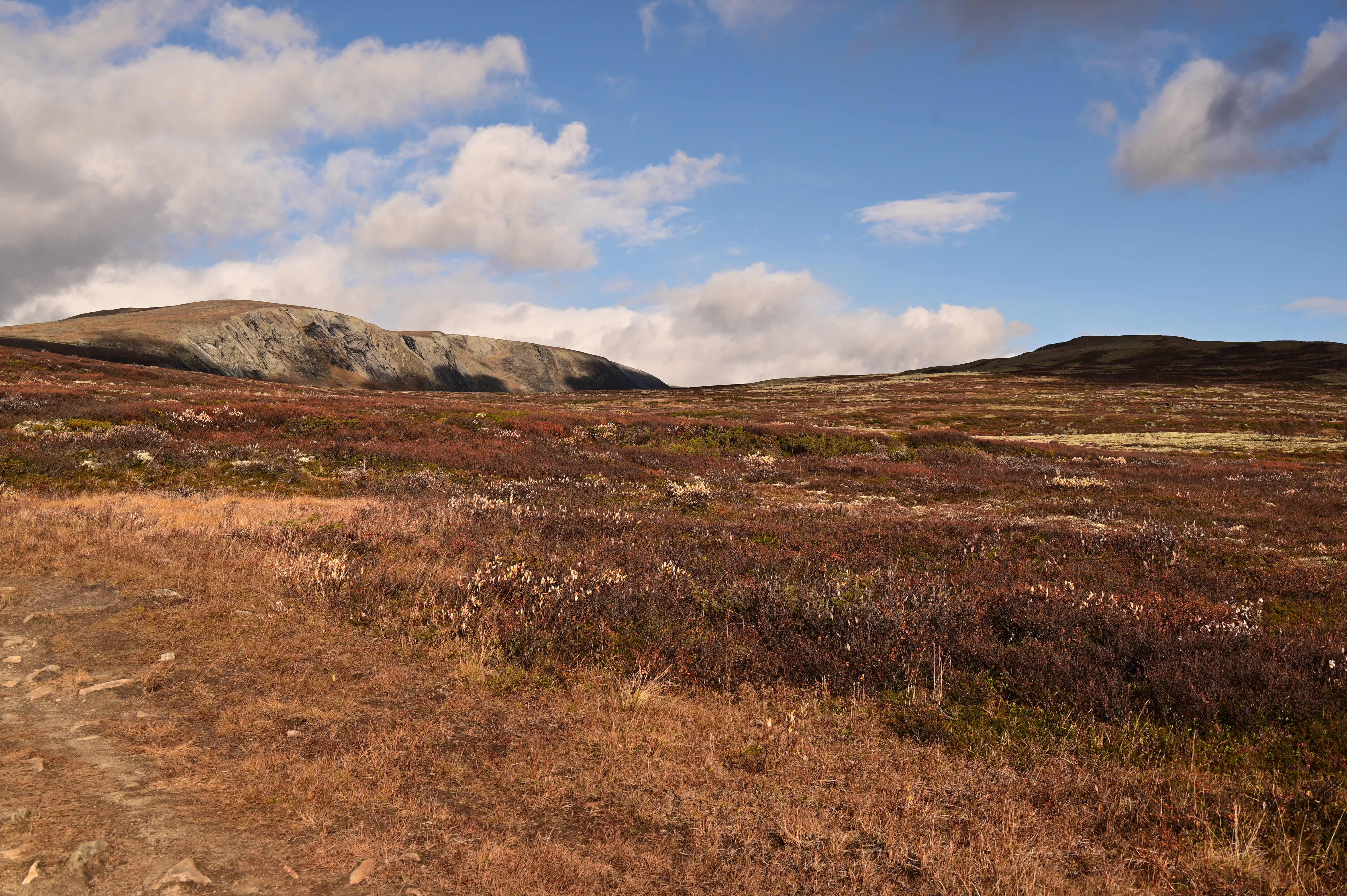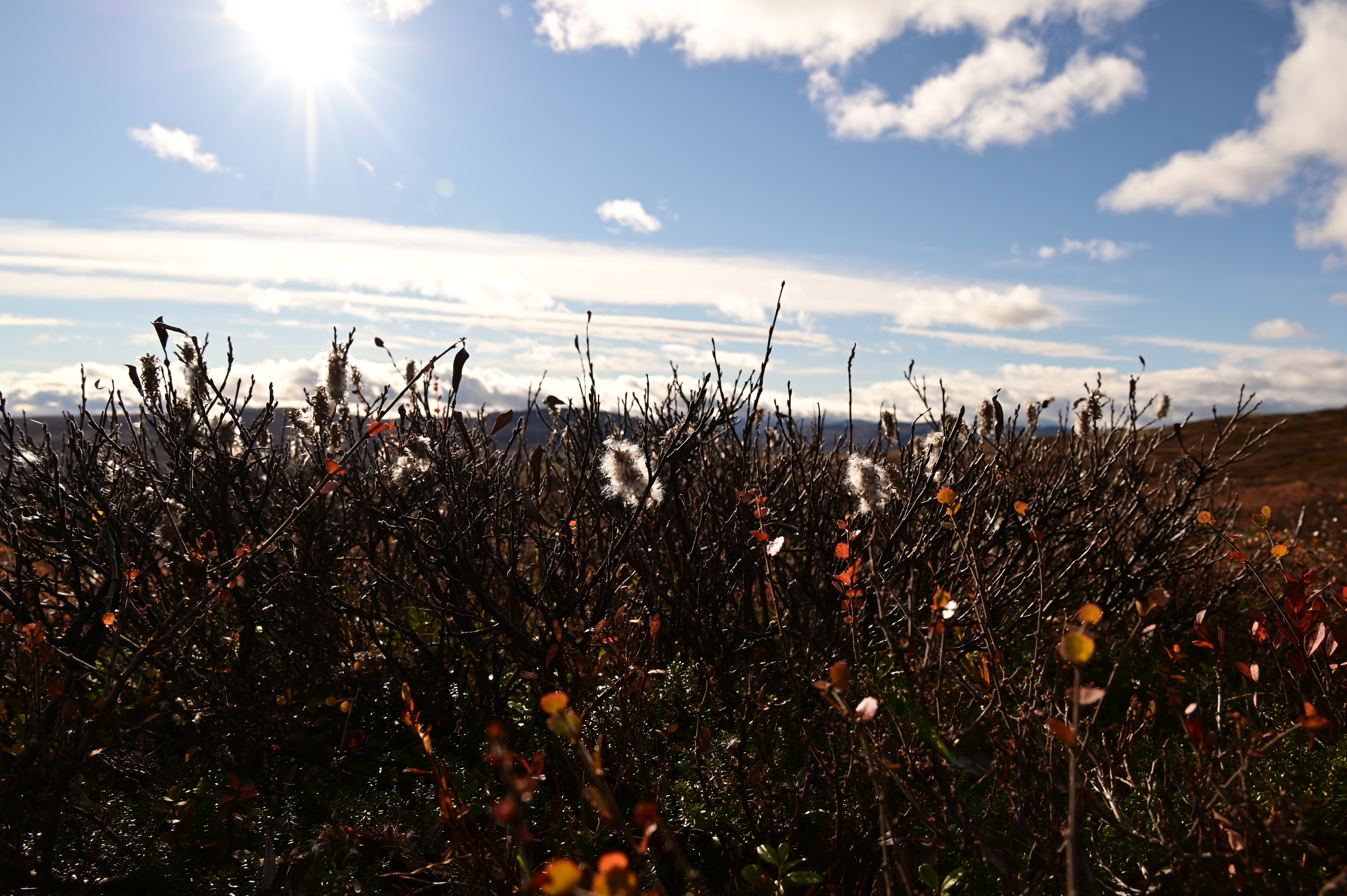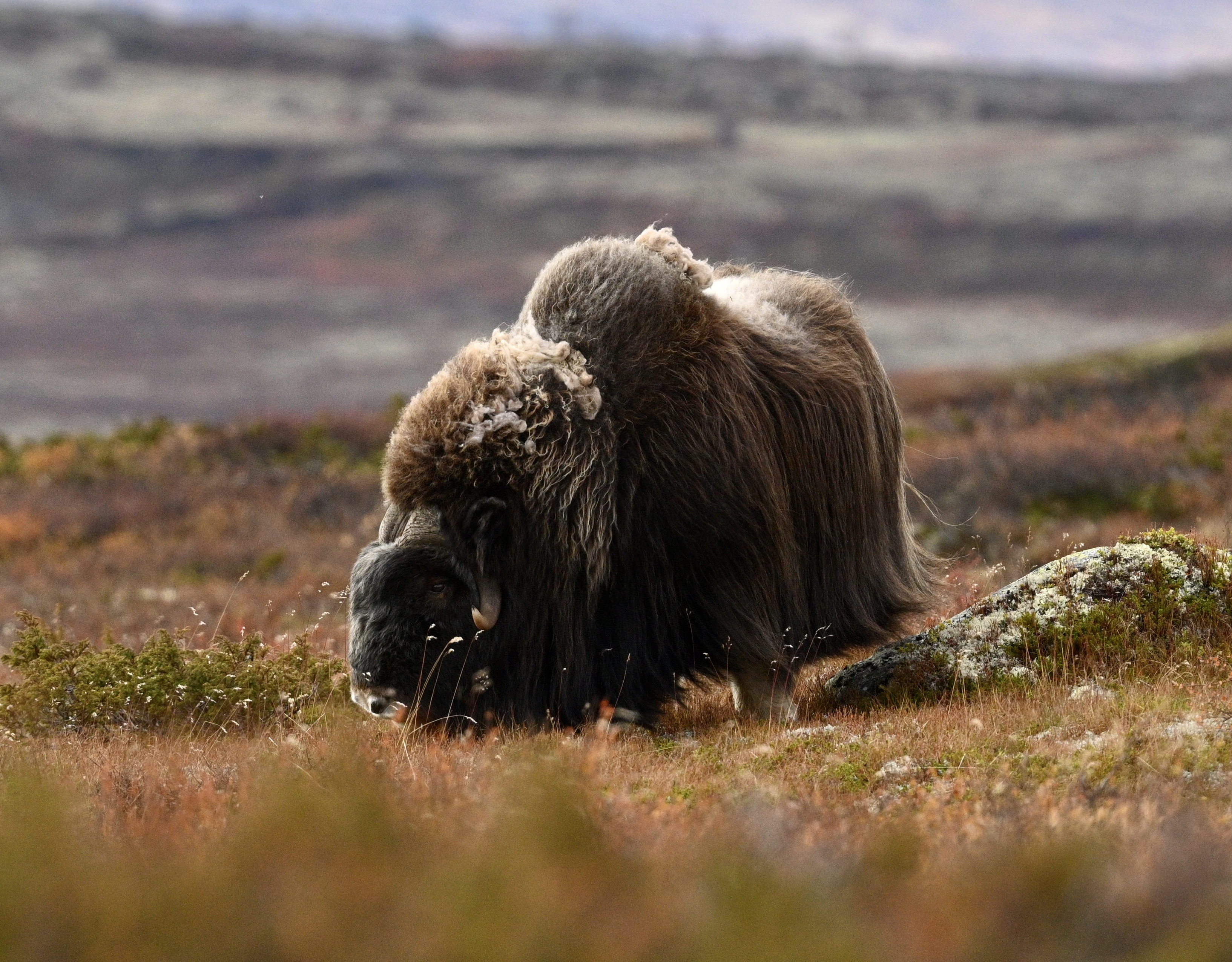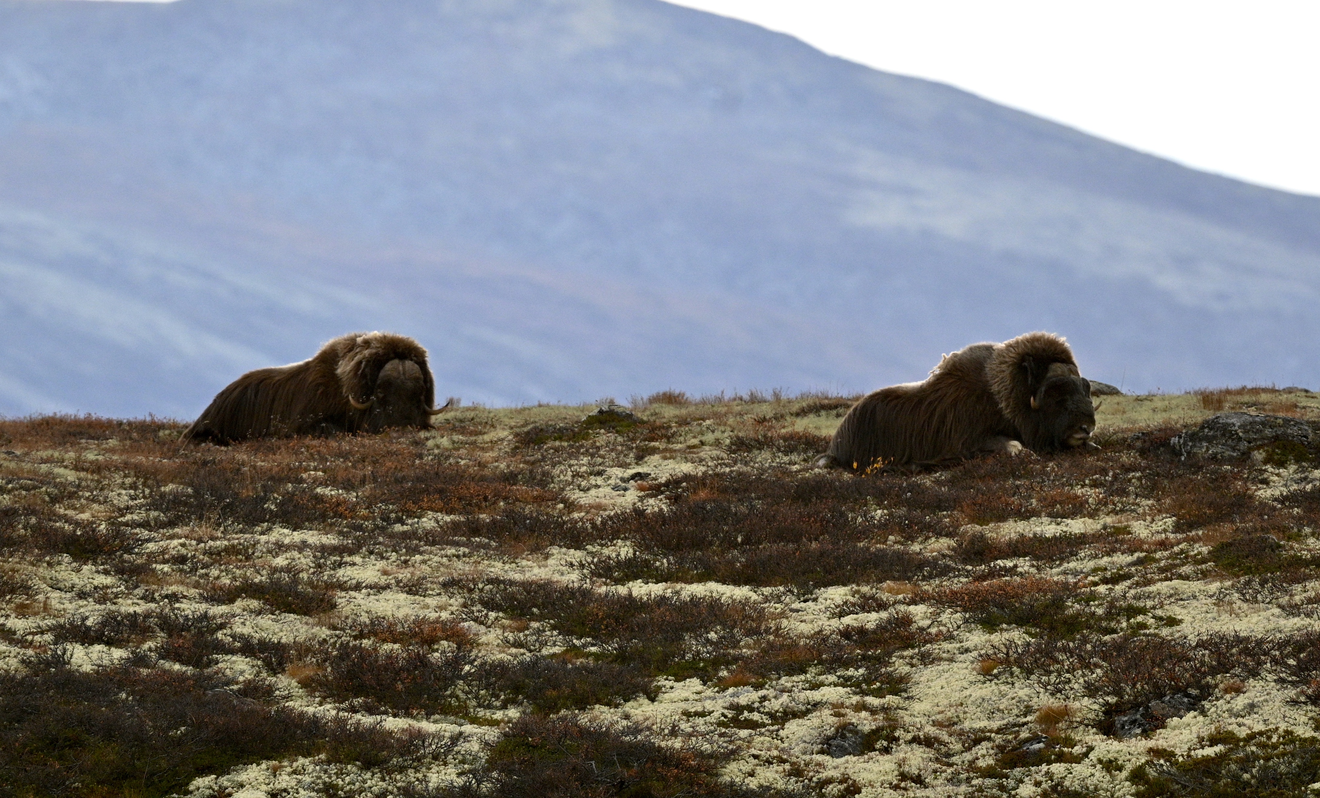 Very soon we saw several oxen and we could even approach them till about 200 m distance, the distance that is recommended to make sure they do not attack you. Other small groups were also observing the oxen. If you go out on your own, you will often find the oxen by just observing organised groups. But it is also very rewarding to find them all on your own! We saw some 12 musk oxen in total, some from quite close, others further away and at the end of the day we saw two oxen lying down and having a rest, just on the rim of a little hill with the evening sun in the back, just wonderful! Funny thing is, with the autumn colours it is not always easy to spot the oxen who are perfectly camouflaged this time of year. Often they first look like a big rock from afar, and only when you get closer you suddenly see the rock is actually an animal. They move quite slowly, grazing all the time, and even if you think they haven’t seen you, they keep a close eye on you! The plant vegetation forms a specific ecosystem with small plants like lichen and mosses and alpine flowers that have adapted to the harsh conditions of the plateau. We made great pictures, and the park itself is a beautiful place to make a walk, especially when it is dressed up in autumn colours. The weather was partly sunny, partly overcast, but no rain or fog! It was a tiring but perfect day. Dress warmly because it can become chilly on the plateau!