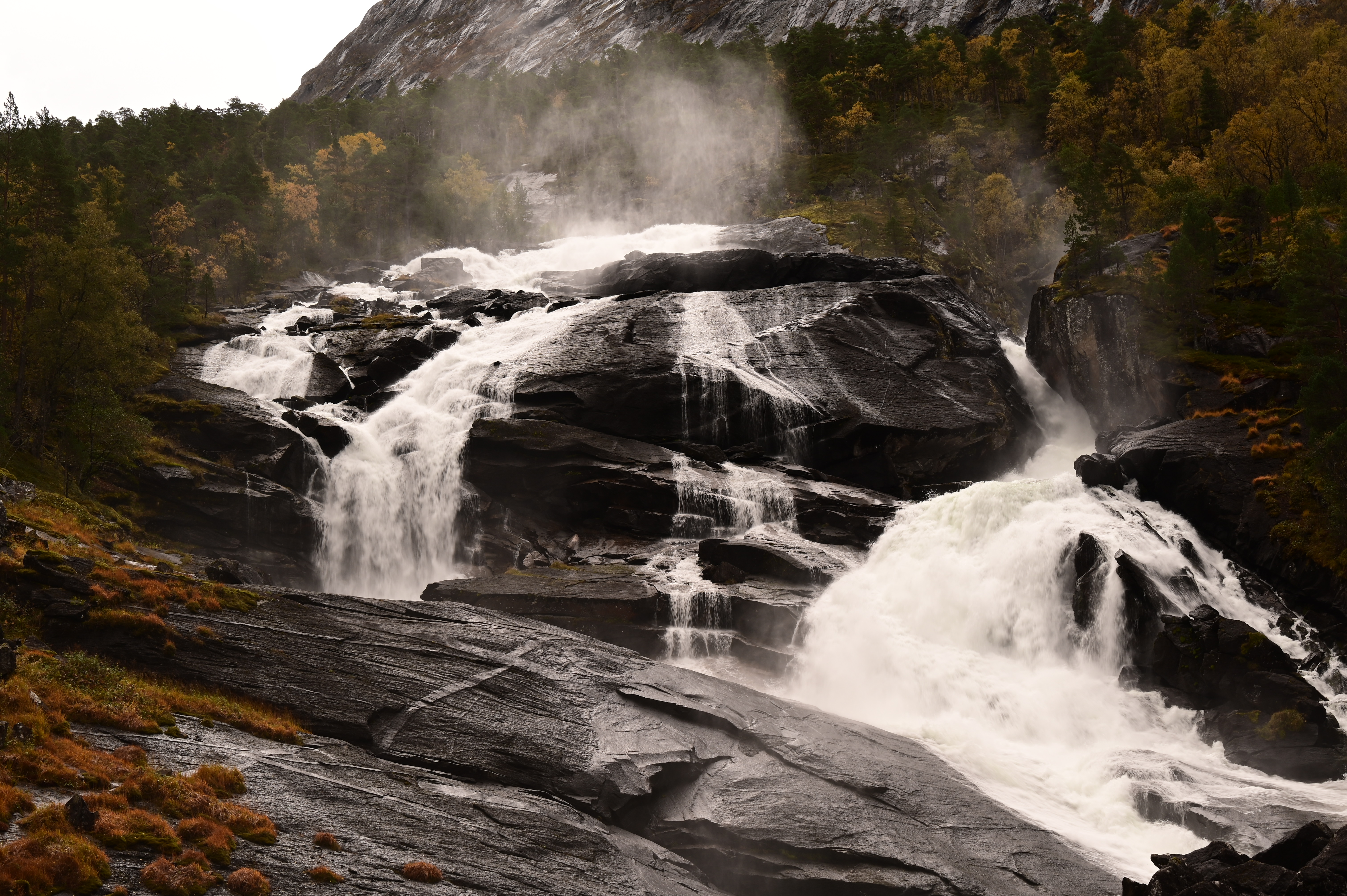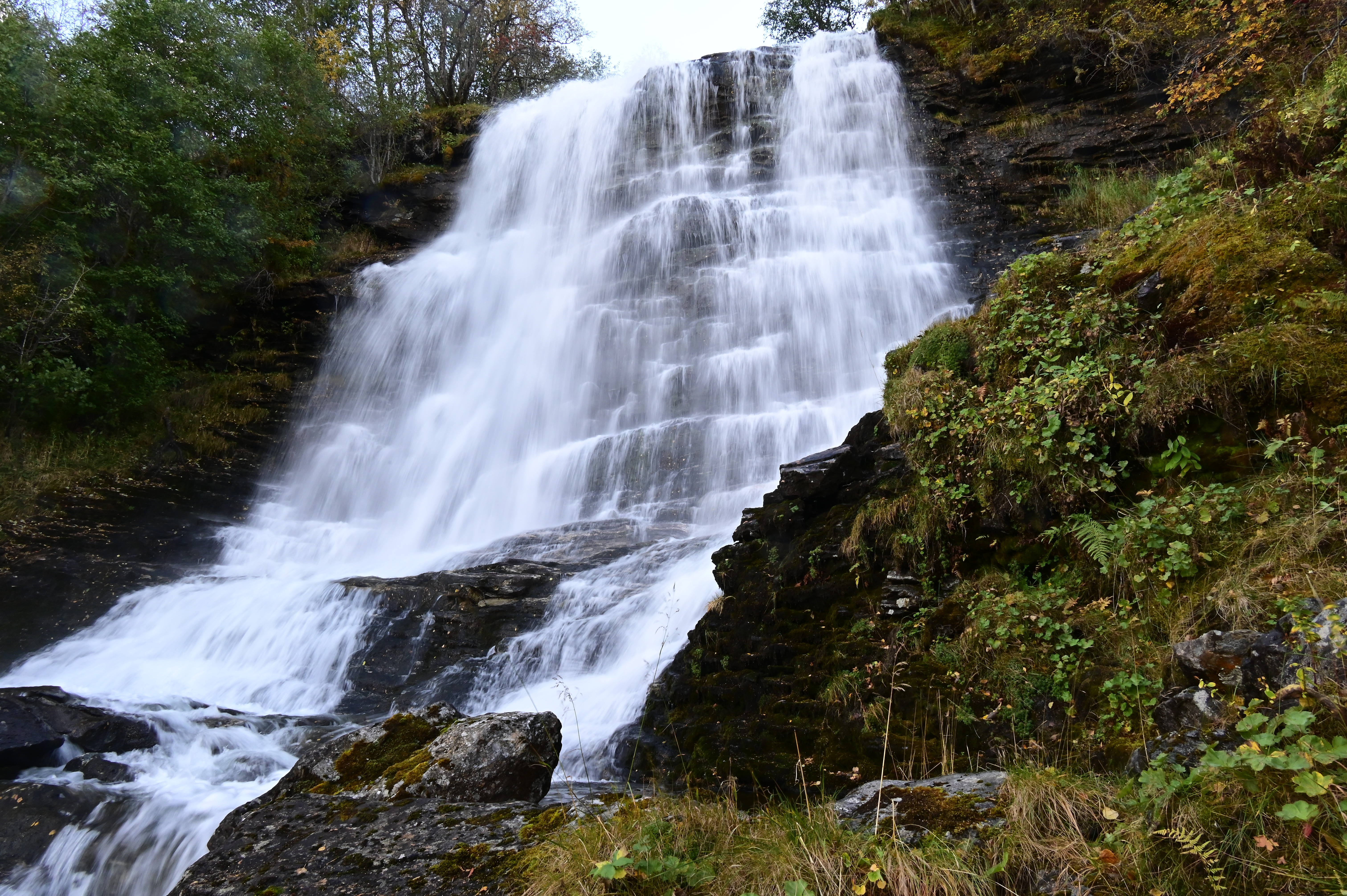 7. Husendalen valley. From Eidfjord we drove out to Kinsarvik from where we wanted to hike the four waterfalls of the Husendalen valley. It was already almost midday when we started our hike. It still rained a little when we started but soon after it was dry. We parked at the car park just before the little bridge. From there we started our hike. You first pass a helipad on the right, and then walk beside the Kinso river until you reach the power station, where the first waterfall, the Tveitafossen comes down right next to the old power plant. From here you have two ways to hike up, the first one is a wide gravel road that starts a little before you reach the power plant, on the left side of the road. The other one is to climb up the steep path that is just next to the big pipes. This hike is marked with red T’s, and starts off just left of the power plant and joins the pipe just after the building. You follow the pipe on the left side till you reach the dam. If you have taken the gravel path you can join the T marked path at the height of the dam. The T marked path is sometimes a scramble and can be slippery after rain, but it leads you right next to the second waterfall, the Nyastolfossen, one of the big waterfalls of Norway. It is a really beautiful hike through the forest. We saw a lot of beautiful mushrooms and one little squirrel hurrying away in front of us. It is very strange to see so little wildlife in Norway, very little birds or small mammals although there is so much unspoiled nature. Maybe it is because of the long cold winters that make it hard for them to survive? You climb a long time almost next to the waterfall until you reach the top. Here the T marked path joins the gravel path which is to its left. The gravel path continues to Stavali, a two day hike, and to see the third and fourth waterfall you have to continue on the red T marked path from here. We continued to the third waterfall, the Nykkjesoyfossen. You can hike up to the top of this waterfall, but decided to turn back after reaching the bottom of this waterfall, since it was getting very cold and it was already after 3 PM and we still had to walk down. Hiking up to the fourth waterfall, the Søtefossen, takes at least another half an hour. We walked back down via the gravel path which gives you another view of the Nyastolfossen. This hike is one of the most beautiful hikes in Norway! The hike up to the fourth waterfall and back easily takes 4 to 6 hours, you have to overcome 600 elevation meters, and it can become a lot colder when you get up higher.