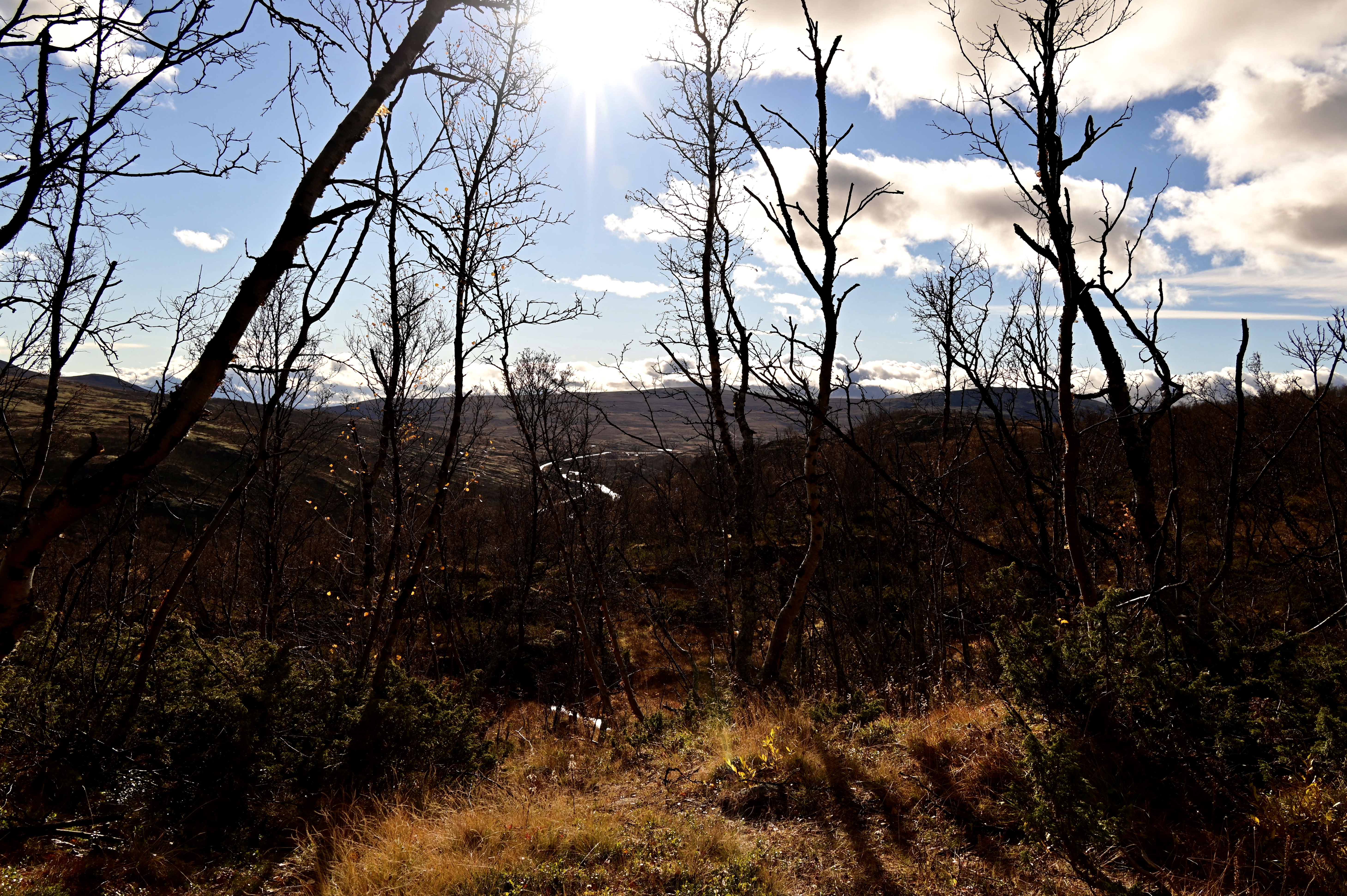 We continued towards Kongsvold Fjeldstue, a historic hotel where we parked and departed for our oxen safari. It was a great day, the weather was quite chilly and windy but sunny. Just before you reach the hotel, there is a sign on the left side of the road that marks the start of a trail into the National Park. You walk across the valley, under the train rails, and into a birch forest. You slowly gain altitude and a short walk later you reach a kind of plateau.