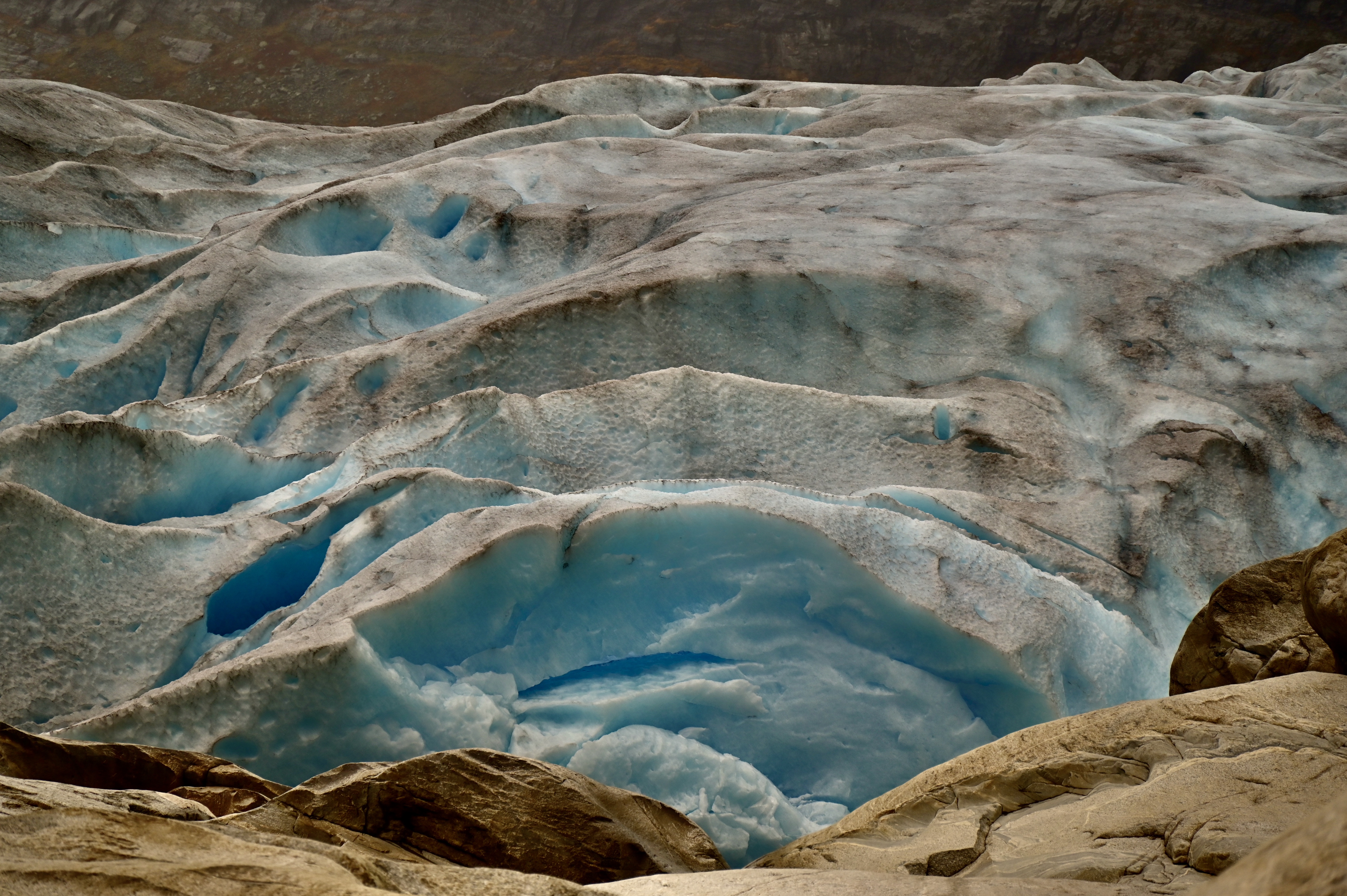 5. Nigardsbreen glacier. The day after hiking Mount Molden, we drove up to Nigardsbreen glacier. There was quite some fog which lay in beautiful layers around the mountains. The Breheimsenteret (visitor’s centre) was already closed since October first, but the door was open and they let me use the toilet. We drove our car via the tollroad which costs 80 Kr and which you can pay by credit card up to the parking lot next to the lake. From the car park it is a 3 km walk up to the viewpoint close to the glacier. The path is very well marked but quite strenuous, you walk over the polished rocks which can be slippery, so you better make sure you wear shoes with extra good grip. On certain points wooden ladders help you over some higher rocks. Be careful when it rains, it can become very slippery. You also have to cross some small streams where well placed rocks help you keep you feet dry. The walk from the car park to the viewpoint takes about one hour one way. In summer time there is a boat that takes you from the car park to the end of the lake, but it did not go out anymore in October.