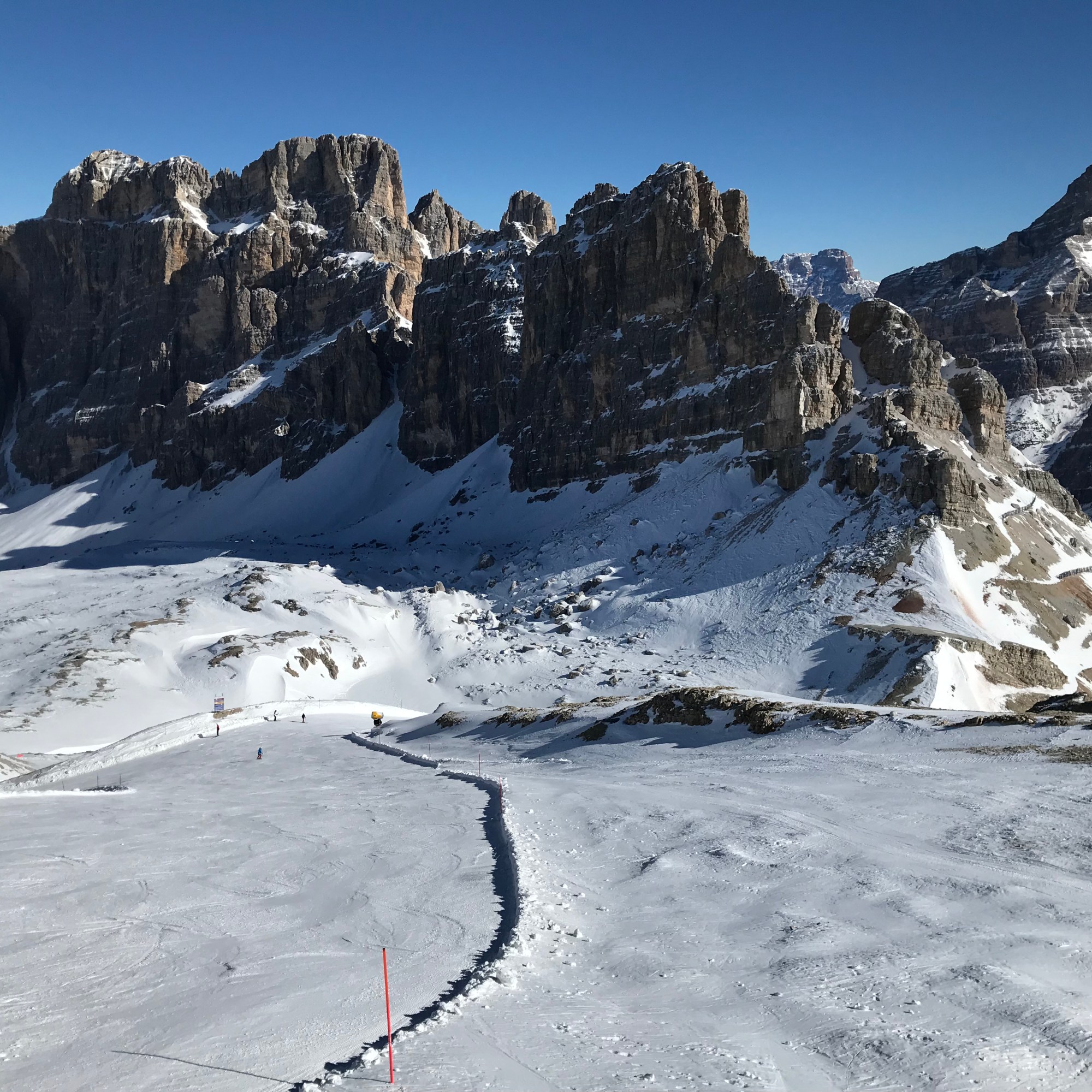 At the top you can use the toilets at the Gondola building, or walk up to the Lagazoui Rifugio a bit higher. From the top you can either ski down the red Lagazuoi slope (on the right) which is 3.5 km long and take the Gondola back up, or choose the left side and start the 7,5 km long slope down back to Armentarola. The slope is steep at the start, but then winds down in the Lagazuoi gorge between craggy mountain faces. Halfway you can make a stop at the Scotoni Hut. We ordered a warm drink and shared a Boule de Berlin in the sunshine.