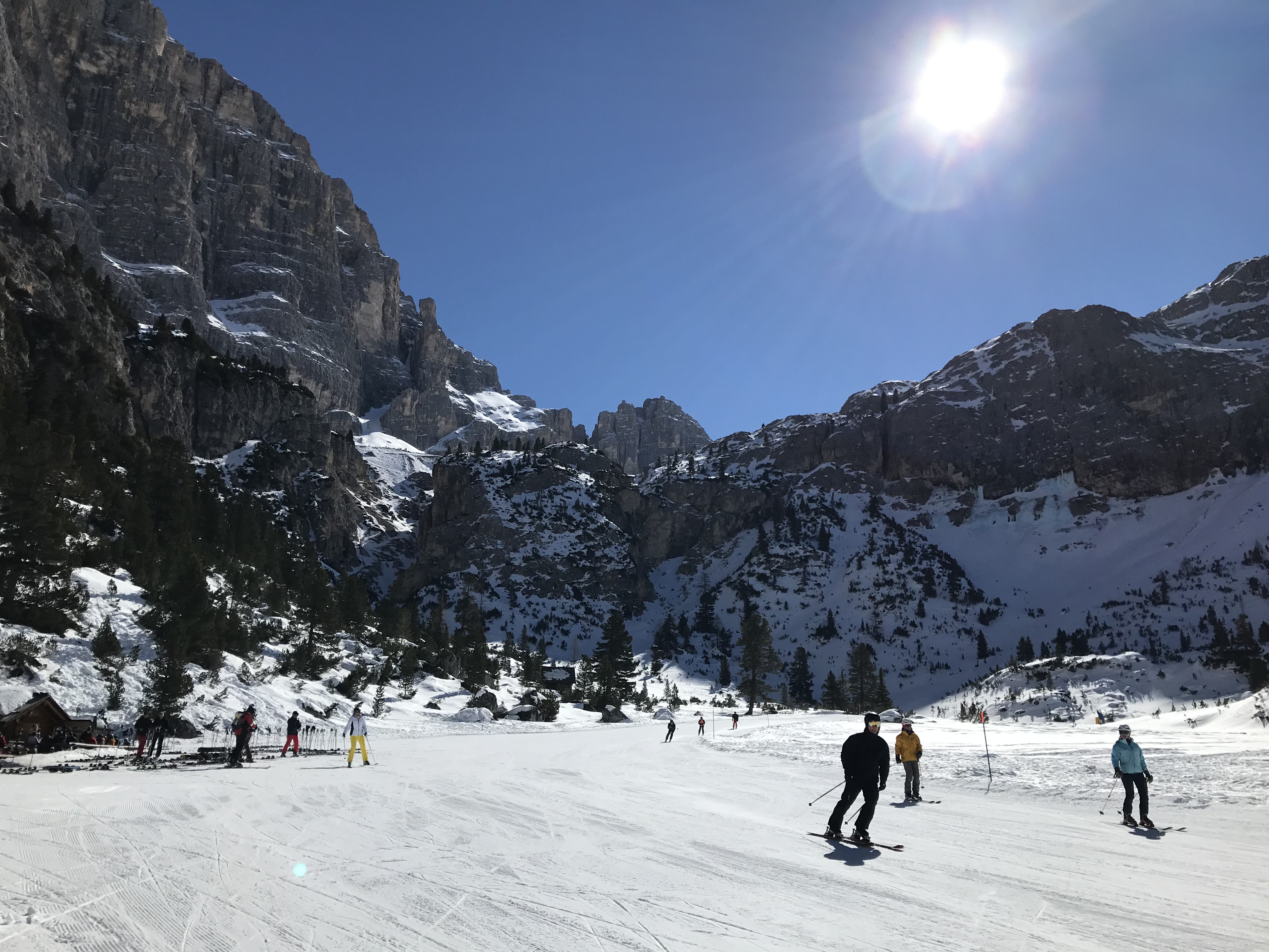 The slope continues through a steep canyon until you reach the end of the slope where you can either take the skibus or continue further, on a rather flat slope until you reach the Horse lift. Several horse carts await the skiers. A horse carriage pulls a rope on which 20 something skiers hold on and are pulled back to the Armentarola hotel. Some skiers can take a seat in the carriage. A steeper part often surprises many of the skiers and can lead to some falling, usually without any harm. The service costs 3 euro per person, you can only pay cash and is a once in a lifetime experience.