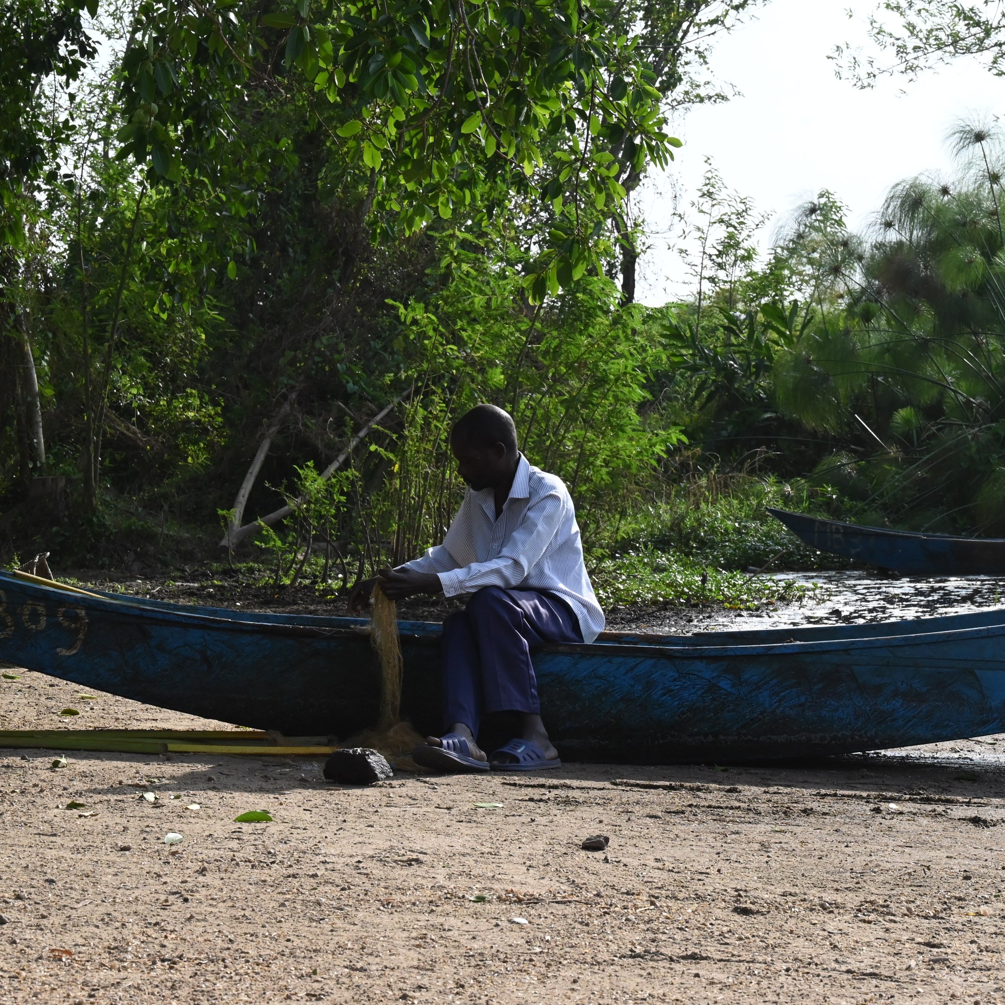 The next morning we set out for a game drive in Lake Mburo park, we first followed the trail left from the lake, where there was quite some traffic from locals who went fishing or gathered dead wood. We spotted some monkeys, warthog, waterbuck and antilope. We took the road to the little fishing village where villagers were just inspecting the caught fish from the lake. We returned to the Sanga gate and continued on the Antilope track. Here we saw zebras in several herds. We continued towards the shore of the lake, where we stopped near the water to take pictures of hippos, king fishers, fish eagle, weaver birds and a crocodile.