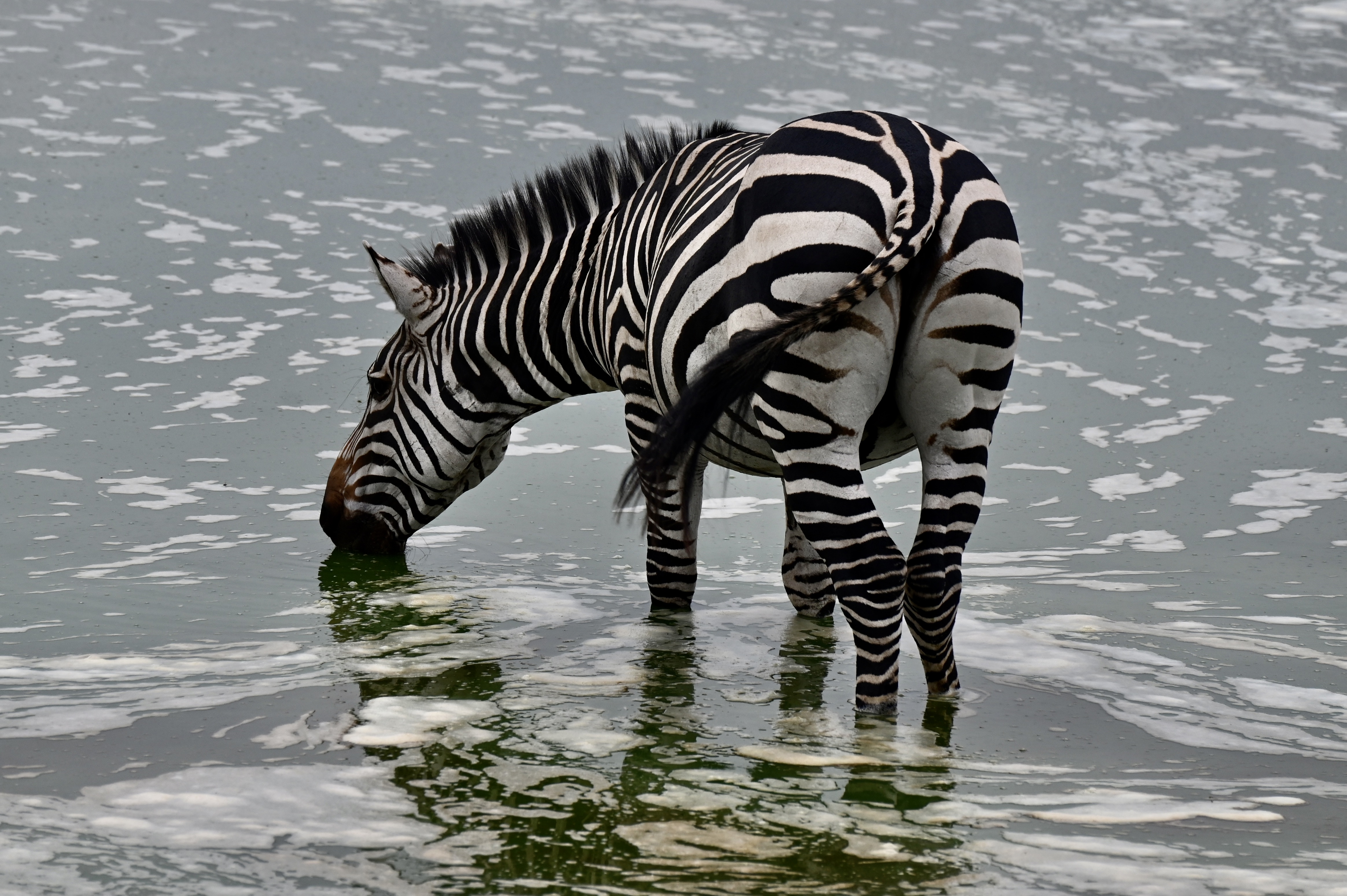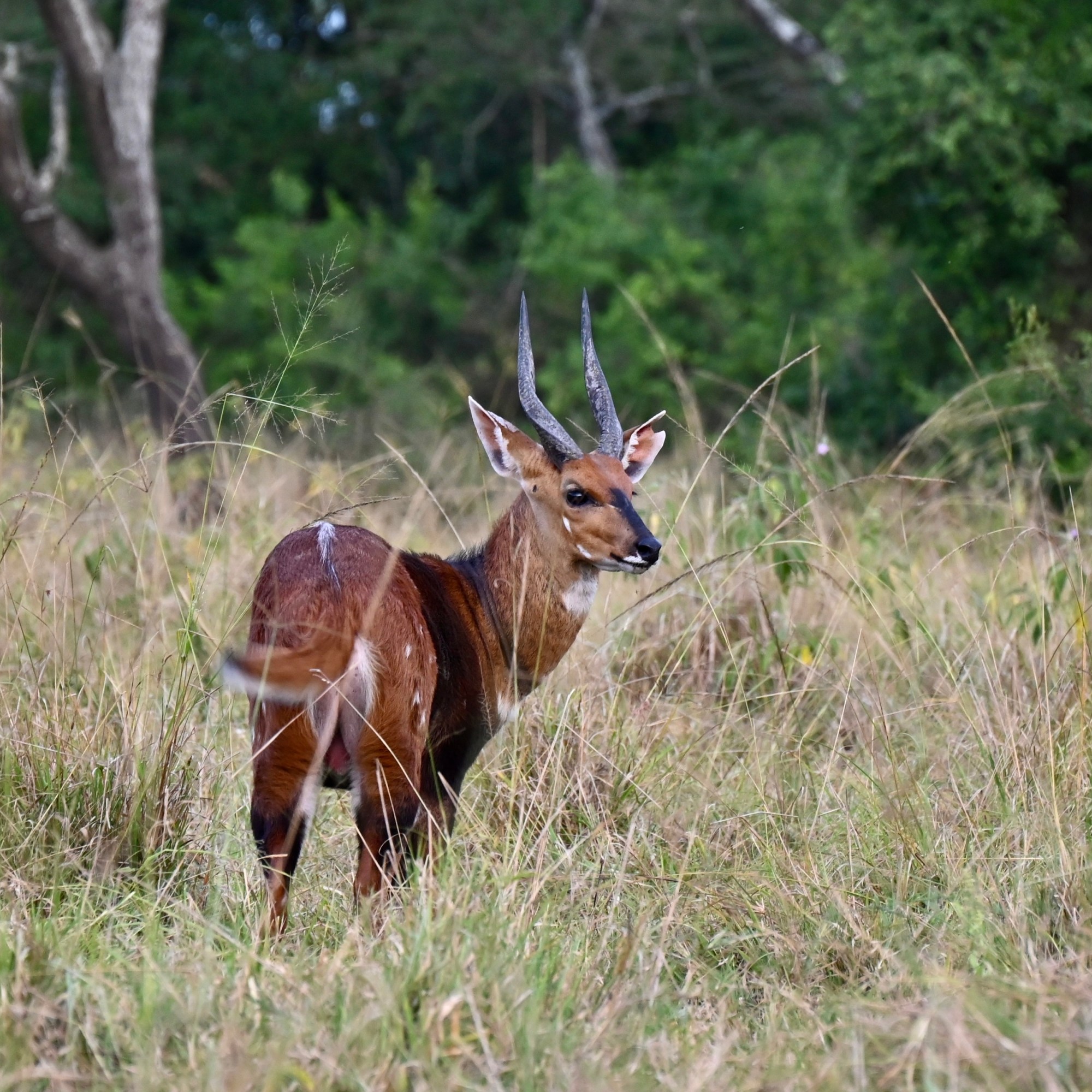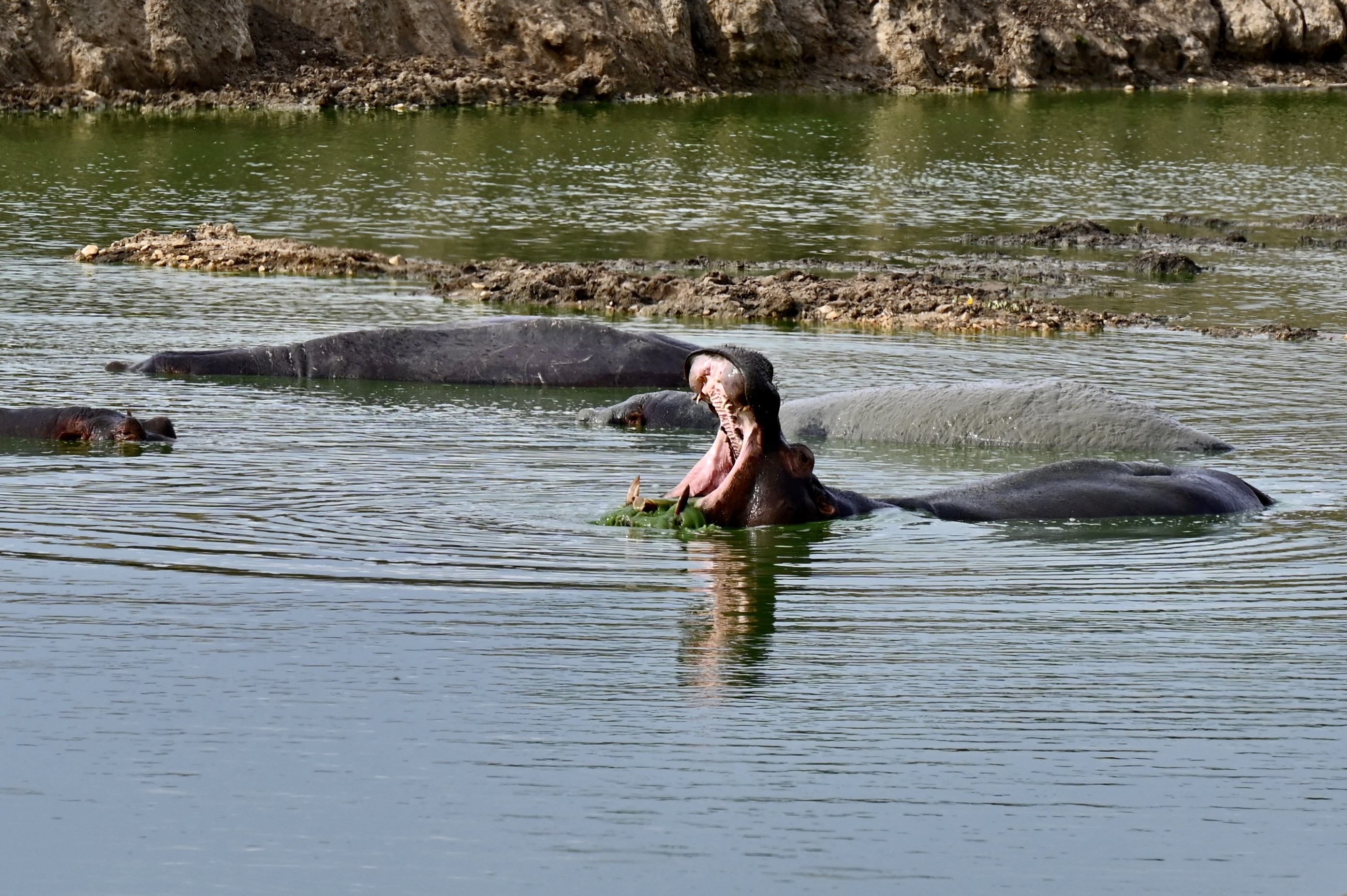 After a very noisy night because of an all night party with really loud music from the village below, we got up early the next morning to be at the gate at 7 AM for a walking safari. Luckily we had brought earplugs with us, so we were able to sleep most of the night. We had an appointment with our guide Mozes for a walking safari. The cost is 15 dollar per person. We first drove into the park to the Zebra track where we parked our car and started walking. Mozes told us a lot about plants, insect life, birds, and eventually we found the giraffes. We walked close to the giraffes and Mozes also told us a lot about them. We walked a bit further but apart from some buffalo from a distance (and we wanted to keep our distance ) we did not see a lot of wildlife. So we walked back to the car and Mozes lead us to two water pools where we found a lot of wildlife, even hippos were resting in the water. On the way back Mozes entertained us with stories about nature and local culture. We arrived back at Sanga gate around 11:40 AM. Mozes had given us a lot for our money. After lunch in the lodge we took a short siesta, and we returned to the park around 2 PM. We drove towards the two water pools again, in the first pool zebra were drinking and on the side eland and buffalo were resting. Around the pool waterbuck, antilope and warthog were roaming. We drove to the second pool and beyond it on Research track where we found a smaller pool with one hippo who can be aggressive according to Mozes. We paused at the second pool on Research Track, observing the hippos which were active. A bit later the giraffes came to drink as well. And we spotted the first bushbuck. When returning to the first pool on Link Track between Research and Ruroko Track we spotted a huge python just along the road while it slithered back to its hole on an old termite hill. Funnily the first water hole was now complete empty, not one animal was there, they must have been scared of by something (a leopard?) So we started our way back to the gate, passing by another water hole between research and Acacia track, which was now also empty. We left the park a bit before seven, and ended the last game drive of our holiday.