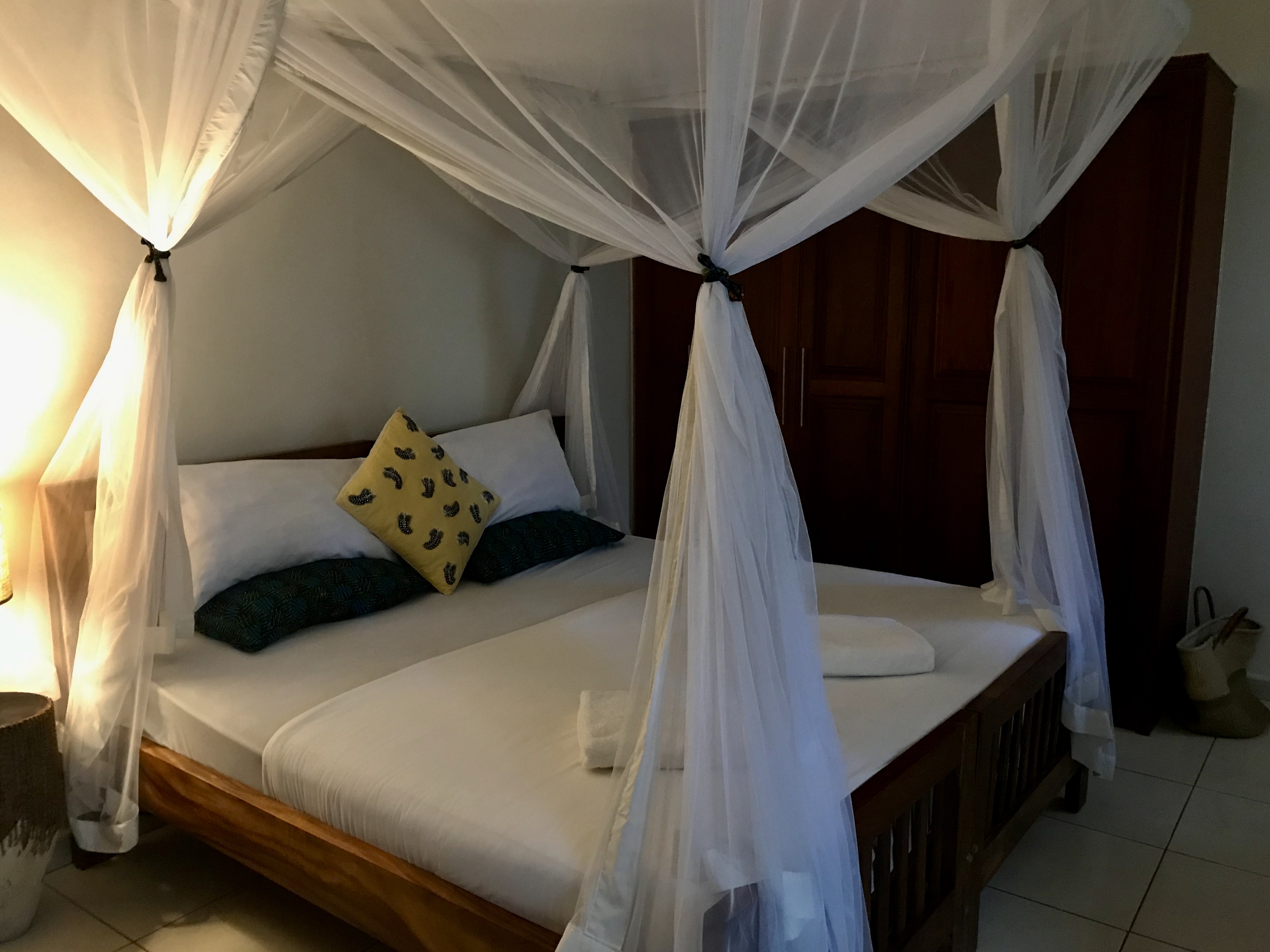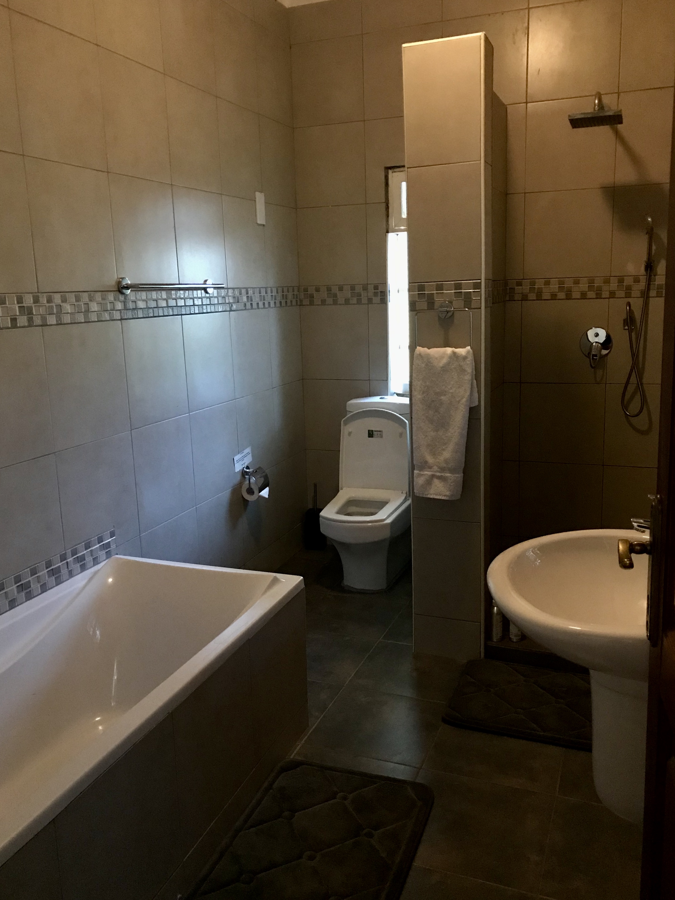 We continued our way towards Entebbe when we suddenly arrived at the ferry crossing. We hadn’t realised we had to take the ferry on this road. A line had already formed, and I got out of the car to get more information. The ferry would take another 30 min. to get to the landing where we were waiting, and there is only place for 8 to 10 cars on the ferry. The ferry is free of charge. A lady started giving passes to the cars in the line, and we were unfortunately too far in line and would have to wait for the next ferry. That meant we would have to wait at least 1,5 hour plus another 30 min for the ferry crossing. We turned around and took a right in Kasanje, this road is for the most part a dirt road that comes unto the road between Entebbe and Kampala. It took us another 1,5 to 2 hours hour to drive to the guesthouse, the Guinea Fowl. This time Esther had given us an upgrade of our room, so we slept in a spacious room with a beautiful bathroom that night.