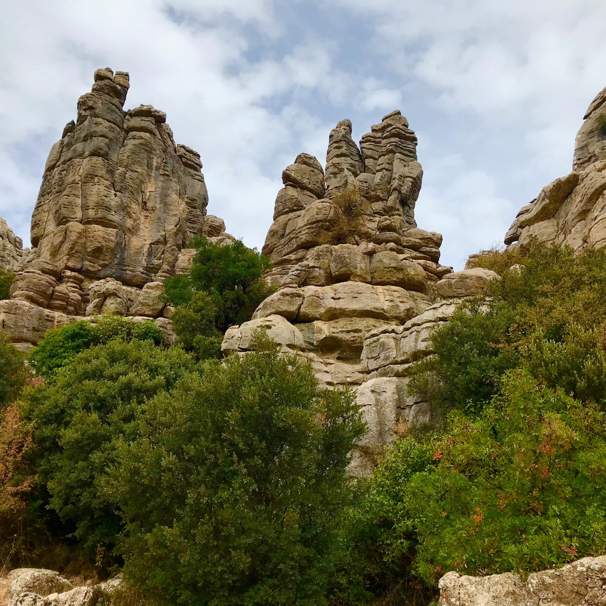 The next morning we drove to Antequera. Do not take the road coming from the West to go round Antequera, you end up in pretty small streets , so we turned back and took the North and Eastern route around Antequera, to drive to El Torcal. The upper parking lot was already full when we arrived after 10 AM, so we were directed to the lower parking area, where we managed to get one of the last camper spots. We could then choose to take the shuttle bus for 2 euro per person, or walk up via a hiking path that starts at the far end of the parking lot. We decided to walk up the 3,5 km to the visitors centre of El Torcal where the hikes start. The walk up is already very beautiful. At El Torcal Alto, we chose the long walk in the park, the yellow trail of around 2 hours. It is a stunning place, where water and ice have eroded the karst rocks into the most wonderful forms. The only and big downside were the masses of Spaniards making lots of noise, talking and shouting and even singing, taking away much of the wonder of the environment. Because of that we walked the 2 hour walk in just 1,5 hours. 100 metres from the visitors centre you have a beautiful view, but because of the fog we saw nothing. We walked the same way down to the parking area as we came up. This makes the 2 hour walk into a 4,5 hour hike. If possible undertake this walk on a weekday and outside of weekends or holidays. (We did it on a Sunday of a long 1 November weekend…)