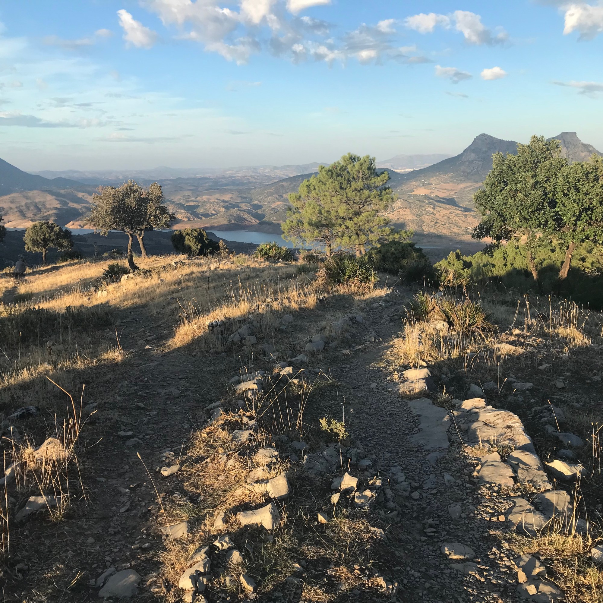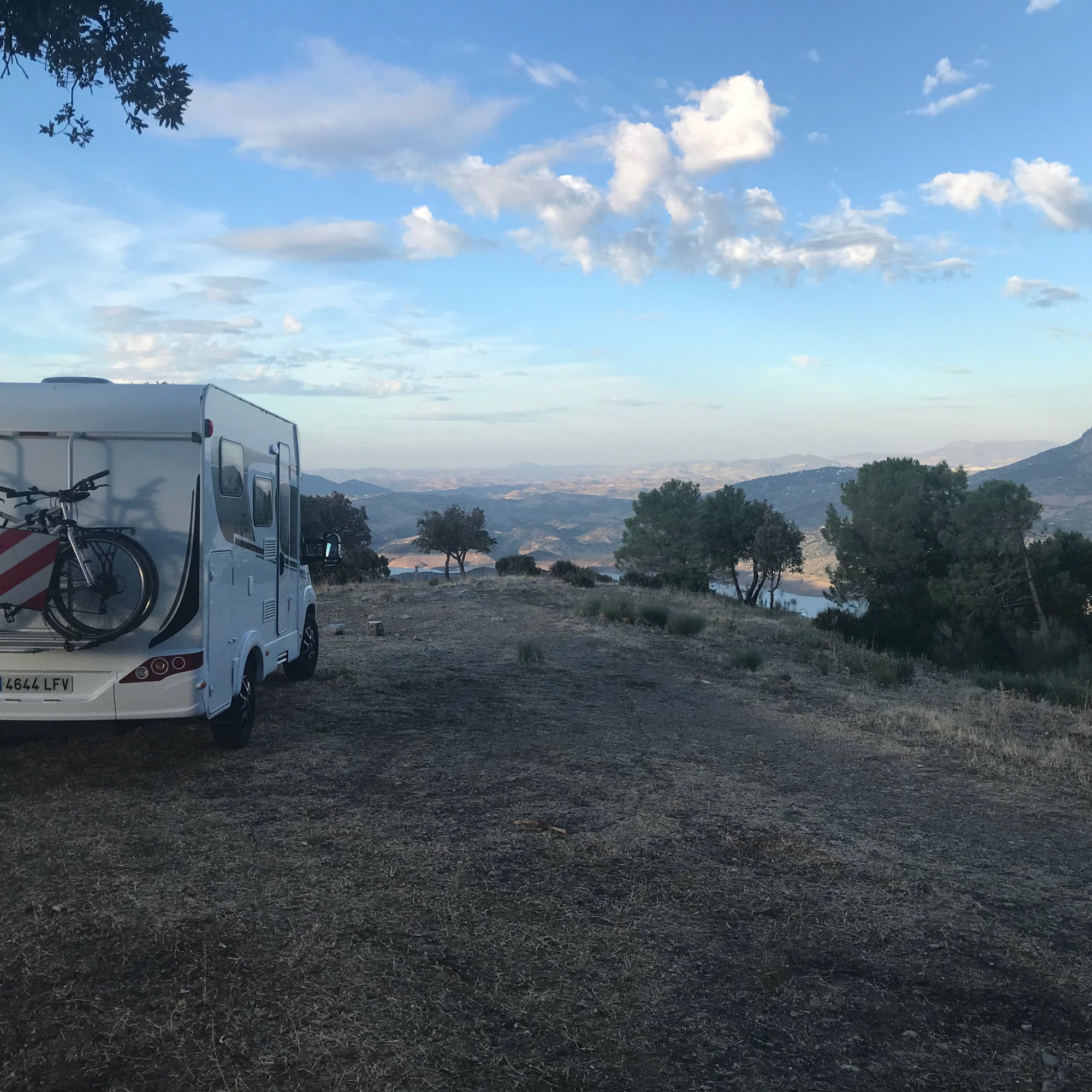 We walked back to the camper and drove towards the start of the Gargante Verde walk which we would do the next day, to see where we could park for the night. I had set my eyes on one of two miradors on this, by the way really stunning road between Grazalema en Zahara de la Sierre. But on the miradors and on the parking of the Gargante Verde a sign stated clearly you could not park a camper or caravan overnight between sunset and sunrise. At the opposite side of the road from the second mirador was a clearing with a stunning view of the water bassin next to Zahara de la Sierre. We decided to risk it and parked our camper there at around 6 PM a little before sunset and enjoyed the sun setting over the hills. Nobody bothered us, but the next morning, just as we were leaving, a police car turned up, to tell us we were not allowed to park here. We answered we had just stopped for some pictures, and after they told us that in that case we had to park at the car park of the mirador at the other side of the road and that we were not allowed to park here overnight, they let us continue. So we got away with a simple warning.