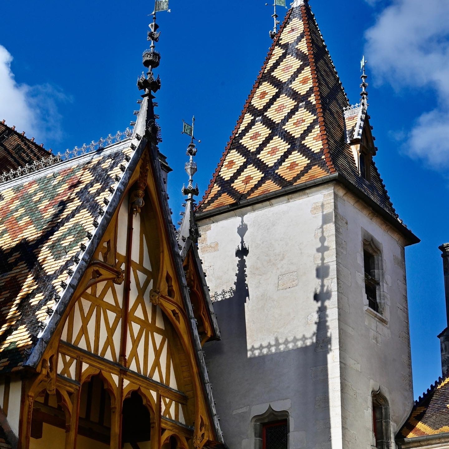 The attraction of Beaune is its hospice, or Hôtel-Dieu de Beaune, a former almshouse founded in 1443 by Nicolas Rolin, chancellor of Burgundy at the time, and his wife Guigone de Salins, as a hospital for the poor, in typical 15th century gothic Burgundian architecture, but for the most part built by Flemish architects and artisans. Burgundy was then under the rule of Philips the Good. The glazed-tile roof is one of the finest in its sort in France and probably has its origin in ceramics from Hungary. For the chapel Nicolas Rolin and his wife commissioned Flemish primitive painter Rogier van der Weyden to make an altarpiece of the last judgement, featuring Rolin and his wife on the outer panels.