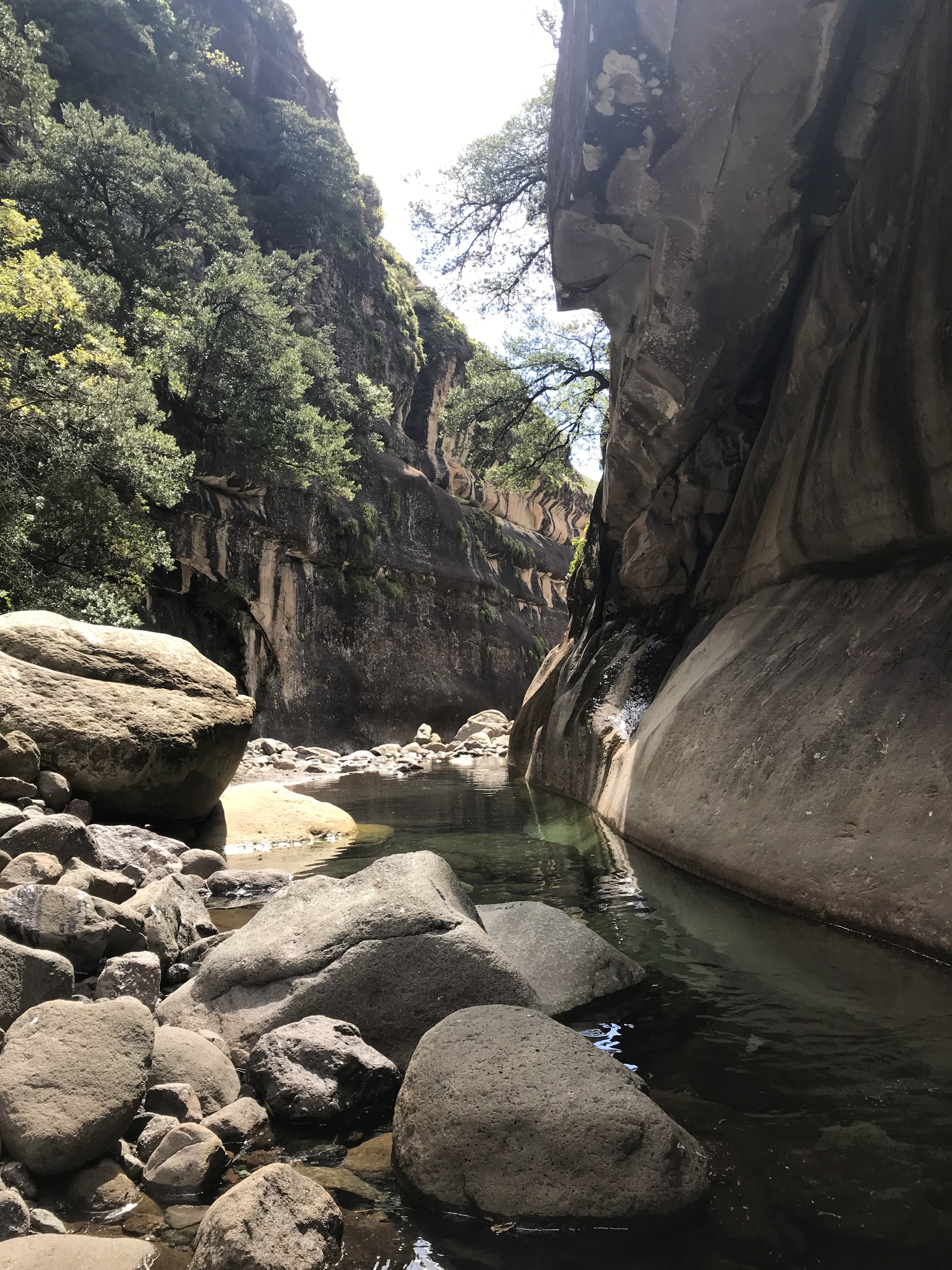 The trail starts at the ablution block, after a short walk you cross the river over a bridge, and then you just follow the 6 km path that goes through fields and forest areas, with wonderful views of the mountain range around you. You also see the rock by the name police helmet on your right on the first part of the hike. Take a hat, sunglasses and sunscreen because the first 6 km you walk under the scorching sun. You then reach the gorge, with the river in the middle, where you have great spots to have lunch next to the water, you can even take a dip in the water if you want to, but it is very cold! You then continue upstream in the gorge, hopping over boulders, crossing the water a few times, after which you can continue above the right bank until you reach the tunnel. There is a ladder on the right side to climb up and skirt the tunnel, but it is temporarily closed. My husband did climb the ladder, which was fine, but further up there was a lot of rubble which made it impossible to continue. And wading through the tunnel wasn’t really an option either. So we decided this was the end of our trail. We walked back and finished the hike after 6 hours.