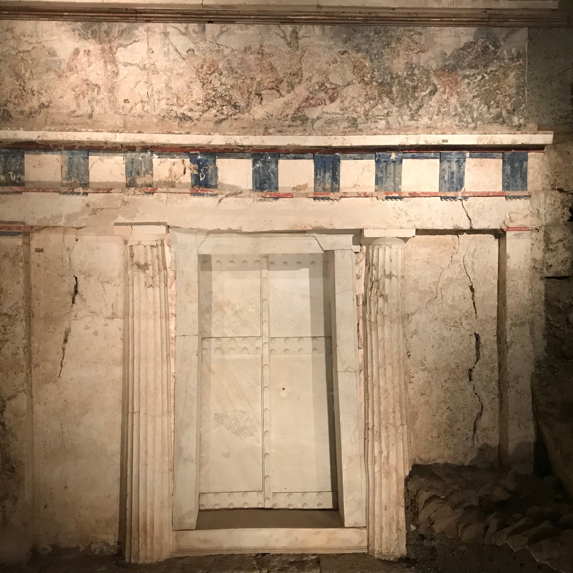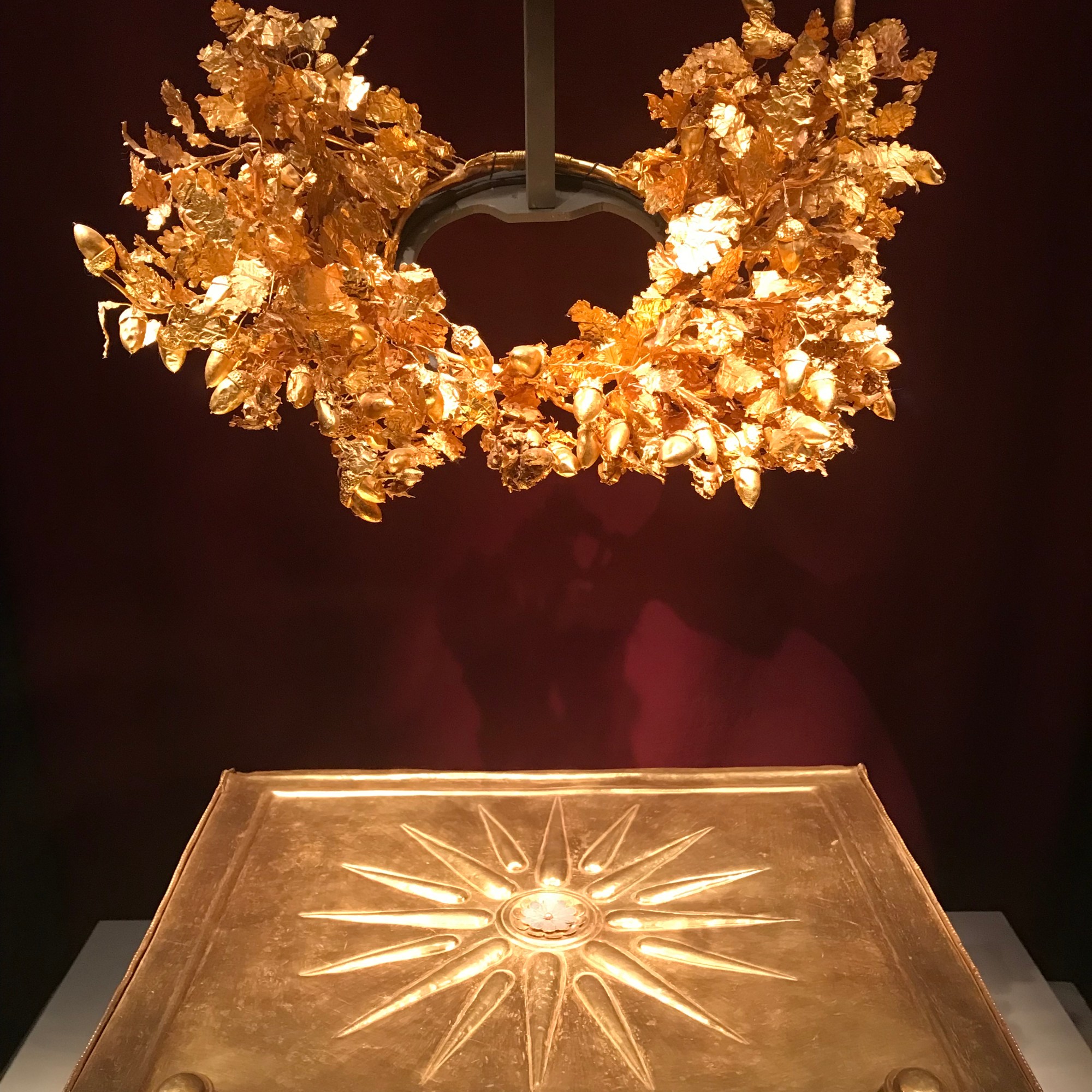 The entrance of both tombs can be admired behind glass, and in the museum among the many treasures on display you find the sarcophagus, a gold ossuary, gold leaf wreaths, Philips’ complete suit of armour, his shield, helmet, royal diadem, all kinds of plates and vessels for a banquet, and in the antechamber a second gold chest containing the bones of a woman, that have been attributed to Meda, the king’s sixth, Thracian wife.