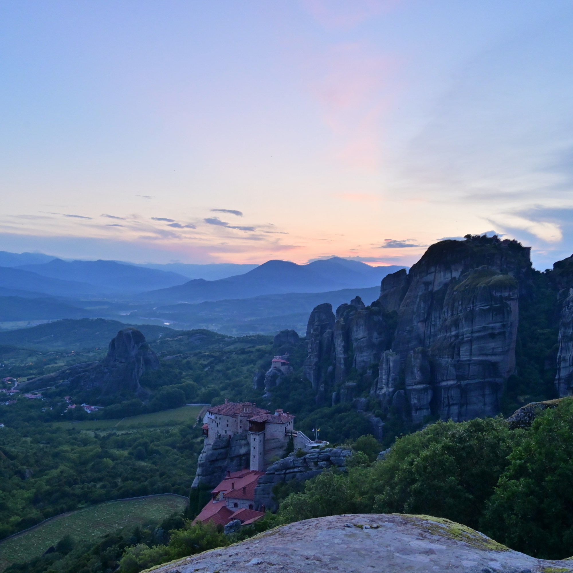 We had dinner at restaurant Gardenia, we both chose a moussaka and a salad. Just before dinner the sun came back out, so we quickly drove back up after dinner to enjoy the sunset, with beautiful evening colors behind the rock formations of Meteora on the viewpoint just past the Rousanou monastery.