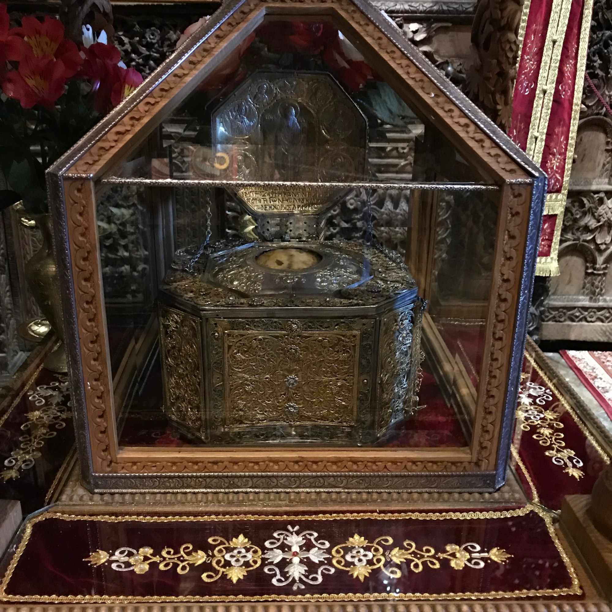 The next morning we checked out after breakfast and drove up to see the other monasteries. We first drove up to Saint Stephens’ monastery, which is now a nunnery, just above Kalabaka. St. Stephens’s monastery opens at 9:30 AM on Sunday. Best check the opening times on Sundays, many of the monasteries open later on that day. This is the largest monastery, and you do not have to climb any stairs, just cross a bridge. Even early in the morning busses are already lining up at the monastery. The monastery has two chapels but you can only visit the newer 18th century church, with very bright new frescoes. The old church is used by the nuns. In the church you find the relics of Saint Charalambus (his skull), protecting against illness. In the old refectory you find a museum with old manuscripts. The monastery suffered from heavy bombardments during WWII, desecretions during the civil war and destruction of frescoes by the communists. The monastery of St. Stephen was actually abandoned until 1961, before becoming a nunnery.