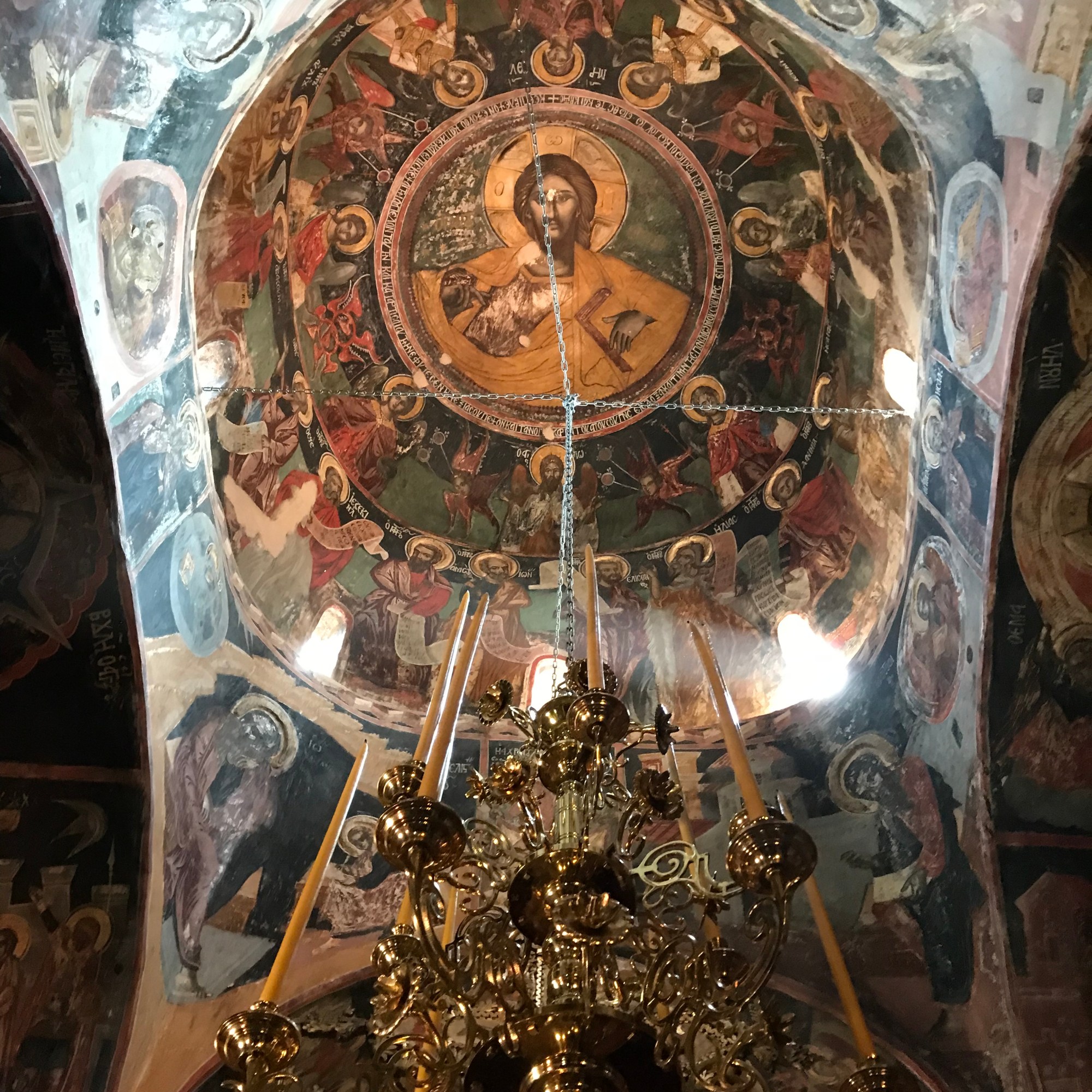 We then drove over to the Holy Trinity monastery, located at the top of one of the most picturesque rocks of Meteora. You have to climb quite some stairs. This monastery is inhabited and sustained by just a few monks and is the most serene of the six monasteries. It was together with Varlaam my favourite monastery in Meteora. The monastery was built in the 15th century. The chapel is small but decorated with beautiful frescoes that date from the 17th and 18th century and haven’t been overpainted by new restorations. The figures are painted with soft and fine expressions. Like all other chapels it consists of a sanctuary, a nave and a narthex. We sat all alone in the church and really enjoyed the serenity of the place.