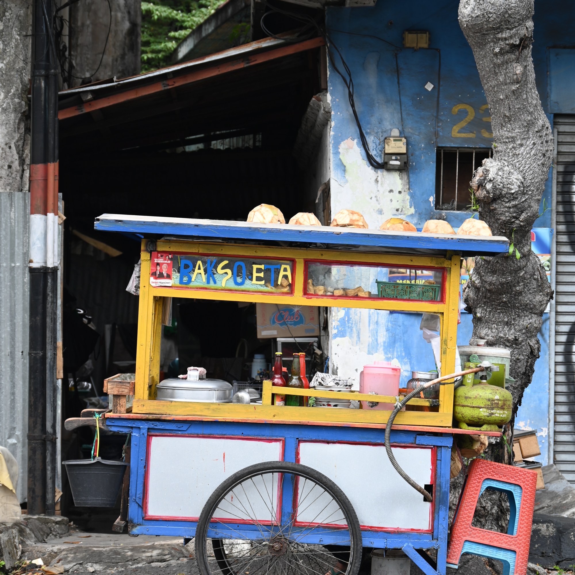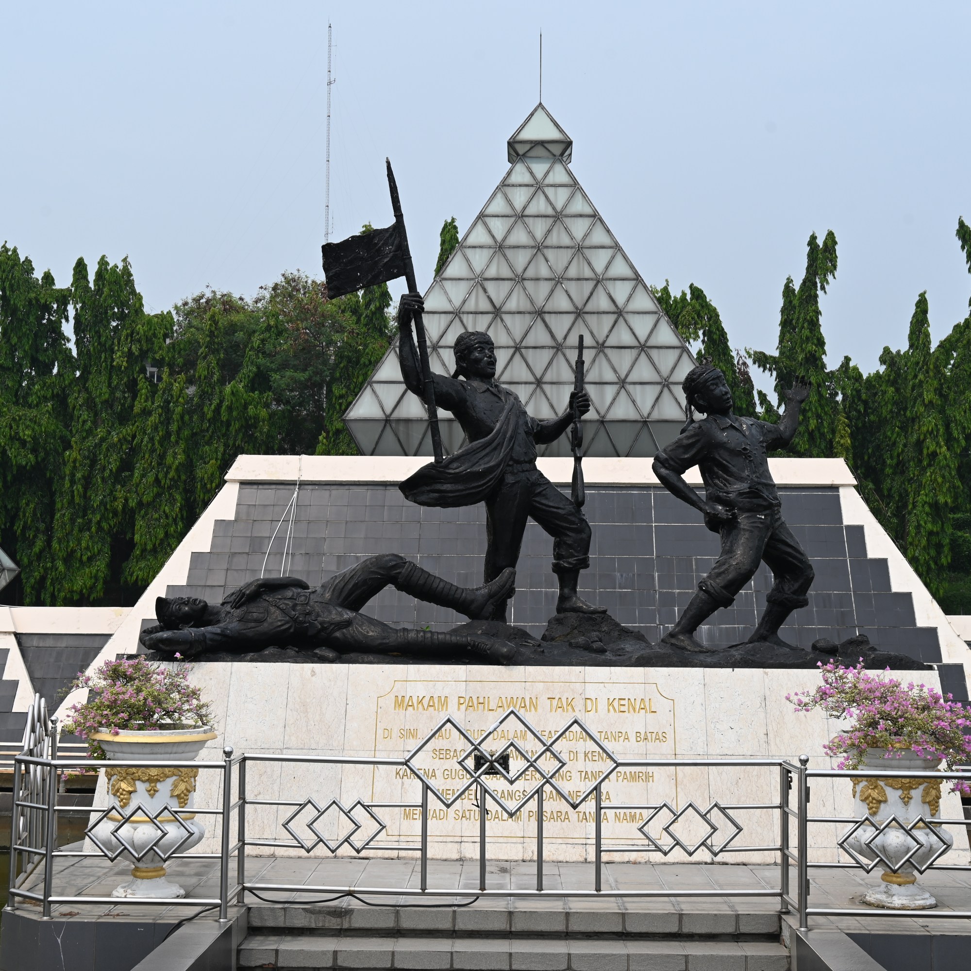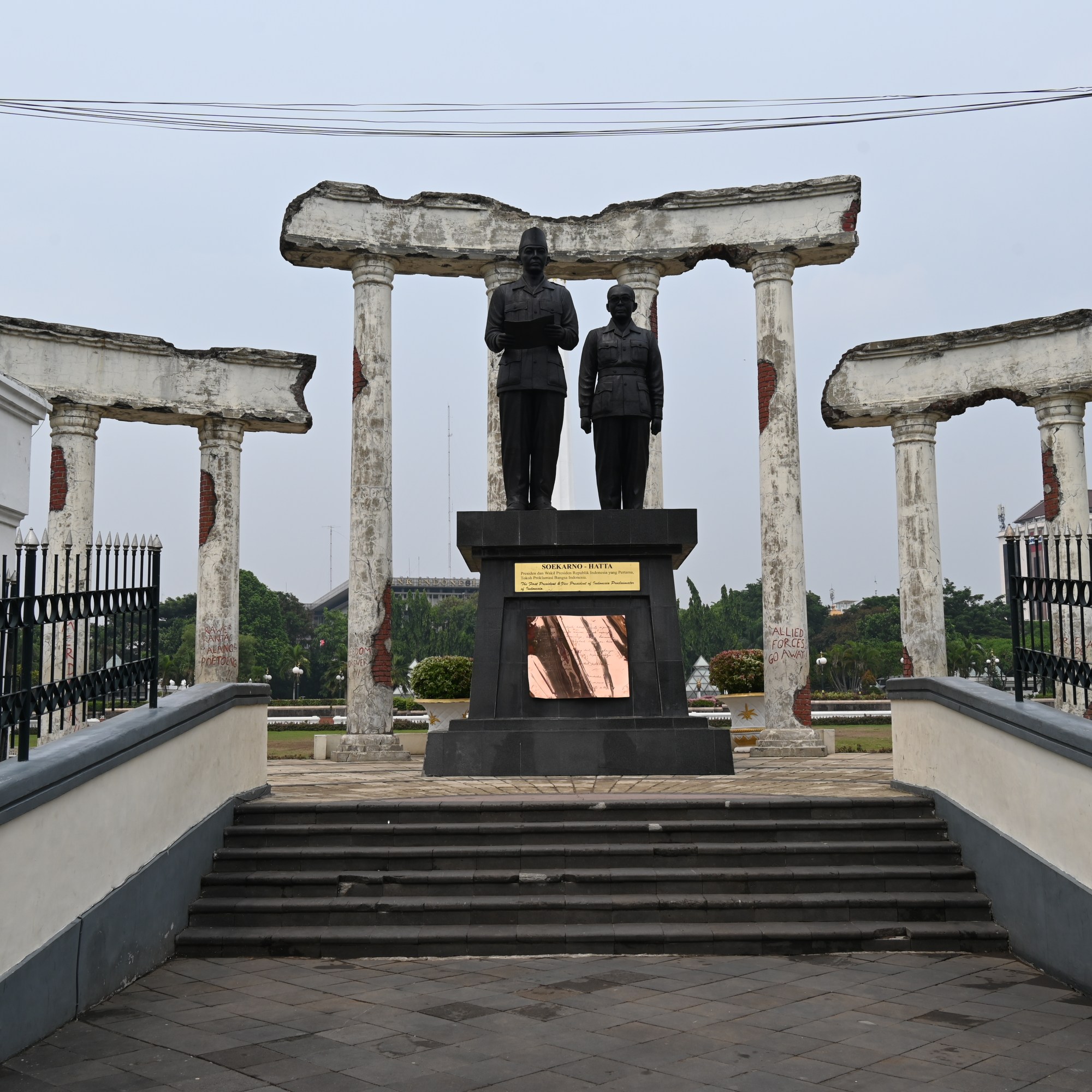 After breakfast we walked towards the old town, made a stop in the Kriya gallery, a great place to buy an original souvenir, batik textiles and contemporary style clothing with batik and ikat prints. We continued until we reached the canal, and stepped into one of the photography shops to buy some lens and sensor cleaner. Since we were close to the old town we decided to continue. Between the large streets you find green alleys and a bit further on we stumbled upon Tugu Palhawan or the The Monument of The Heroes, that commemorates the heroes that fought for Independence on November 10, 1945. The monument is a large upside down nail symbolizing the sharpness of spirit of the fighters who fought the allied forces. There is also a large statue of Soekarno and Hatta placed against the ruins of a colonial building, and some reliefs on either side telling the story of colonization and the fight for independence. There is a large garden with statues of the heroes and a little museum.