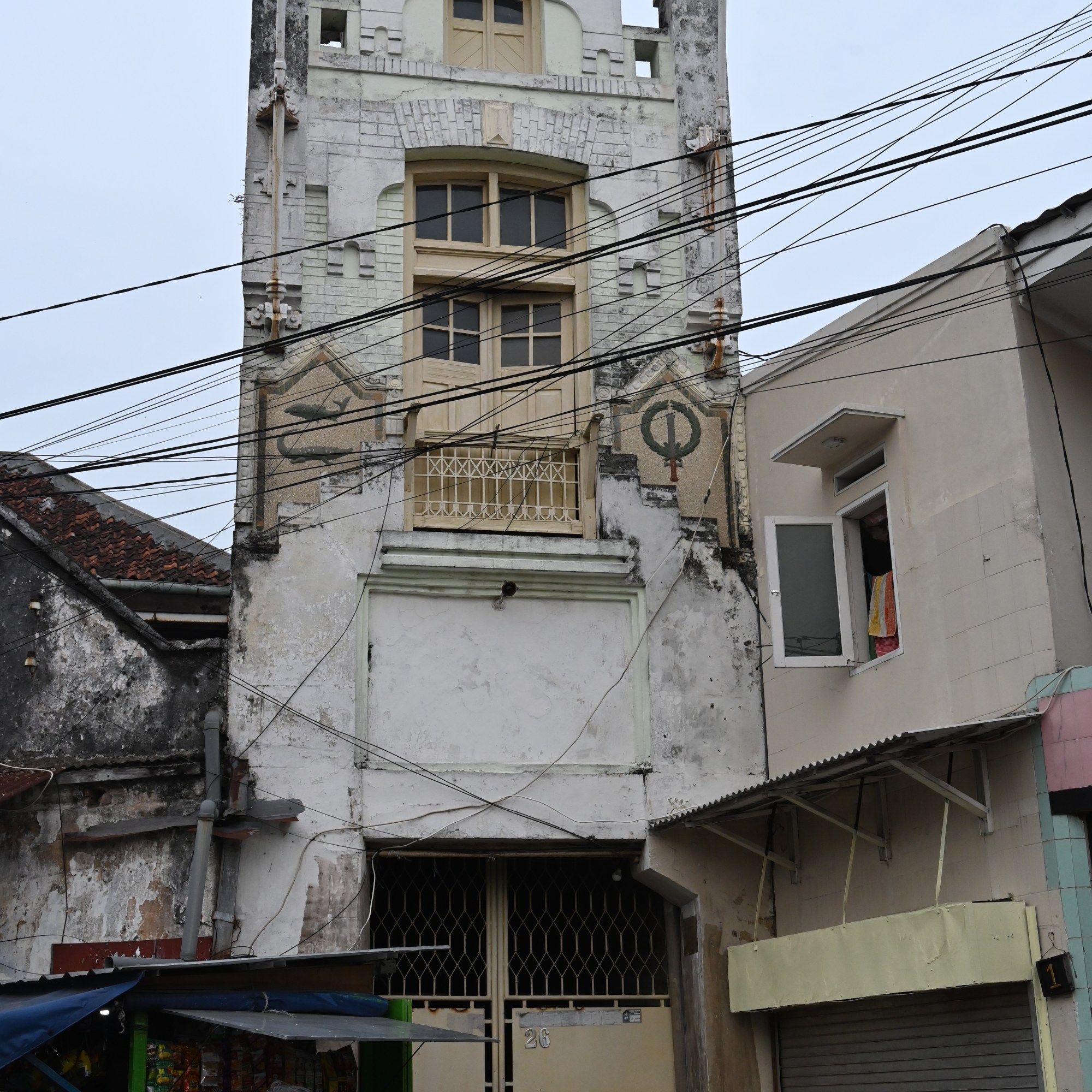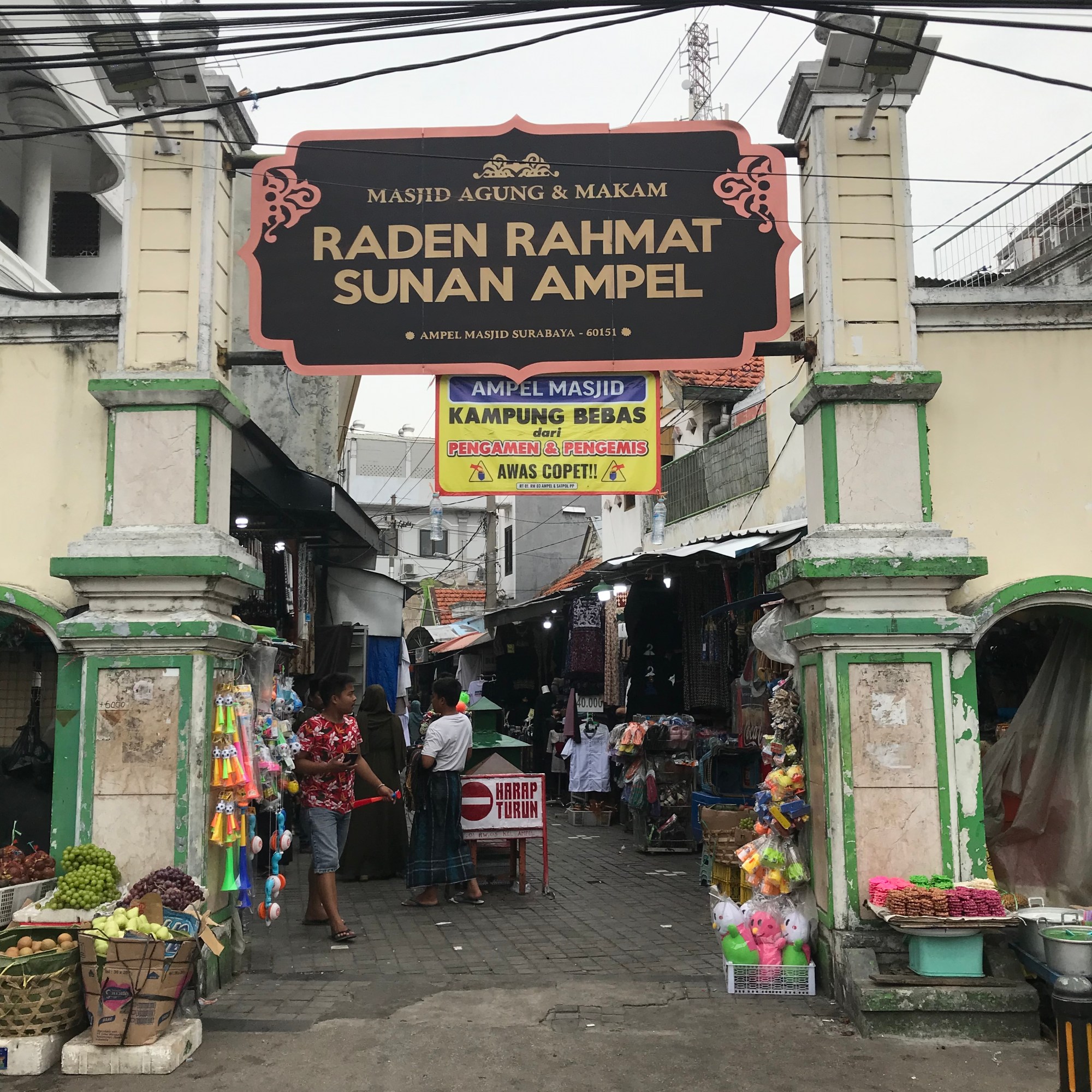 We returned with a Grab car to the hotel to freshen up and around 3 PM took a Grab car to Jembatan Merah, a bridge that used to ethnically divide the city. On one side the Europeans lived and on the other side the Arabs, Chinese and Javanese. Crossing the bridge you come into a totally different part of the city, with a whole different atmosphere. You first see the red gate that is the entrance to the Chinese quarter with its red lanterns adorning the street. We turned left into Panggung street, that leads into the Arab quarter where you walk straight onto the fish market. There is a covered part on one side, the Pabeang market, which we did not enter since our shoes were not adapted to the mud and water coming from the melting ice to keep the fish cold and fresh. The sellers wear rubber boots for a reason. The fish sellers stand on both sides of the narrow street with every kind of fish, shellfish, prawns and octopus. The old buildings on both sides are painted in bright colors. At the end we walked into Sasak street where they sell korans, dates, spices… At the end of the street you can walk into the Arab souk like market leading towards the ancient Ampel mosque or the Great Mosque. In the market they sell textiles, praying beads, spices, dates, perfume and much more. When you turn to the right you come into another part of the market. At the end we turned right again and walked towards the canal via the very quiet Jalan Kalimas Udik II, where suddenly all the hustle and bustle of the city and its traffic disappears. We then walked past the river on Jalan Kalimas Tumur, where we passed the Syabandhar tower built during the Dutch occupation and used to be a watch tower over the port. The many old warehouses stand testimony to the old port and merchant activities here during the Dutch colonial period. We walked back to Jembatan Merah, crossed the bridge again and called a Grab car back to the hotel. We crossed the street and had dinner in Wizzmie, a cheap and very popular halal eatery for spicy fried noodles and rice bowls, which can be combined with sushi plates, dim sum, chicken wings or spring rolls. We then had an ice cream at the Gelateria, where our ice-cream costed more than our dinner ( 76000 and 63000) which means we had a dirt cheap but tasty dinner.