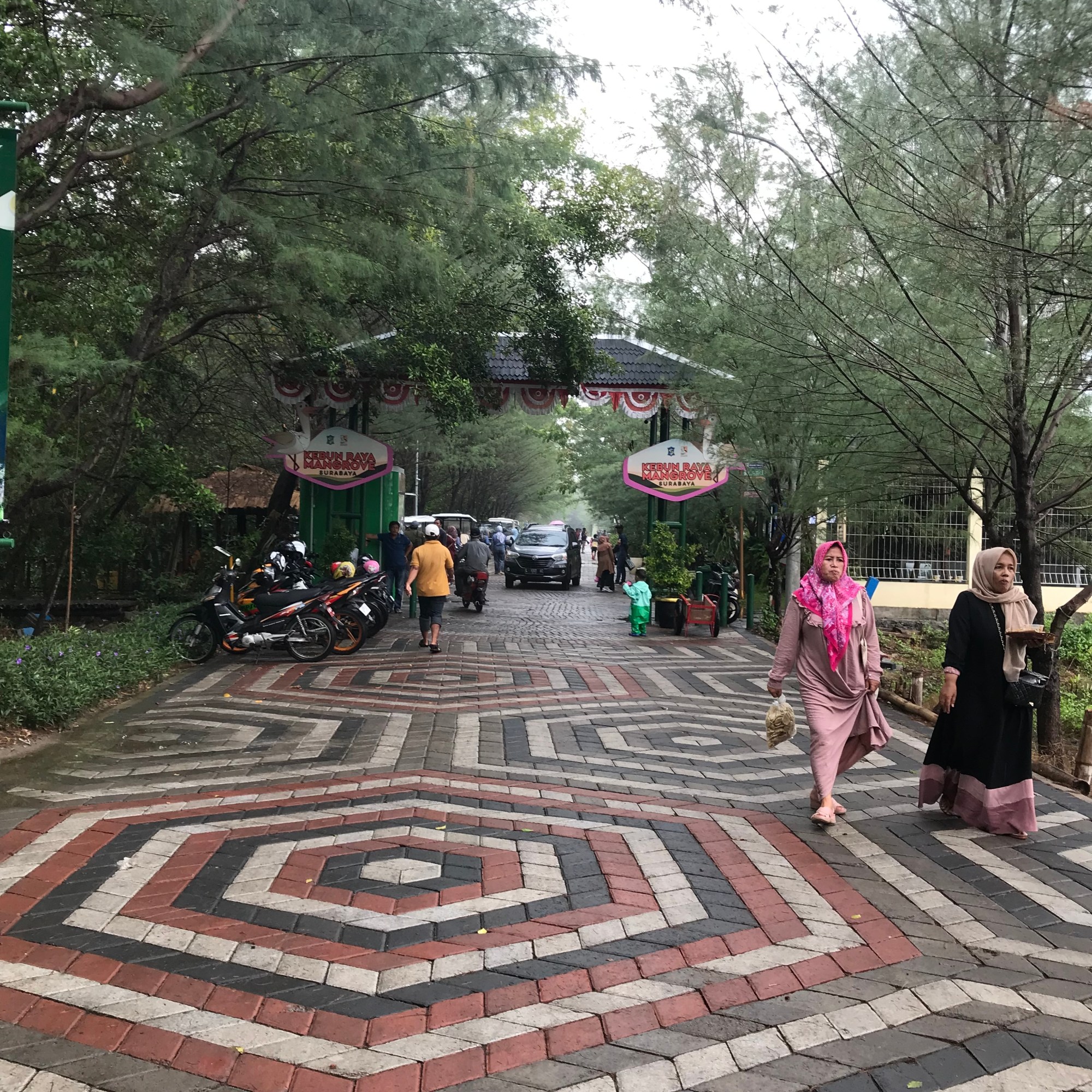During breakfast the next morning we noticed there was no traffic on the normally very busy road in front of the hotel. Every Sunday Surabaya has a traffic free day, not a whole day but a traffic free moment from 6 to 9 AM. Surabayans come to the streets on their bikes, walk, run and the children play football and games in the middle of the street. Unfortunately at 9 AM the busy traffic takes over again. Jakarta also has traffic free days in parts of the city. But they shouldn’t call it traffic free days, since it is only lasts a few hours in the morning. After breakfast we decided to visit the mangroves of Surabaya. We were desperate for some nature and quiet. The mangroves are about 30 minutes away by car. There are two places you can visit. The Mangrove Wonorejo Rungkut or Wonorejo Ekowisata Mangrove, in English Wonorejo ecotourism mangroves and the more recently openend Wisata Mangrove Gununganyar and Kebun Raya Mangrove. We decided on the second one since the reviews about Wonorejo Rungkut mangroves were not very positive. Many said it smelled really bad and was rather polluted. The driver dropped us of at the parking area. From the parking area we walked to the first part which is the Kevin Raya Mangrove where we walked the rather short boardwalk in just a few minutes. There isn’t much diversity in plants in the mangrove, but there is a nursery where they grow several species. We met lots of people who came here with loads of food to have a picnic. There is also a small visitors’ center but the information boards are only in Indonesian. It suddenly started to rain very hard so we stayed in the visitors centre until it was over. We then continued in the direction of Gununganyar mangrove, and a bit further we saw quite some small white herons and some other bird species on the water. We wanted to continue to the pier, but the rain had unleashed the mosquitos and I was suddenly eaten by them. The place is disappointing, very superficial and not very well managed . We decided to return to the hotel and called a Grab car. If you go, do take mosquito repellent, because they were really ferocious after the rain.