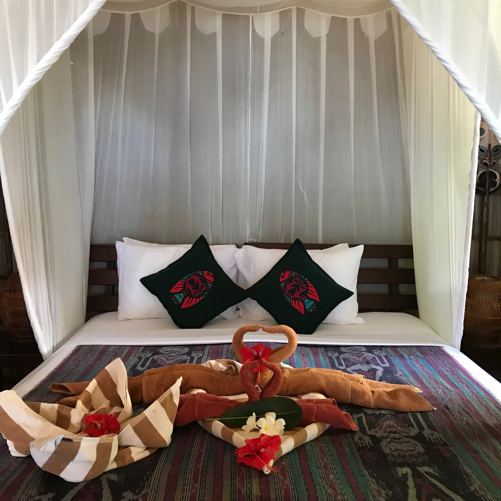 The variety of the food at the resort is amazing, it was the best food we had in Indonesia. And the energy and friendliness of the staff is also exceptional. It creates a vibrant, feel good atmosphere. You get to know all other guests in a relaxing and informal way. No one claims a certain seat at one of the two long tables, so you often sit together with different people every meal, or you choose a specific person or couple to continue a previous interesting conversation.