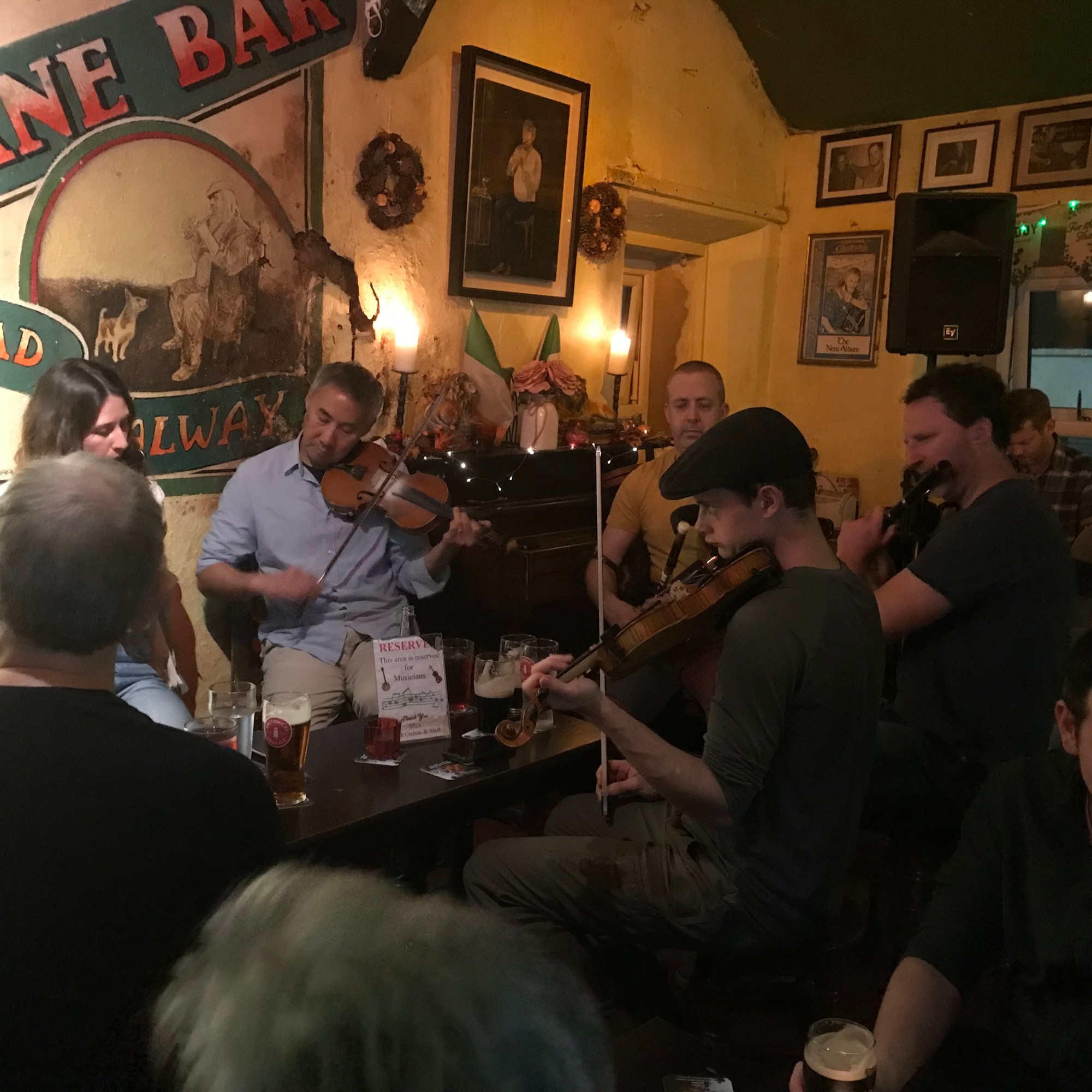 We ordered a glass of champagne for my husband and I against my principles I ordered a mocktail which really pleasantly surprised me, it was really very good. The waiter later told me they make all their sirops and infusions for the cocktails and mocktails themselves. We ordered some plates to share, we tried the local oysters, which were good, but not extra ordinary. All the other dishes were really good and nicely presented, they also serve vegetarian dishes. And the service is super friendly and pleasant. The place comes highly recommended and scores high on both atmosphere and quality. After dinner we returned to The Crane Bar, where musicians played on the second floor. We still managed to find two empty stools and enjoyed the last three songs of the first band, who let the public join in the signing. I loved it. Many people left after this first gig while others arrived. The first band played from 6:30 till 8:30 and the second gig started at 9:30, which was an open mic, meaning that several musicians joined in to play together. The leaders were a fiddler and a flute player who were joined by others playing different instruments. They played wonderful but overall a bit repetitive, so we left halfway since I was quite tired after the previous short night. The gigs on the second floor are on a small podium where people listen quietly to the musicians.