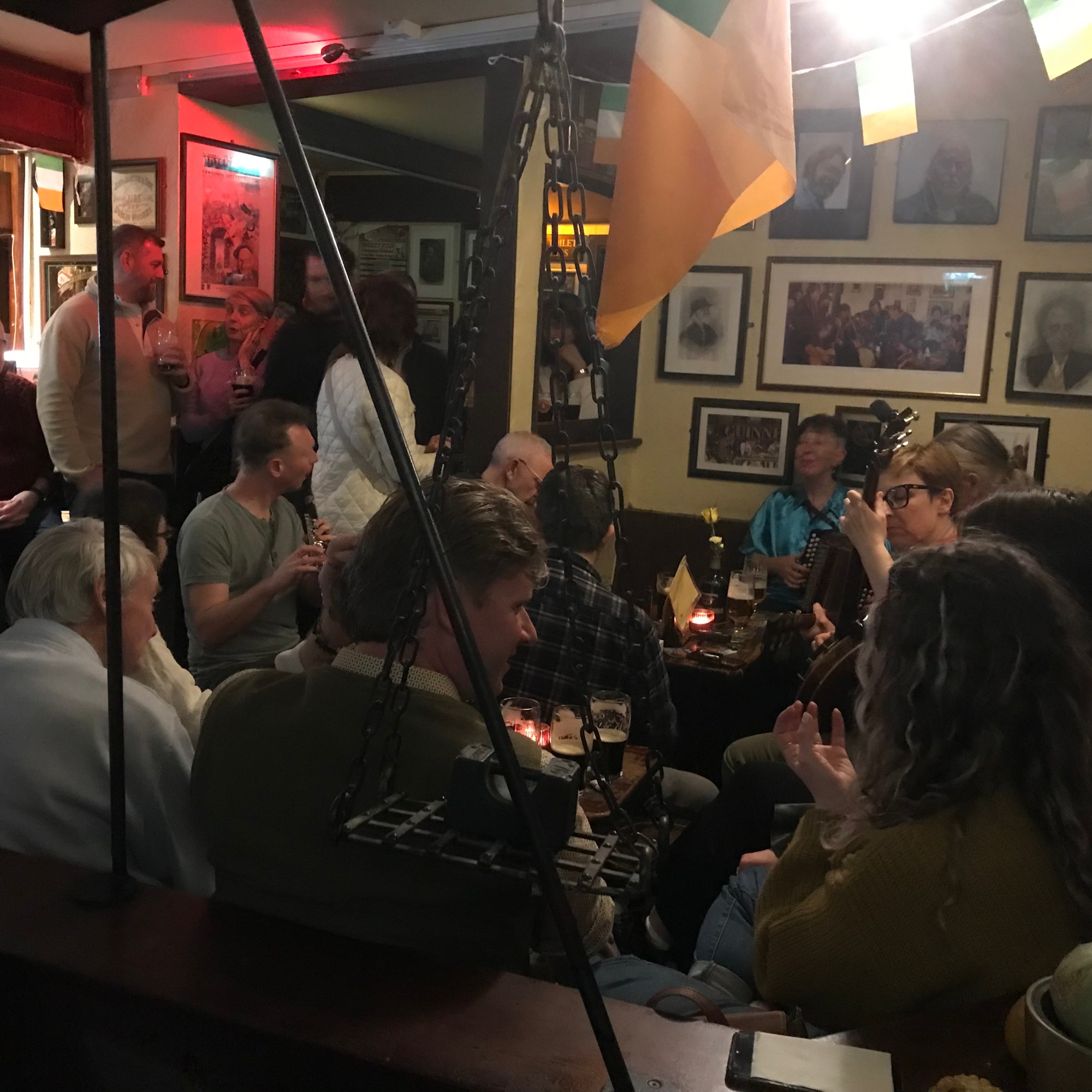 We then walked over to the Black Sheep in Capel street to have dinner. It was one of the only places that was open on a Monday evening, the place is very lively and the food is very decent pub food, they also have vegetarian options. After dinner we headed to The Cobblestone pub on King street where they play live music every evening of the week. The place was packed and an Irish traditional band was already playing, we could not really get close enough to the listening area to really enjoy he music, but started a conversation with a lady who was one of the musicians who would start the next session at 9 PM. She also was waiting for the first band to end to grab a playing spot for her and her friend. We had a nice and really interesting chat about traditional music and dance eduction in Ireland, she herself worked as a schoolteacher. Together with her we moved towards the playing area every time a spot came free, and by the time the second band started she had managed to secure a good playing spot for herself and her friend (who played the banjo) and we had managed to secure two high stools in the listening area. My husband ordered two Guinness 0,0 out of a can, they did not have it on tap, but is was quite good. The second session was led by the duo of the band Ispíní na hÉireann or the ‘Sausages of Ireland’ led by banjo player Adam J. Holohan and guitar player Tomás Mulligan, a punk Irish traditional band, who brought a very lively set. They often play ‘The Full Irish Session’ at The Coblestone Pub when other trad musicians can also join in. Our friend Eibhlin (Eveline) Ni Bhaoighill turned out to be a real good accordion player and led some of the set herself. She also plays every Wednesday evening in O’Donoghues on Merrian Row, starting at 8:30 with a singer arriving at 9PM for an interactive and sing along set. I will surely go and listen on my next visit to Dublin! The pub was packed, unfortunately some of the tourists did not understand that one should listen to the music when standing or sitting in the listening area of the pub. It was a great way to round of my last evening in Ireland.