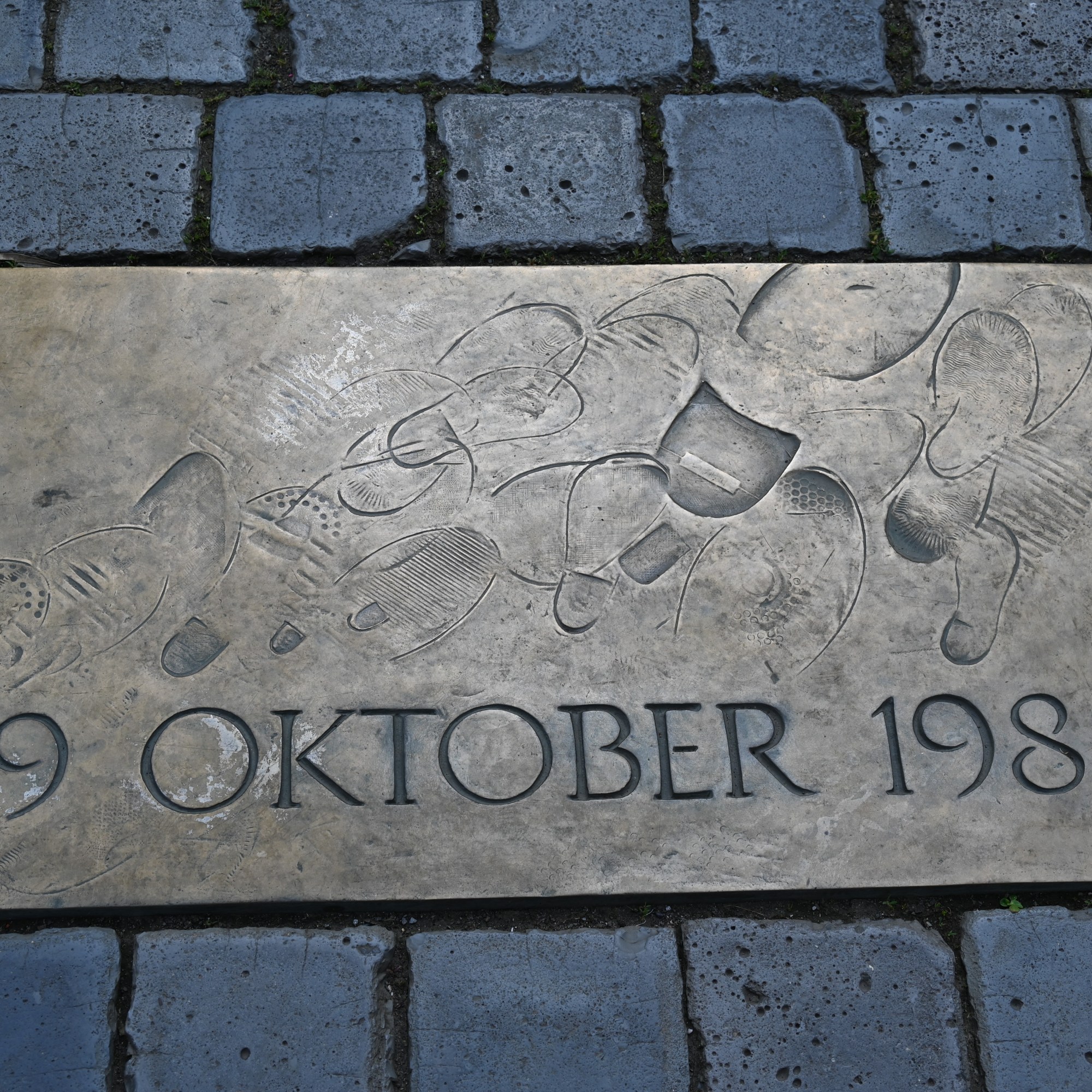 We entered the Saint Nicholas church also dating back to the 12th century, many works by Bach went in premiere here. The church is most famous for the 1989 Monday demonstrations that took place here, and became the centre of the peaceful revolt against communist rule. The demonstrations started on September 4, 1989 after the weekly Monday prayer for peace when they gathered in front of the church demanding freedom of travel and democratic elections. Outside the church you find several monuments commemorating the revolt, the most visible one is the Saint Nicholas column, crowned with the palm you also find in the church, a fountain that overflows and symbolizes the final straw or final drop that makes the cup overflow, a plaque on the square with footprints and a light installation of 144 colorful cubes in the pavement of the square. Every year on October 9th, Leipzig holds the light festival to commemorate the peaceful demonstration of 70000 people on October 9th, 1989.