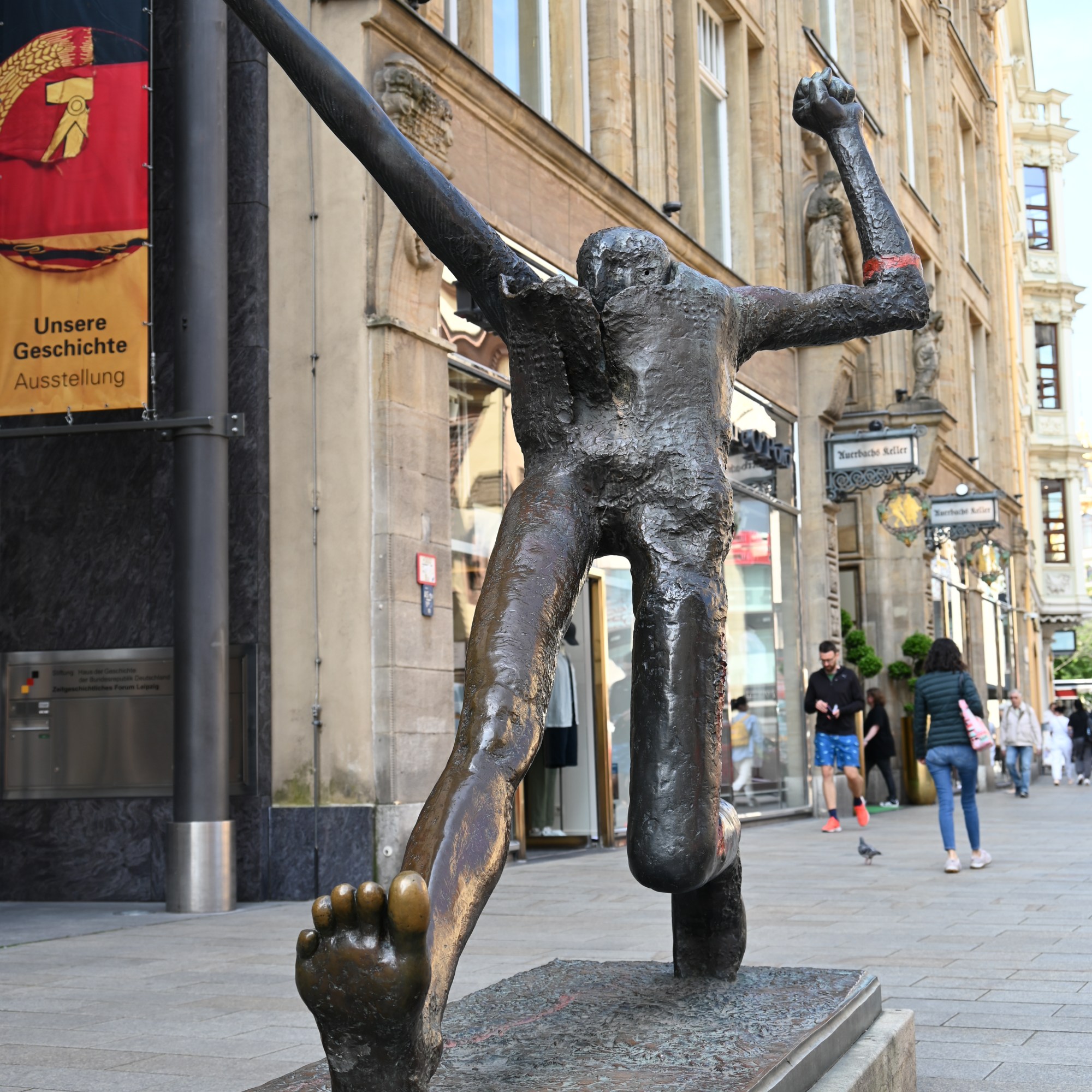 The first morning we discovered the city centre on foot, walking through the main Grimmaische Strasse, where you find a statue by Bernd Göbel, Untimely Contemporaries, a statue that holds all his frustration about the hypocrisy of communist East Germany. A bit further another contemporary statue: The Century Step created by Wolfgang Mattheuer in 1984 and considered one of the most important works of art of the GDR in times of the German division as a parable on the fragmentation of the 20th century. One arm shows the Hitler salute while the other becomes a communist fist while one leg is naked and the other one has a boot on. On the square on the right you find a statue of the German writer Goethe, and almost opposite the Mäddler passage where Goethe found inspiration in the wall paintings of Auerbach’s Cellar for his work Faust. At the entrance of the cellar, a famous old restaurant, stand two sculptures showing Mephisto and Faust on one side and the Bewitched students on the other.