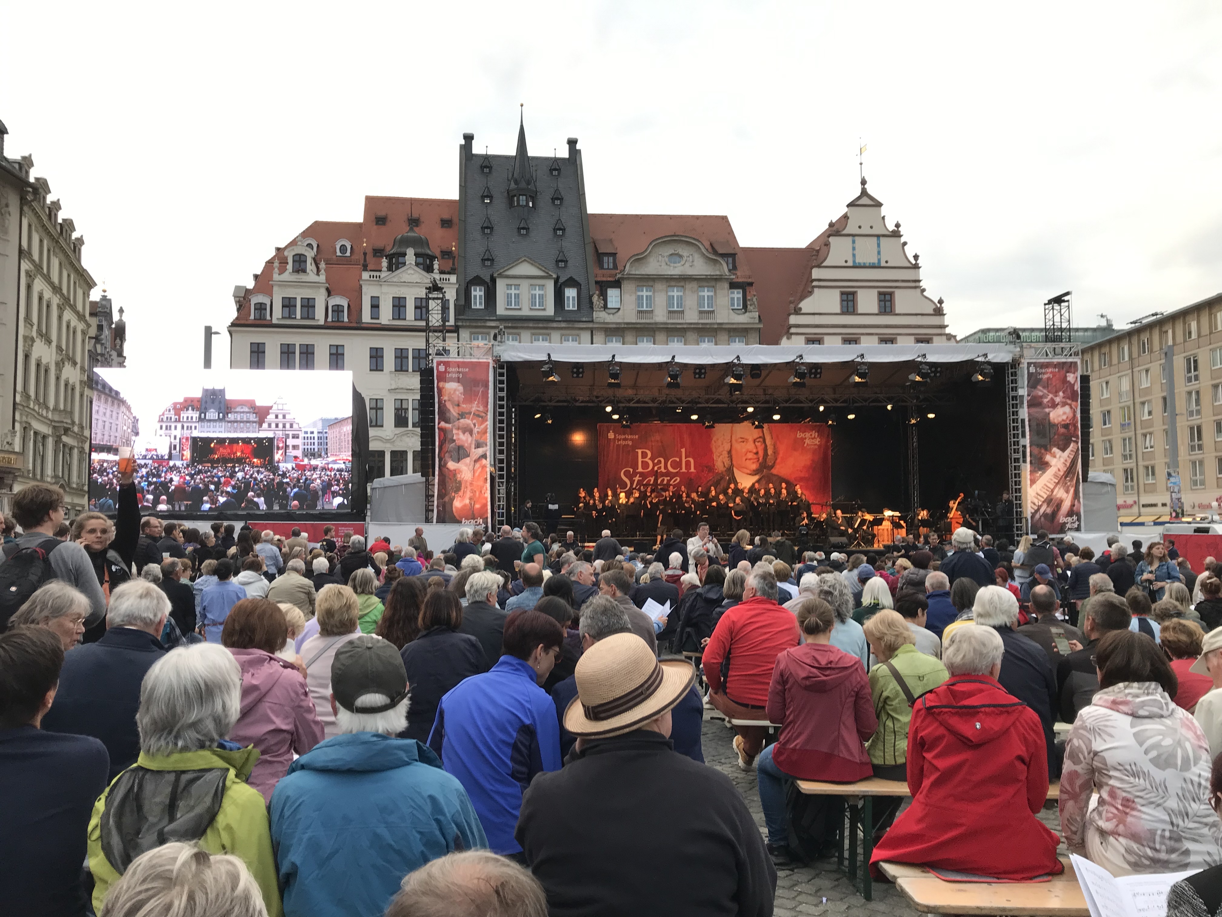 We had thought to do some shopping on this street but found out it was a good place for hip places to eat or drink but not really to shop. So we returned to our hotel for a short nap and had an early dinner at Gao, that attracted a full crowd on a Saturday night. We then walked to the Markt for the Bach Fest. This time we sat on the ground in front of the podium. Halfway the first performance someone left just behind me and I could take his seat on the front bench. We really loved the jazz interpretation of Bach’s work by the LeipJazzig Orkester in combination with a choir from Paraguay. They also performed two songs from Paraguay, the whole performance was incredible, and the audience was invited to sing along during the encore. The Big band interpretation of Bach did not really impress us that much and we decided to call it a night.
