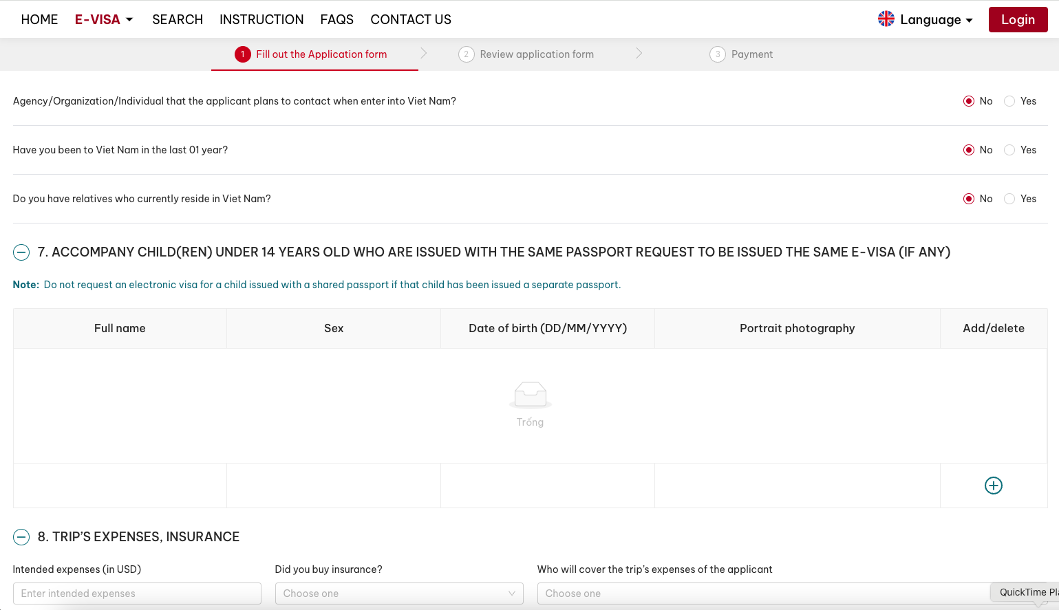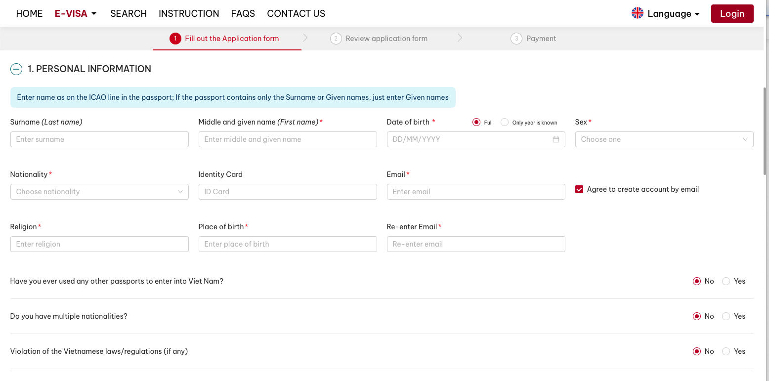 You then fill in all your details, surname and name (as on your passport, so if your middle name is also mentioned on your passport also fill it in on the form!). Further: sex, date of birth, place of birth, nationality, religion and e-mail. (check the box agree to create account by e-mail, so you can follow up on the status of your application) ( you can also fill in ‘none’ for religion). You then request a single or multiple entry visa and fill out the dates to enter and leave Vietnam (take the possible first en last date within a period of 90 days you wish to be in Vietnam), Passport number, place of issue, date of issue, expiry date. Permanent residential address (home address that matches your passport) and emergency contact. Occupation can be mentioned but is not obligatory. Purpose of entry (tourism), length of stay: put in long enough just in case you have a delayed flight or another unforeseen event), intended date of entry, telephone and residential address in Vietnam (telephone, name and address of the first hotel you plan to stay, city, district, and commune), Intended border gate of entry and exit (= airport of arrival or border crossing). If you have been to Vietnam earlier in the same year, fill in the dates of your stay and purpose. You only have to fill in the the fields marked with a red asterix.