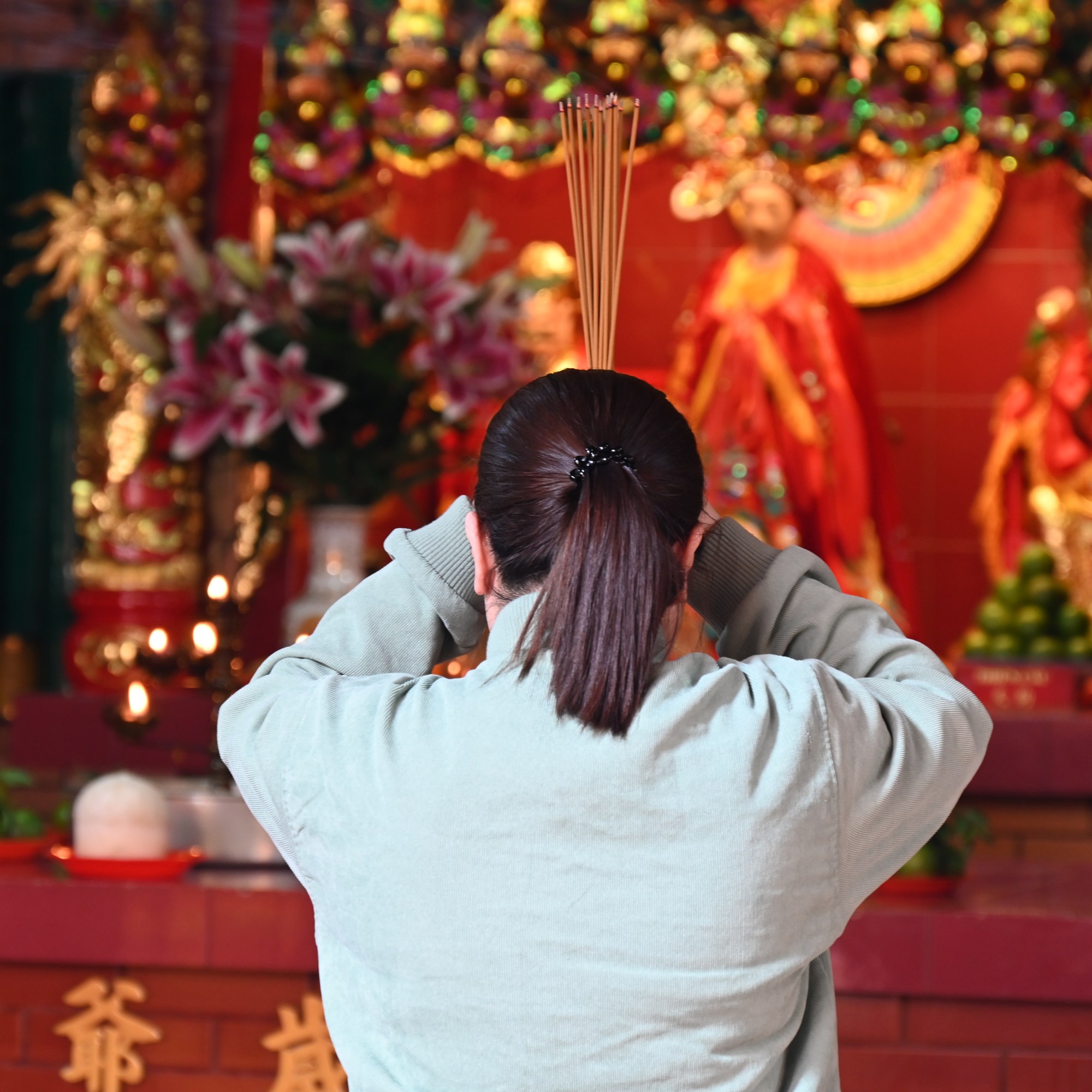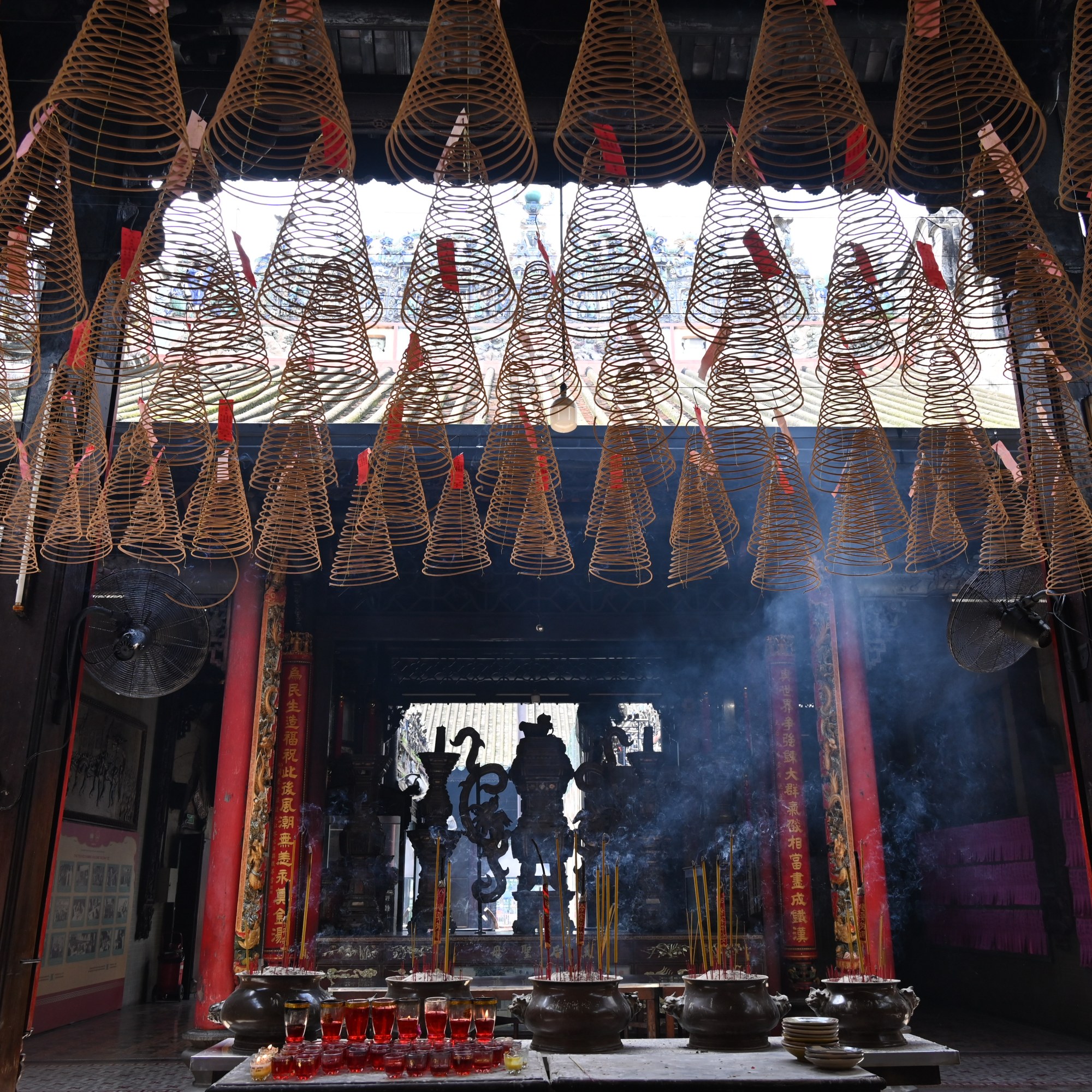 We were dropped by our Grab ride in front of Thien Hau Temple, without a doubt the most famous temple of Cholon. The temple like many other temples here venerate Mazu, goddess of the sea and protector of seafarers and fisherfolk. Mazu worship is common among pre-modern diasporic Chinese communities—migrants prayed for safe passage through treacherous waters and built temples in het honor after establishing themselves abroad. Impressive are the huge spiral incense coils burning while dangling from the ceiling. Pink slips with good luck wishes hang on the walls. The wooden carved Mazu statue is said to be even older than the temple which was founded in 1760.
