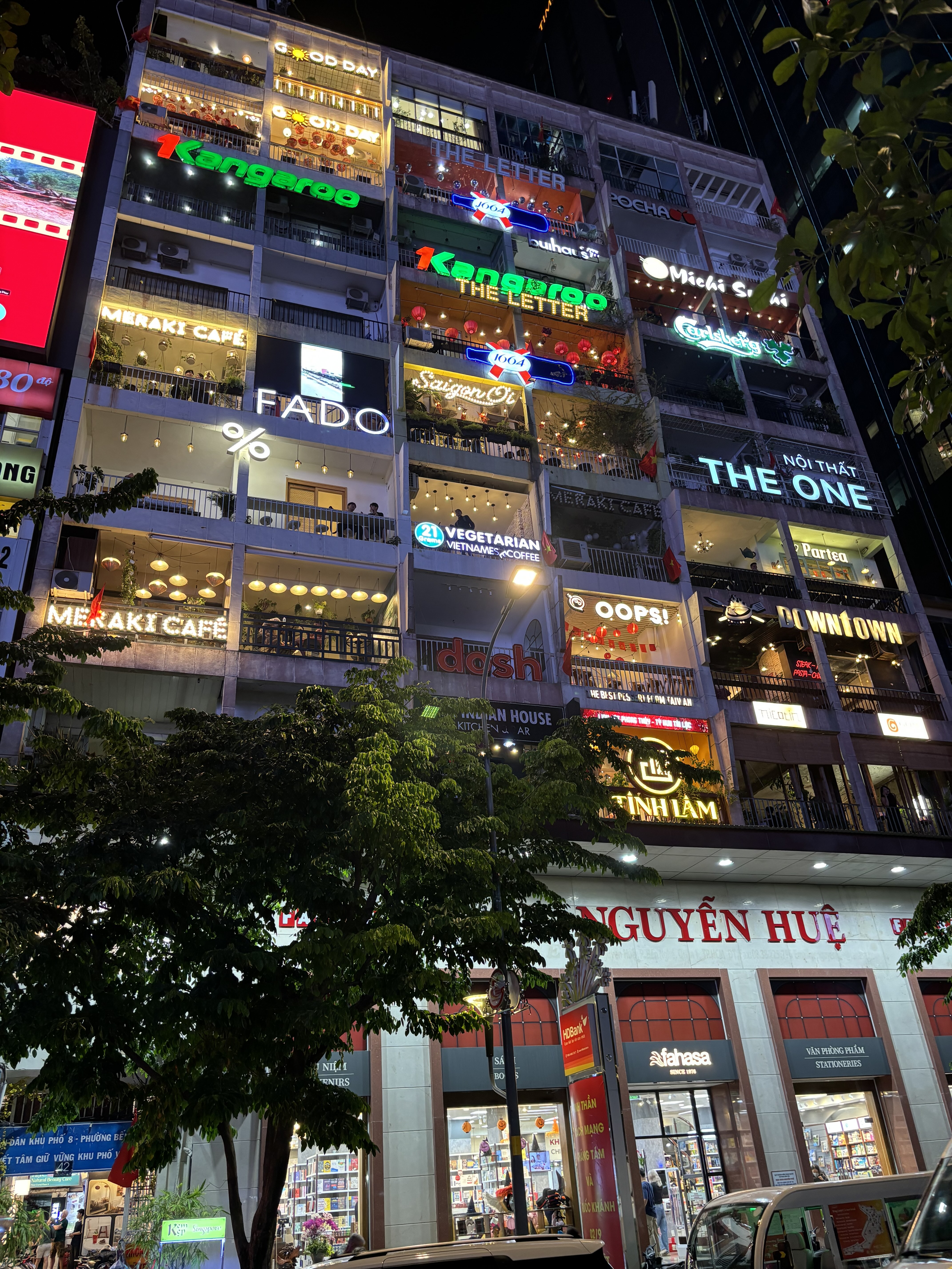 We continued down the wide Nguyen Hue street to number 42 known as one of the Café Appartements, constructed in the sixties, a nine stories appartement block that today houses a vibrant array of independent cafes, workshops, boutique fashion stores, and co-working spaces. You can access it through number 42, just left of the bookstore, and either use the staircase or the lift for 3000 dong.