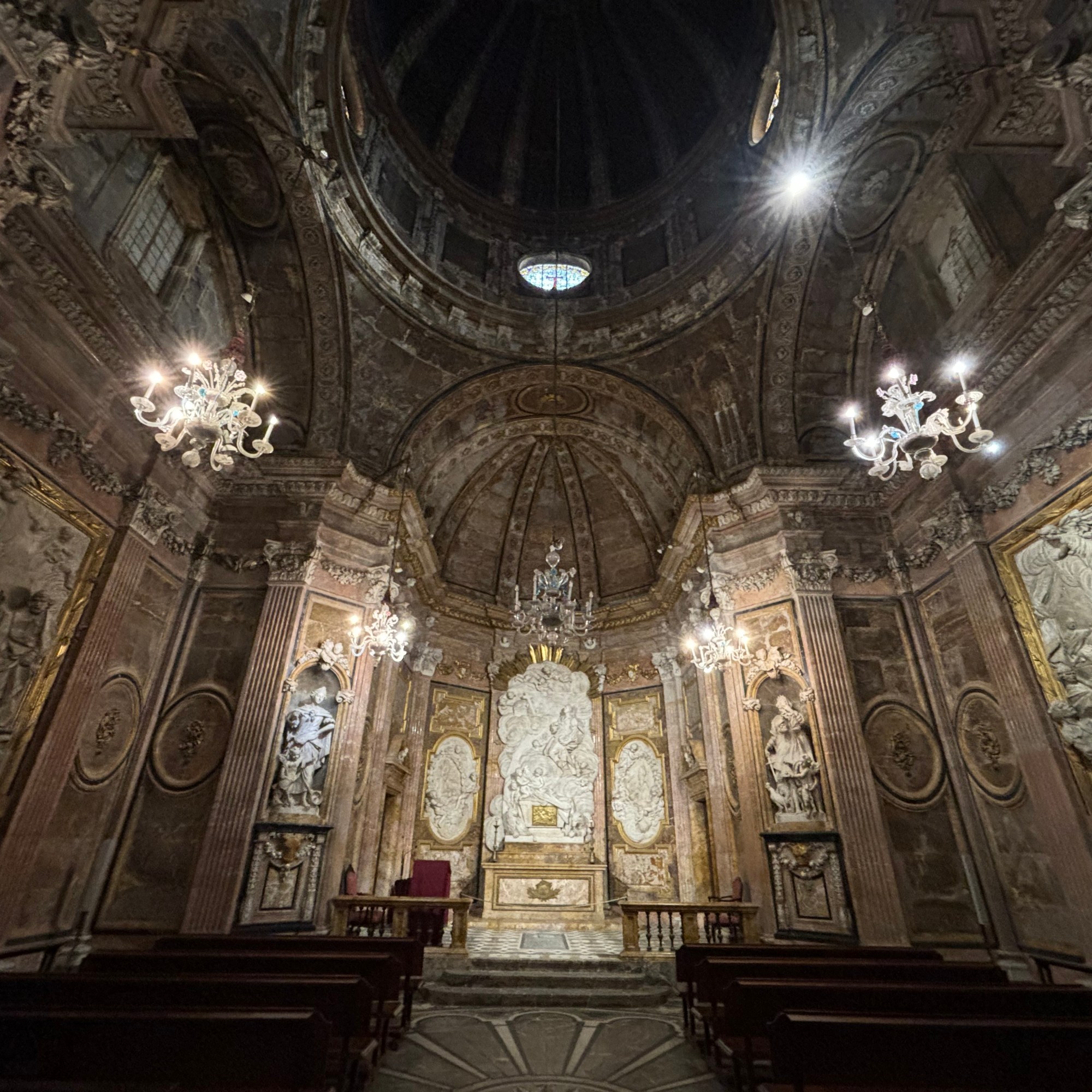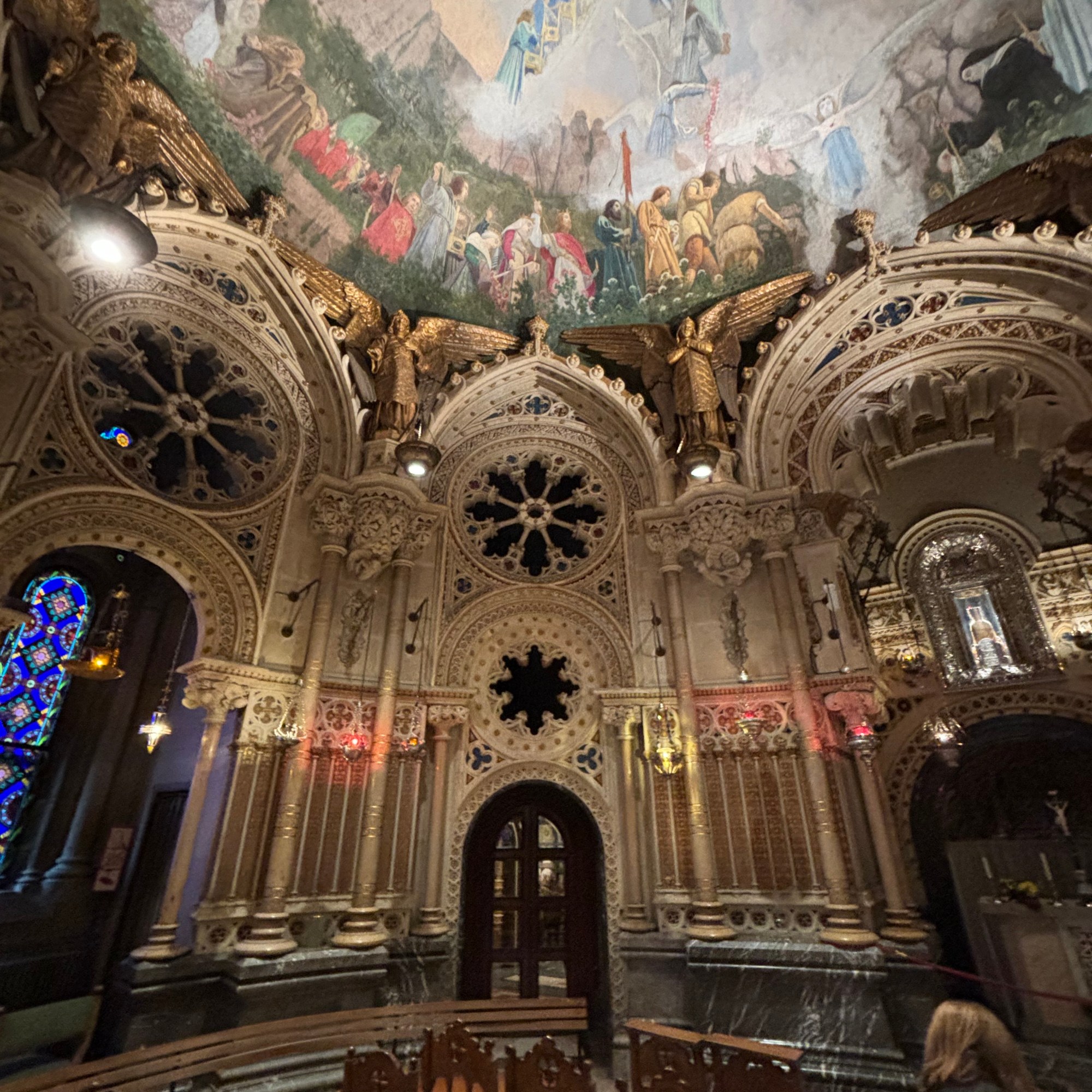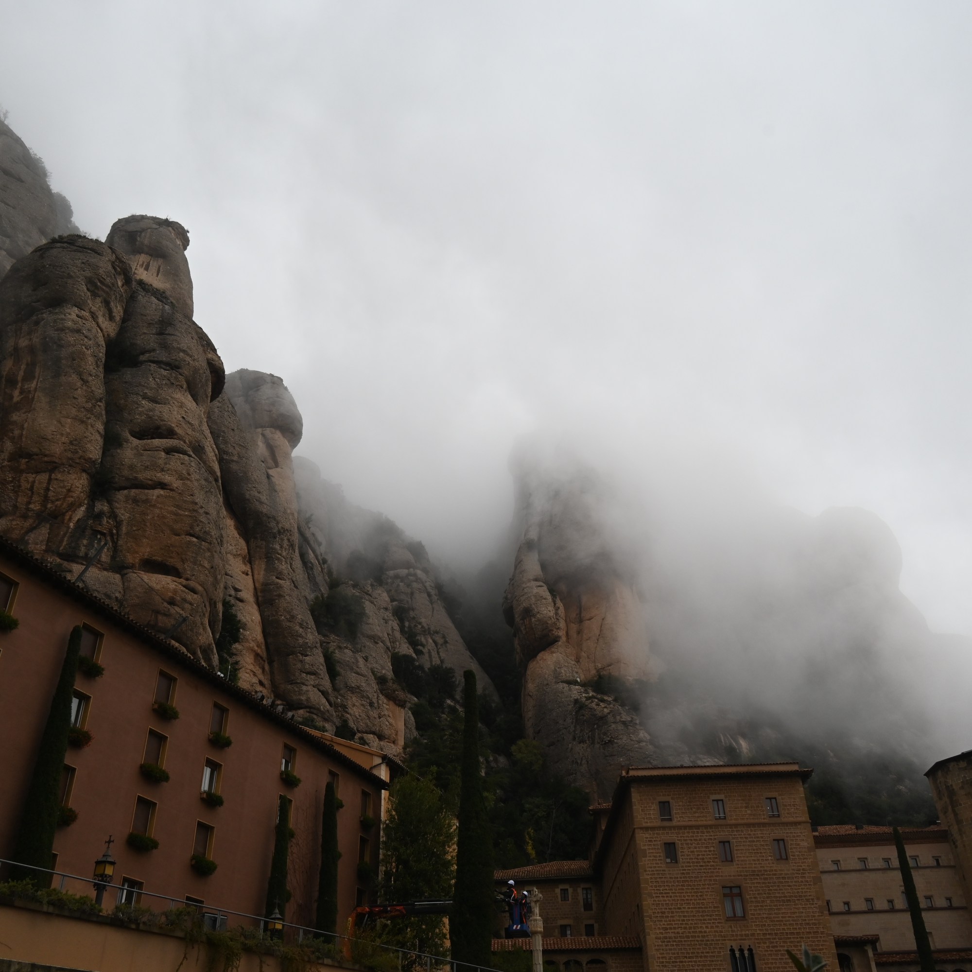 We then continued to the Benedictine abbey Santa Maria of Montserrat. It was unfortunately a very cloudy and misty day, and the natural surroundings were shrouded in mist. We had planned to go hiking after visiting the monastery, but decided against it. Just before driving up to the monastery there is a sign that shows if there are free parking spots in front of the monastery. It was a Monday in November and there were still a lot of free places to park at the monastery, so we drove up. Luckily I had not yet bought tickets for the funicular train that can be taken from the large parking area below the monastery in Monistrol. Just when we were to enter the monastery, the clouds receded for just a few minutes showing the impressive Montserrat mountains behind it. It was almost like a miracle. The monastery was founded in 1025 but was rebuilt in the 19th and 20th century. We had bought tickets in advance for the Virgin and the basilica. You get a time slot to visit the black Virgin, via an entrance on the right side of the basilica. You cannot stand still in the Virgin’s shrine, everyone has to pass it and continue. The virgin is kept behind glass, only her hand holding a globe can be touched for good luck. There is a beautiful chapel behind the Virgin’s shrine. You then visit the basilica which is sumptuously decorated. We did not book a ticket for the famous boy’s choir so I have no idea if it is worth it.