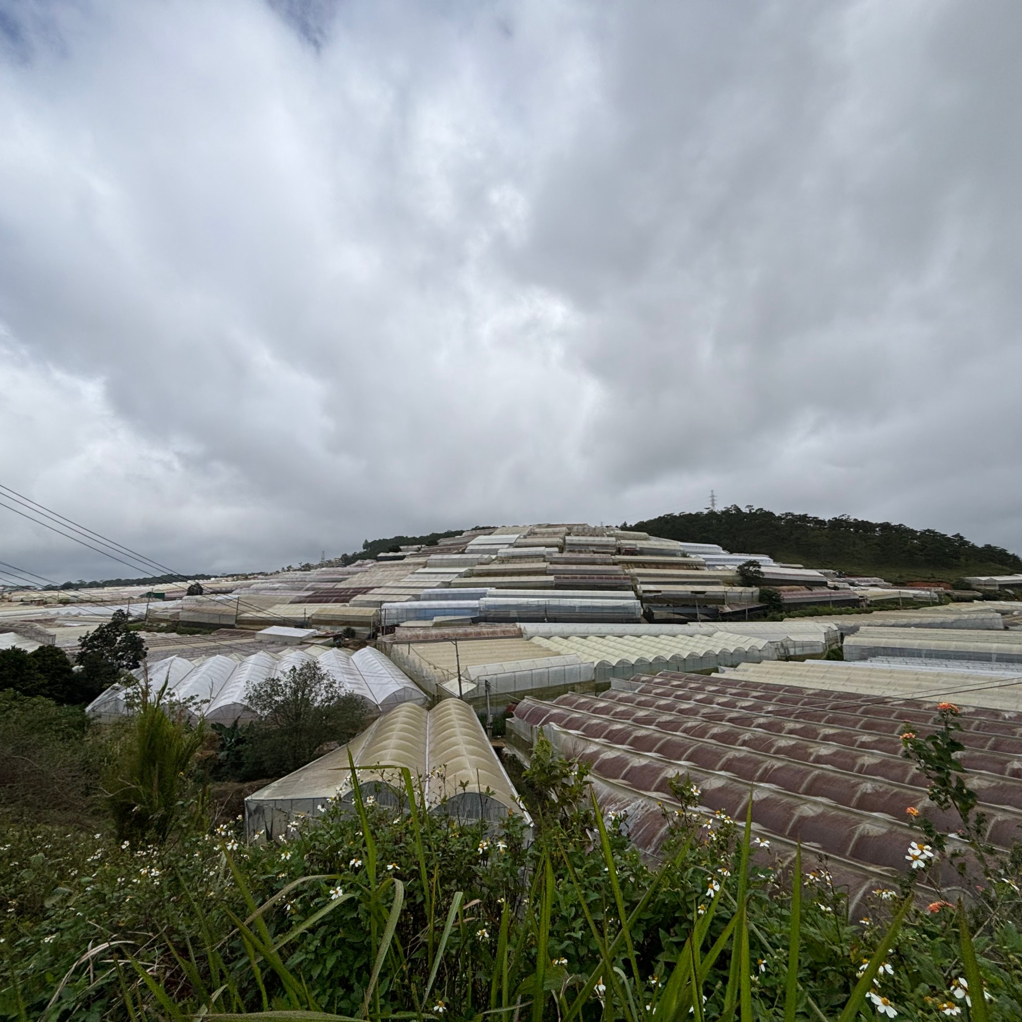 When leaving Da Lat we passed a hill covered with graves. The first part of the National Route 27C consists of hills all covered with pine forests, quite unusual for Vietnam. Then you pass kilometers and kilometers of plastic green houses where vegetables, flowers and strawberries are grown. We stopped to taste some, but didn’t buy any, they didn’t look very good and did not taste that good especially compared to what we are used to. We will eat them when we are back in Belgium!