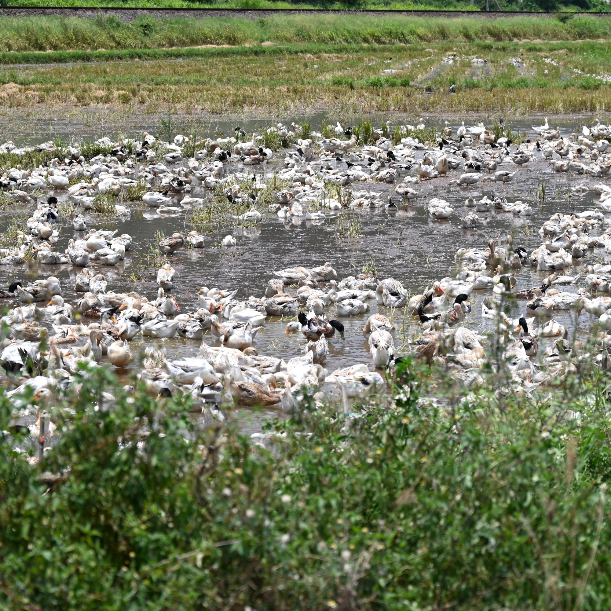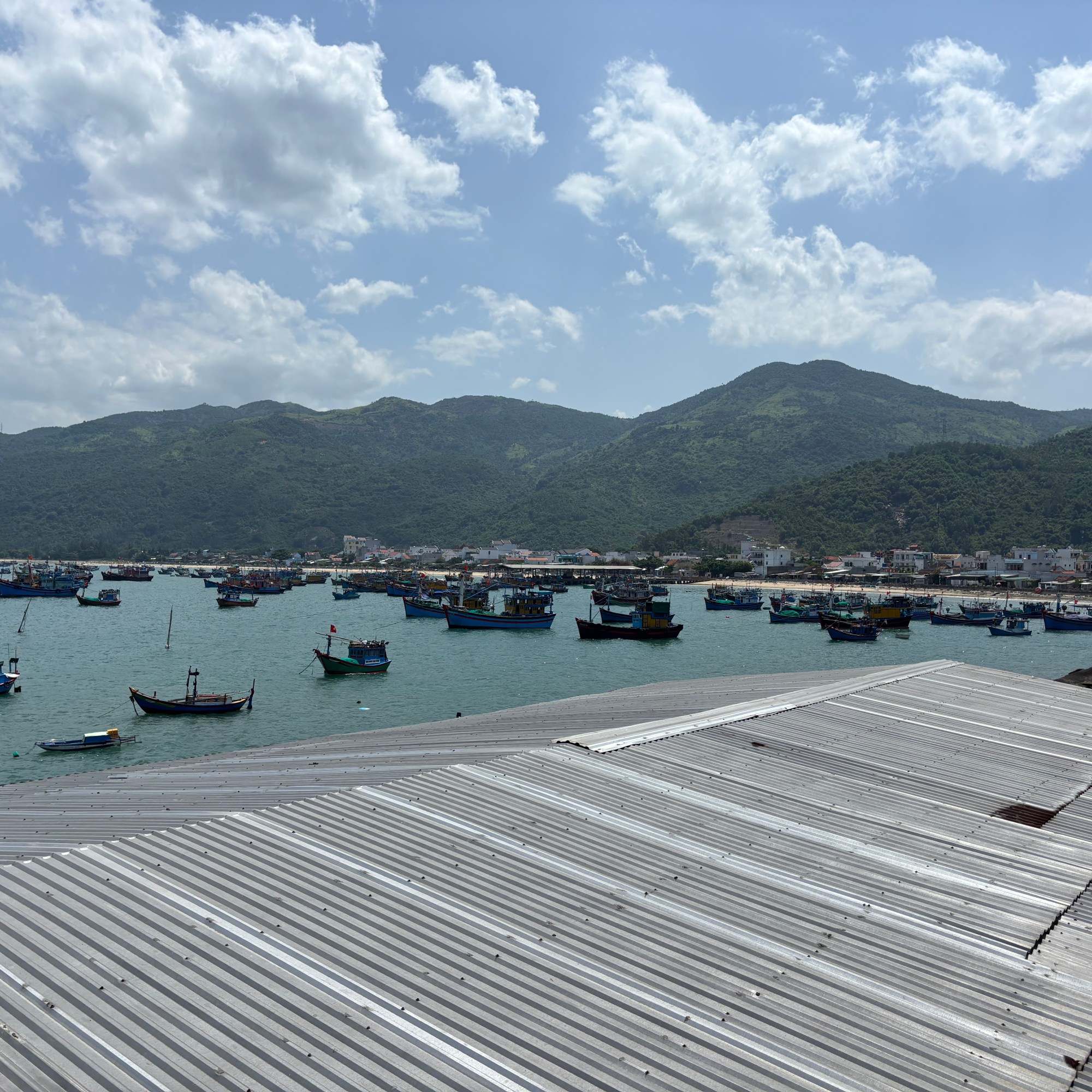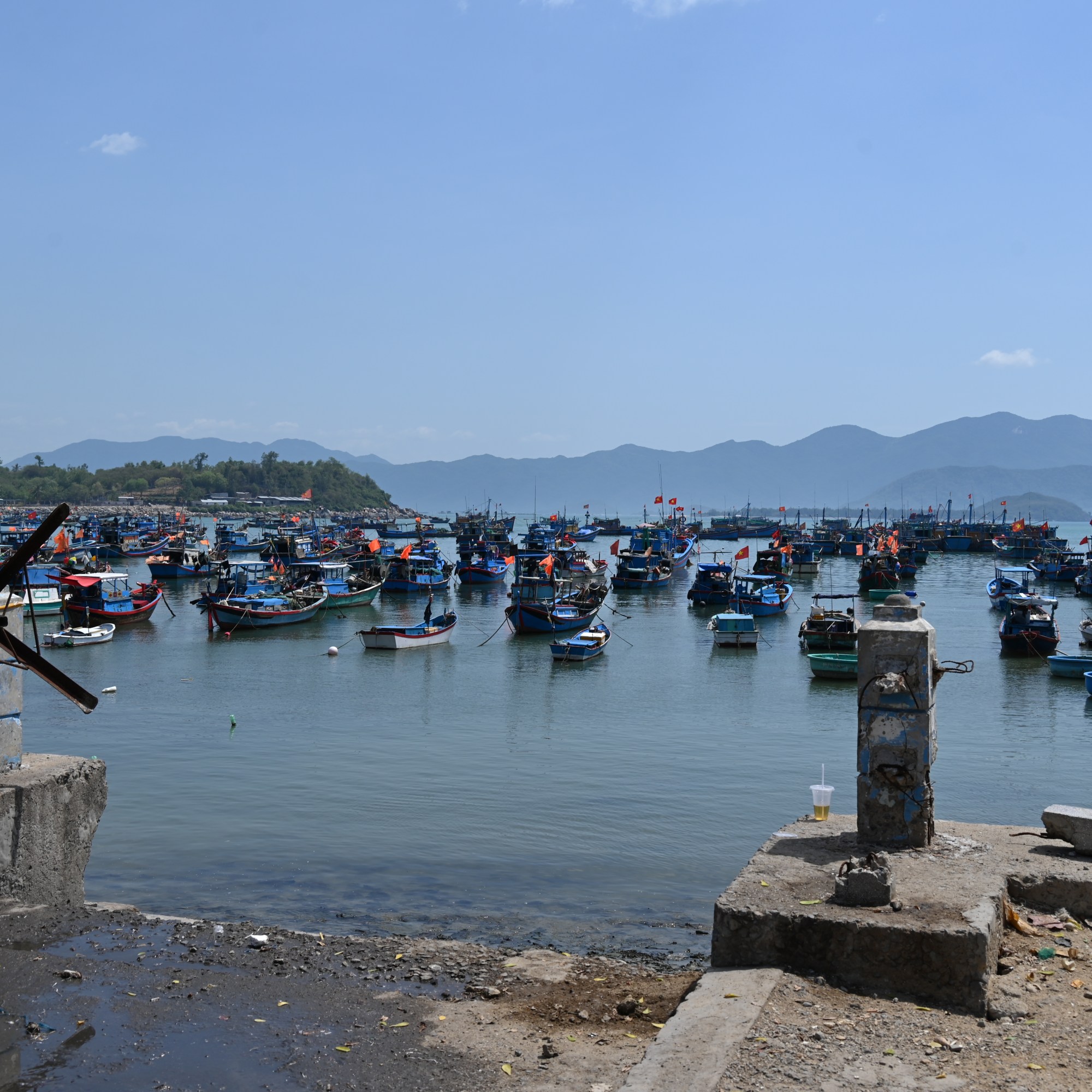 The first hour we mainly drove on highway one, on our way to the fishing village of Dai Lanh, somewhere halfway between Nha Trang and Tuy Hoa. We made an extra stop to drink something. Just before Dai Lanh we got of Highway one and made a stop at a pristine beach. In Dai Lanh we stopped for lunch, while enjoying the beautiful view of the bay filled with fishing boats. We had a large plate of fried noodles with fresh seafood. We passed several duck farms, where ducks were packed in small pools, not very attractive.