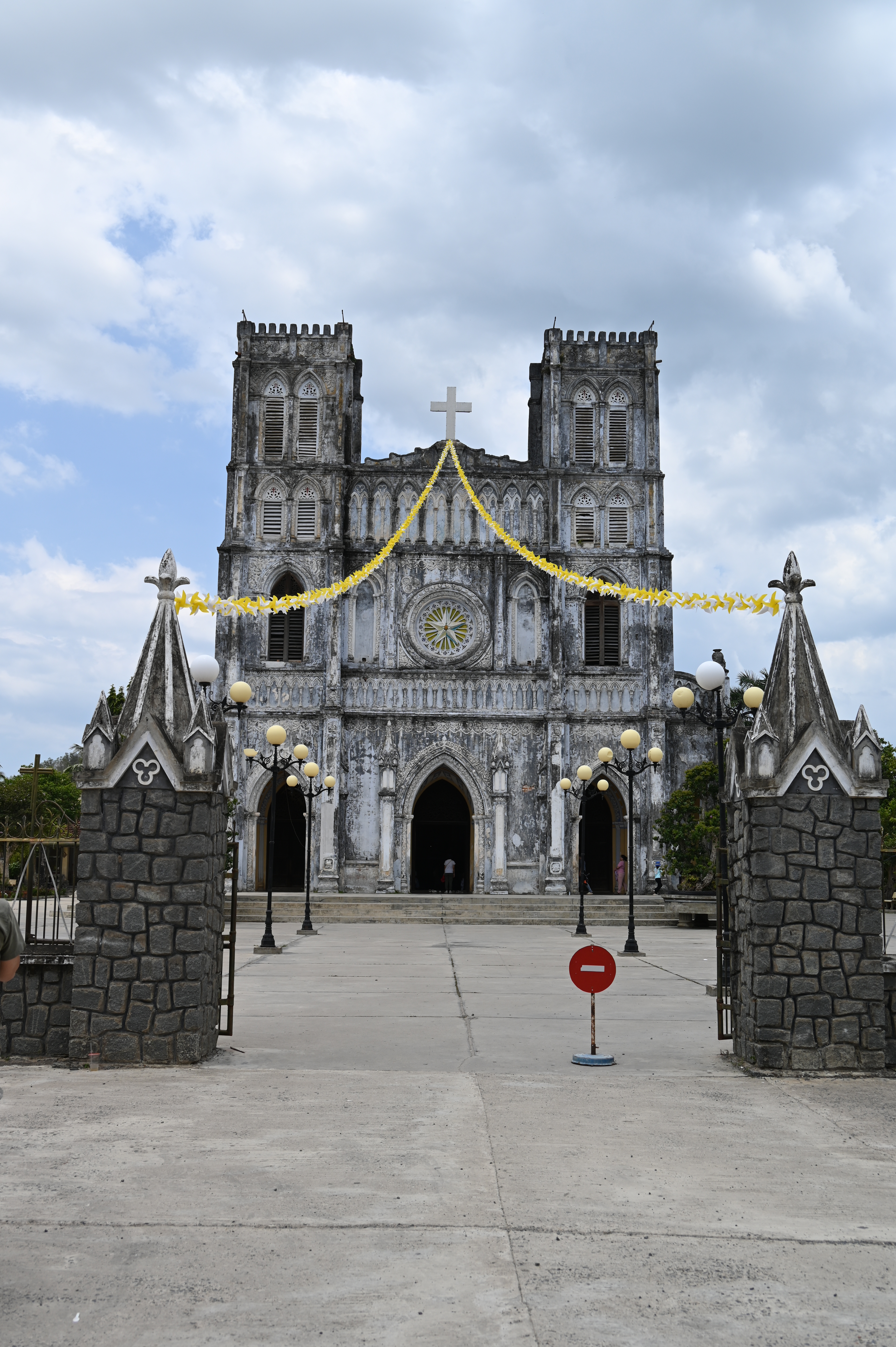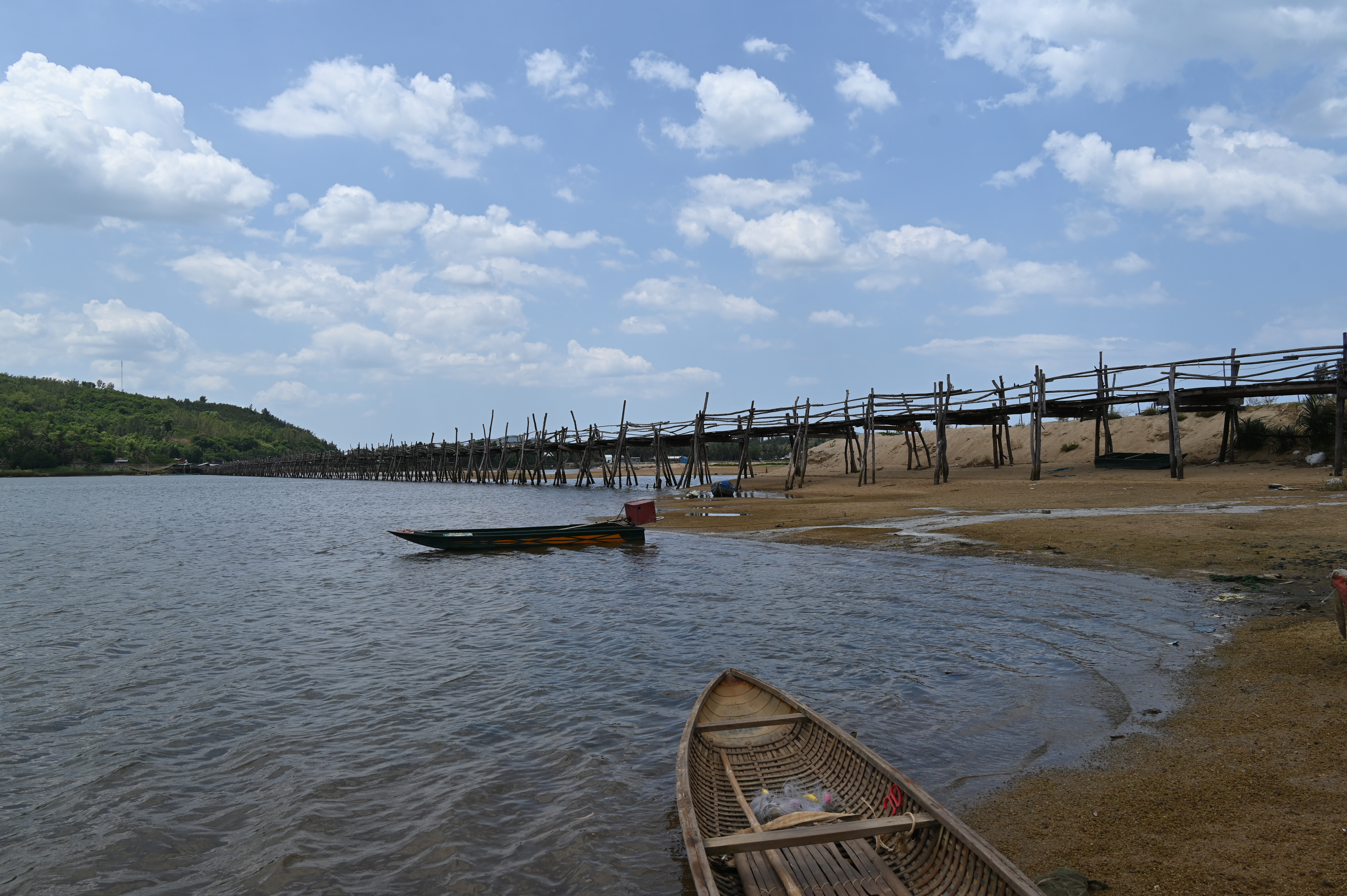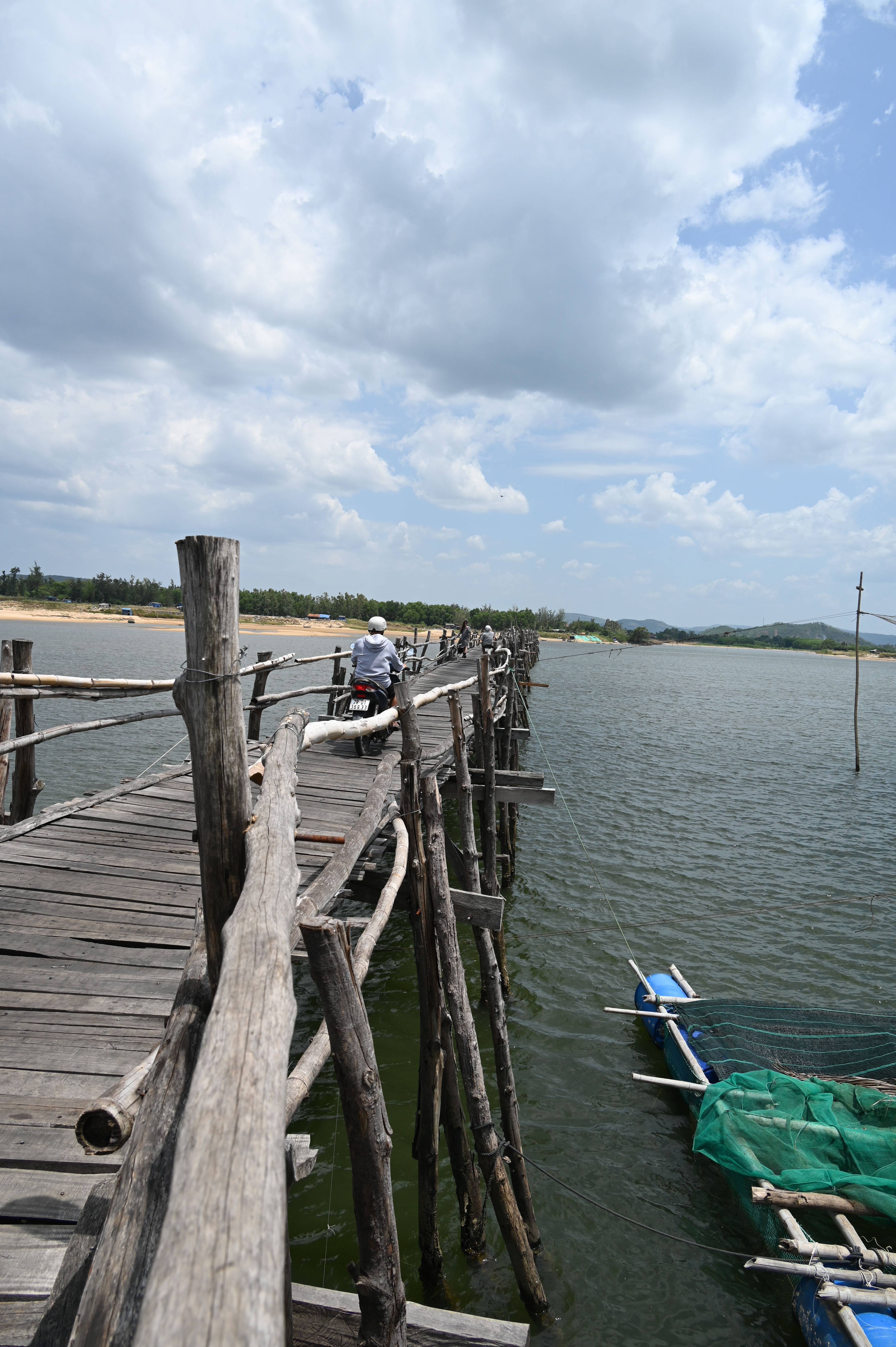 Our next stop was Mang Lang Church, the oldest church in Phu Yen and one of the oldest churches of Vietnam, built in 1892 by a French missionary in neo-gothic style with next to the church a small chapel built in a fake grotto. The church is famous because this is where the first cathechismus was printed in Vietnam and it is the hometown of the first martyr, so a place of pelgrimage. We then continued towards the longest wooden pedestrian and bike bridge of Vietnam, Ong Cop bridge, 800 m long and only 1,5 m wide. It was a perfect shortcut on our way back to Tuy Hoa and so we crossed it with our motorbike, which costed us 6000 dong (0,20 euro)