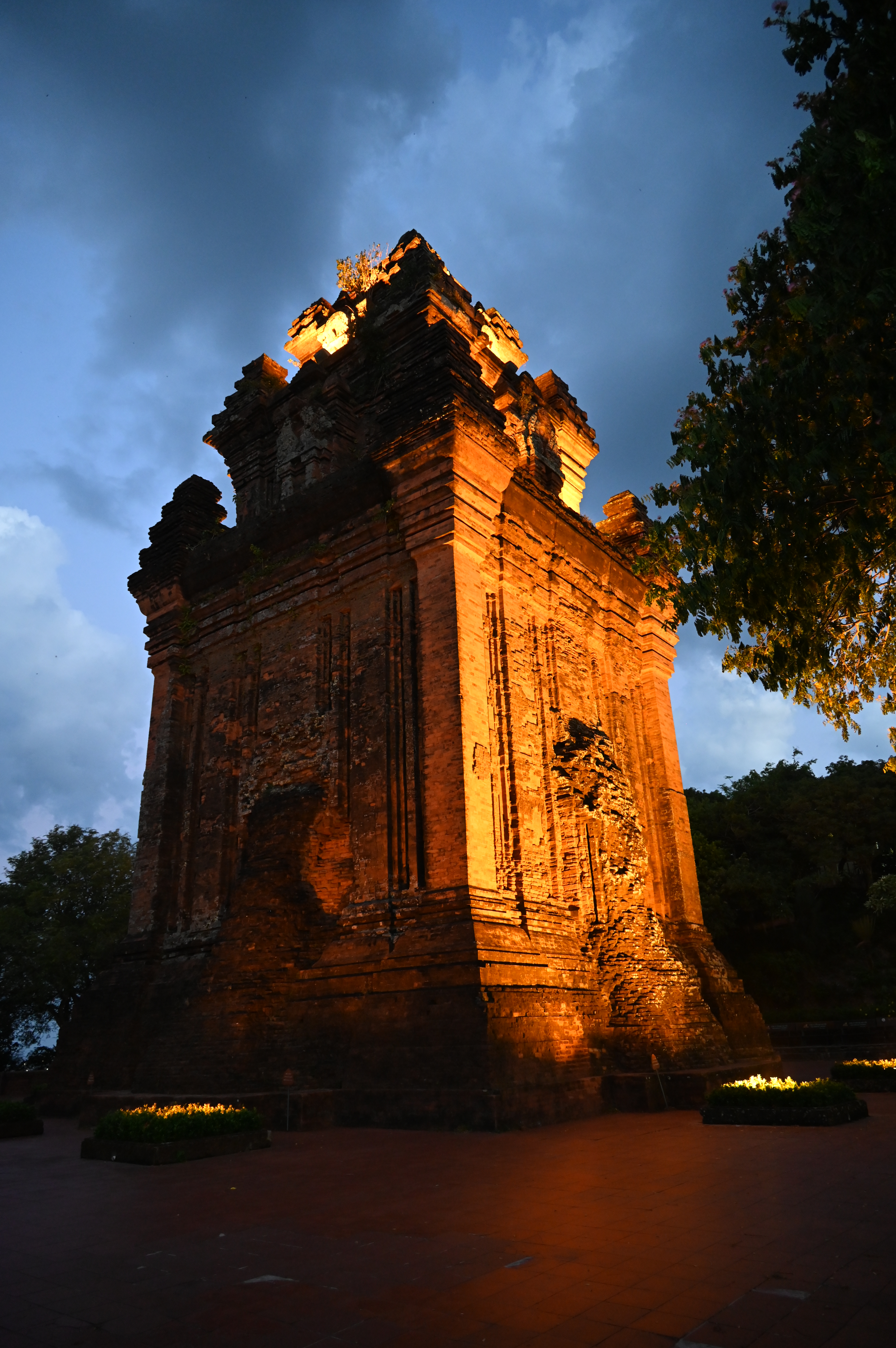 We stopped for another drink, and bought som banana fritters (0,15 euro) at a roadside stall. Just before sunset we drove to the Nhan Cham temple. It is located on a hill overlooking Tuy Hoa town, and we came up to see the sunset, and see the tower lighted after dark. We were the only ones looking at the sunset, all the Vietnamese tourists were all dressed up, some of them in Ao Dai’s and were taking photo’s of each other or selfies, ignoring the beautiful natural spectacle around the temple. Once it became dark the temple was beautifully lit and we were almost all alone.