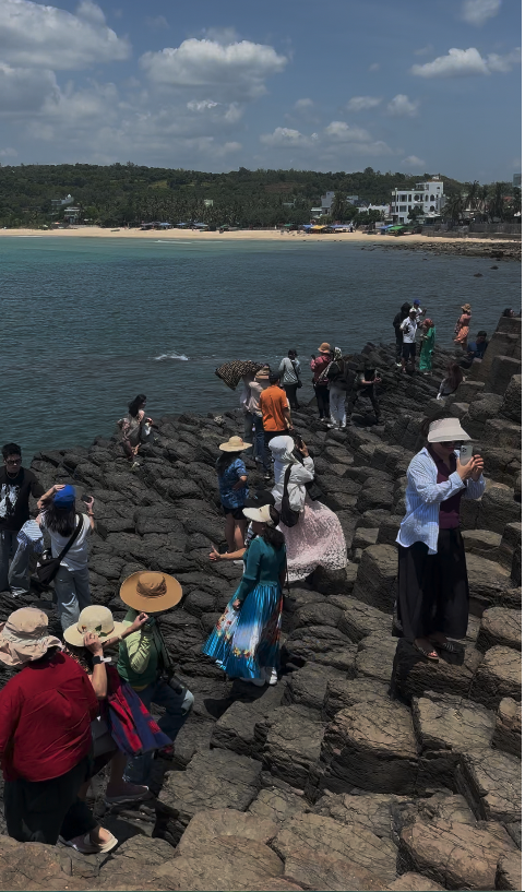 On our in between day in Tuy Hoa we drove up 1 hour North along small villages and many ricefields to Da Dai beach where we were met with a frenzy of many busses, big groups, a parking full of motorbikes and sellers waving umbrellas and drinks in our face… we paid de entrance of 40000 dong and followed the stream of people inside past some horse riding and a large open air cafe where we had a much needed drink.