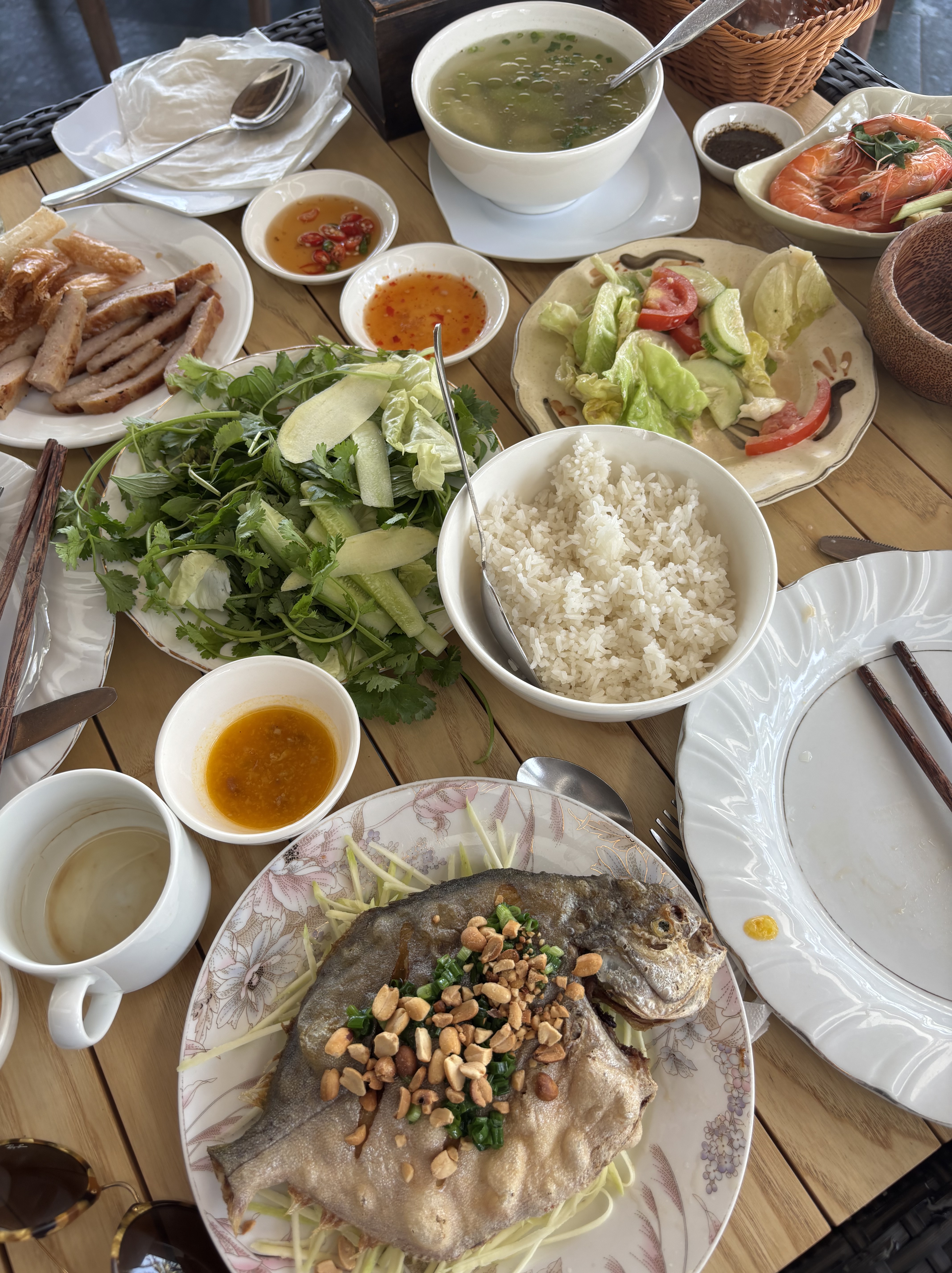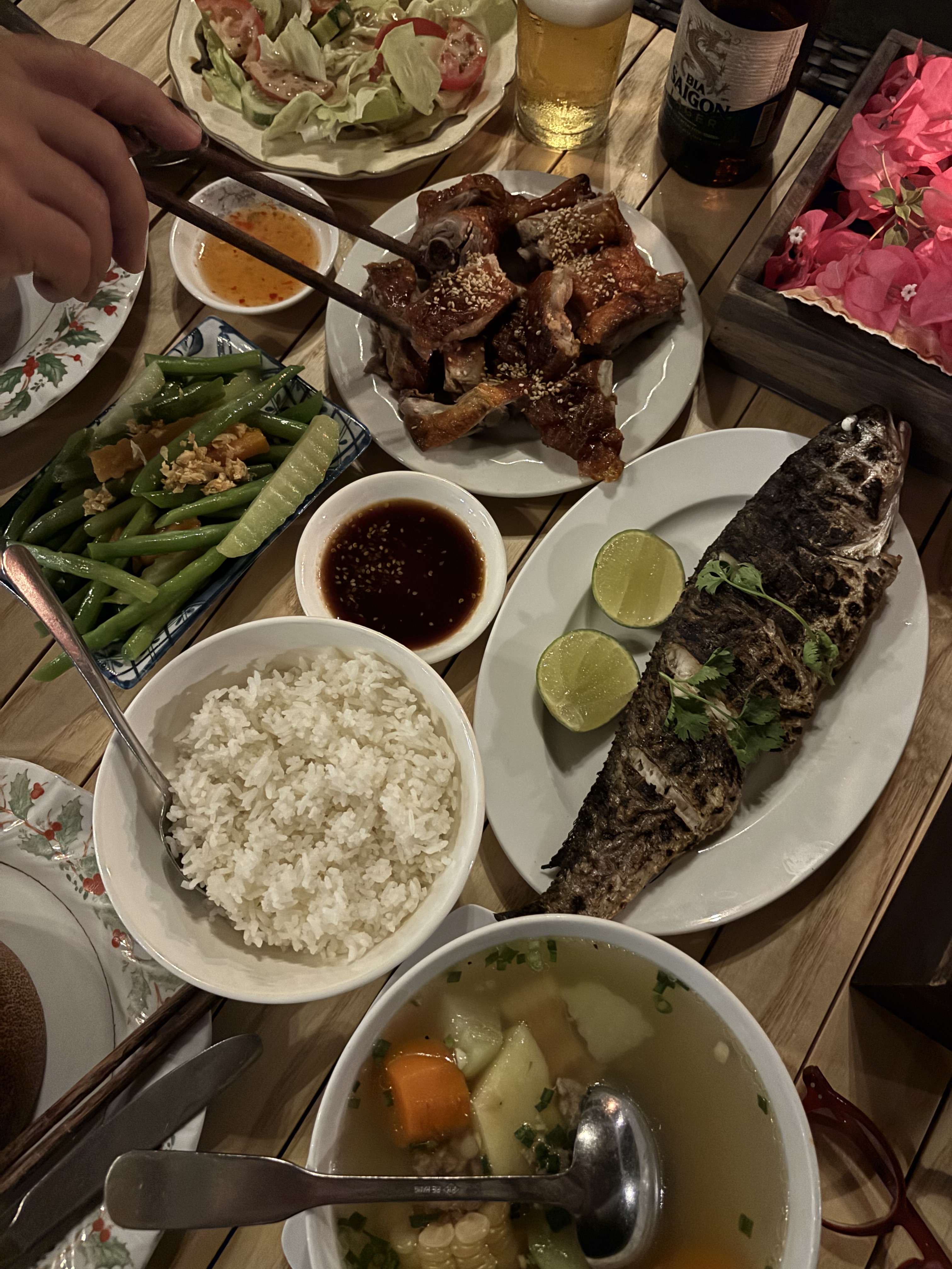 Dinner was again a wonderful choice of Vietnamese dishes, grilled fish, squid with vegetables, bbq chicken, oysters, rice, soup…