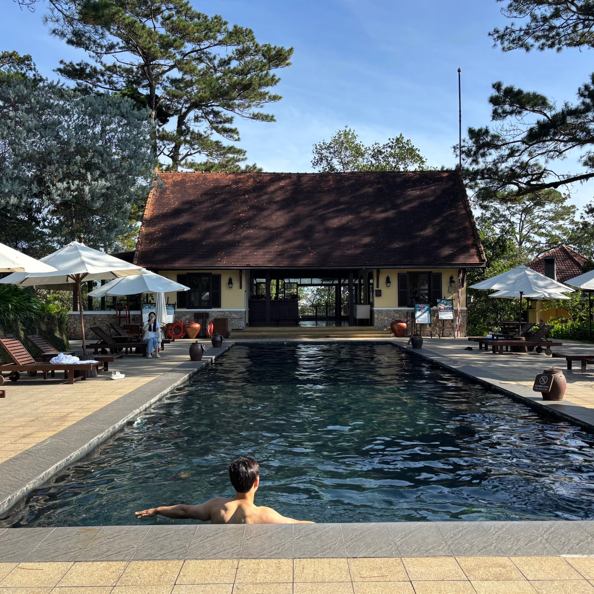 We spent the next day just enjoying the beautiful place we were staying in, swimming in the pool, walking along the villas of the resorts and enjoying the complementary afternoon tea. We had a long leisurely breakfast and learned a bit about the history of of the hotel from the resort manager. It was originally the spot where a French army officer, Jean O’Neil, built his house, He added a restaurant for the many military guests who came to stay at his house. Later he donated parts of the land to friends who built their own villa, often in the typical architectural style of where they were from in France which explains the difference in style between some of the villas. We are staying in the Farmers’ villa and the woman who spent the first five years of her life life here in Da Lat came to look for her childhood house a few years back and found it here, the Farmers’ villa. She brought a picture of the villa from the time she lived there and it still looks the same! Each villa is named after the occupation or vocation of some of its former owners.